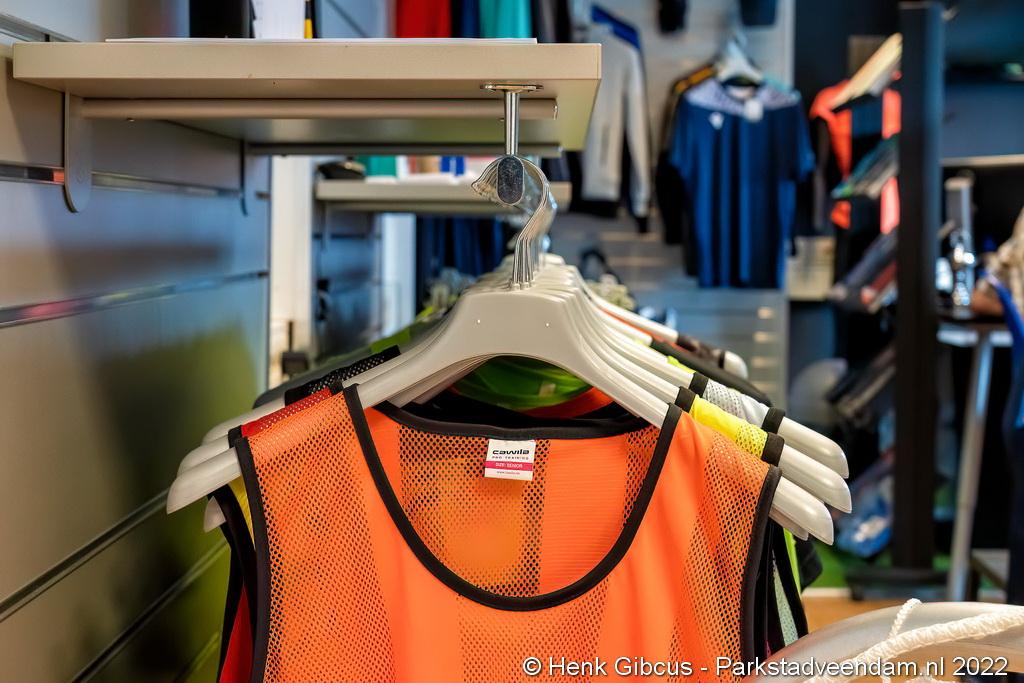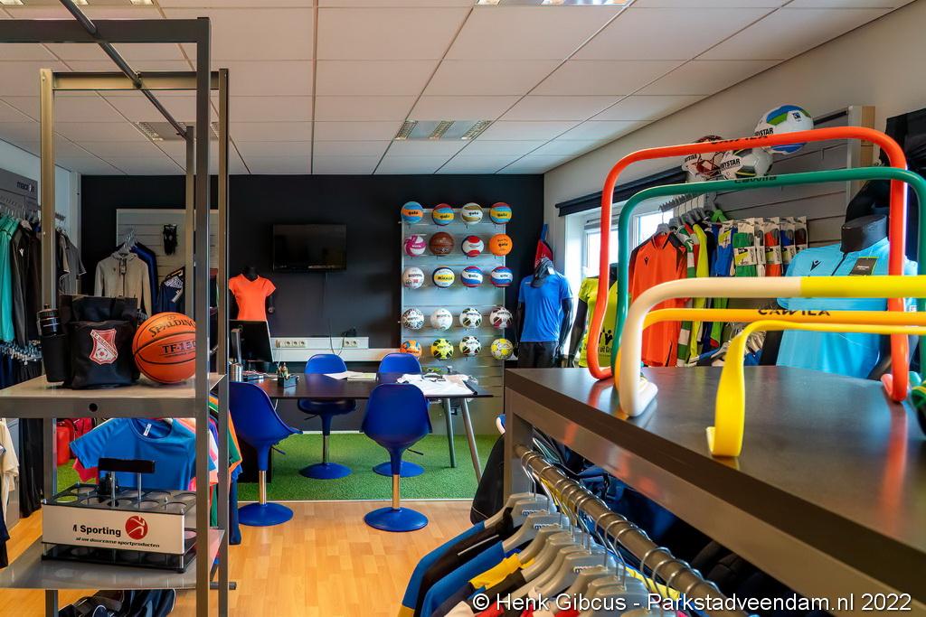 Dan naar de andere tak van EM Sporting|Bedrijfskleding. De trainingsmaterialen en -benodigdheden. In de showroom zien we scheidsrechter fluiten, pionnen, speedladders, foamrollers een doel en een tsjoek.  Dit laatste vraagt om enige uitleg. Het is een soort doeltje met een trampolinefunctie. De bal stuitert terug en de rebound kan beginnen.