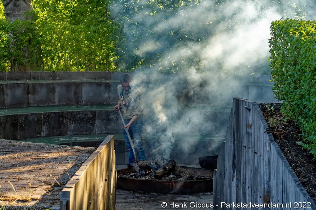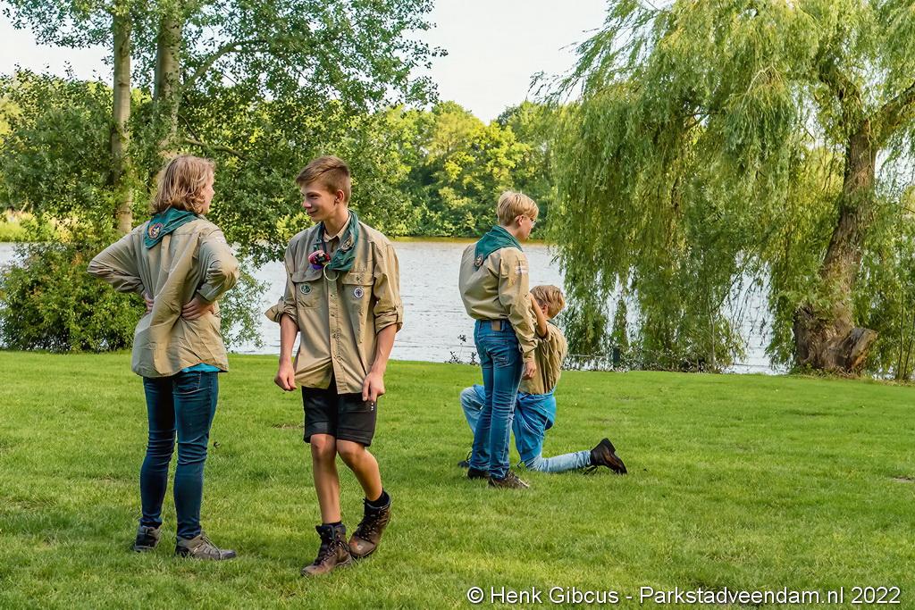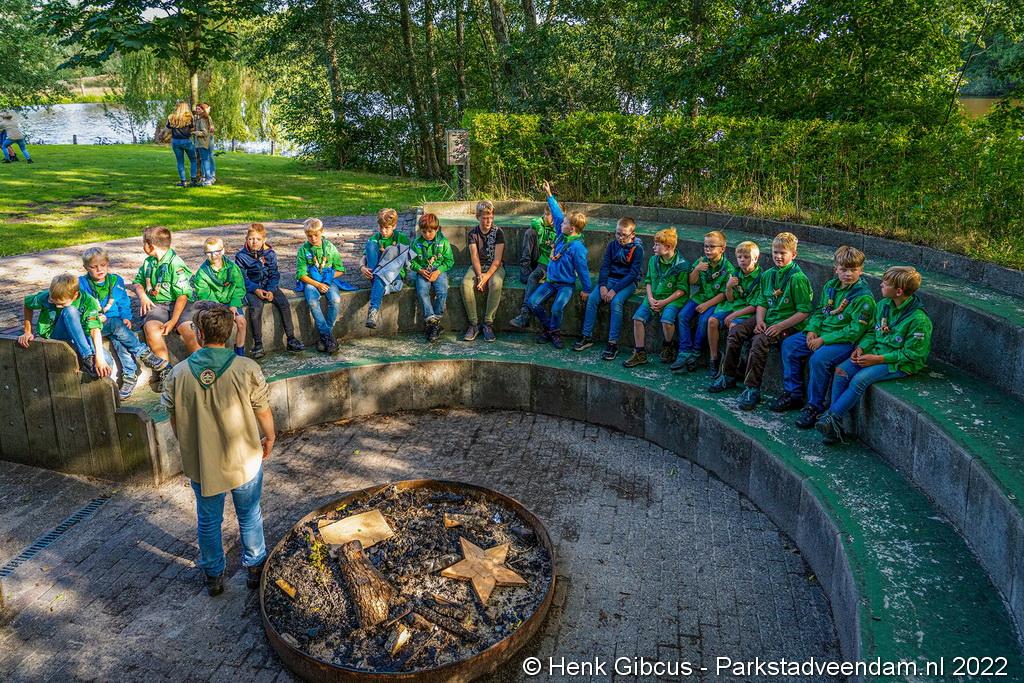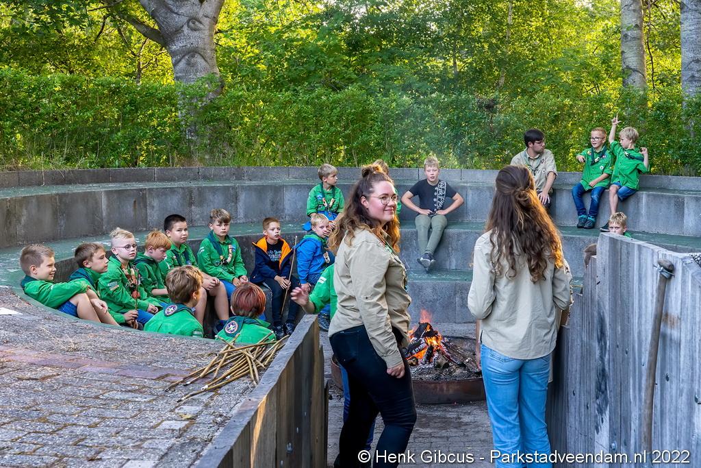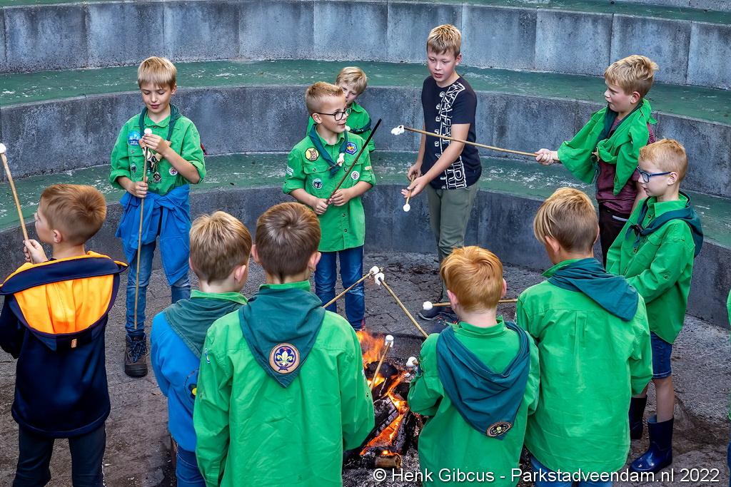 Lars, Harmen, Jesse en Alan hebben hun hike voltooid. Samen met de andere welpen van hun groep evalueren ze de tocht samen met hun begeleiders Reint, Xander en Lennard in de kampvuurkuil. Wat is goed gegaan en wat kon beter. De Marshmallows, die ze in het vuur mogen roosteren én opeten natuurlijk laten ze zich goed smaken. Wat resteert is het strijken van de vlag. Dit gaat net zo plechtig als het hijsen.