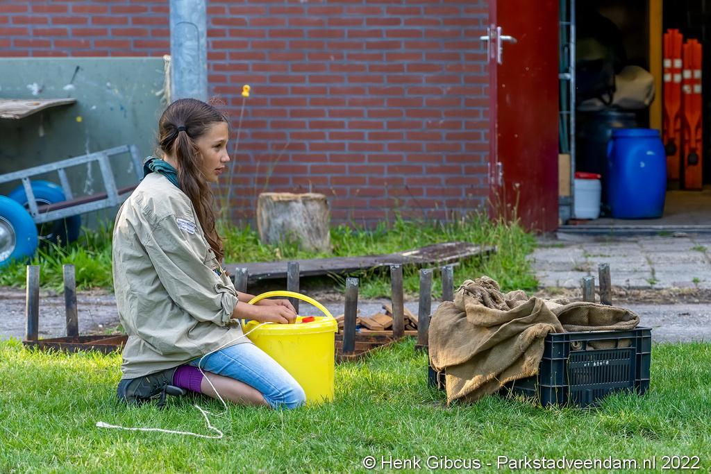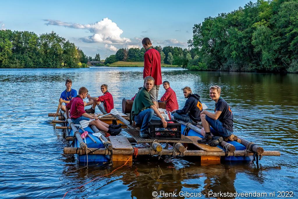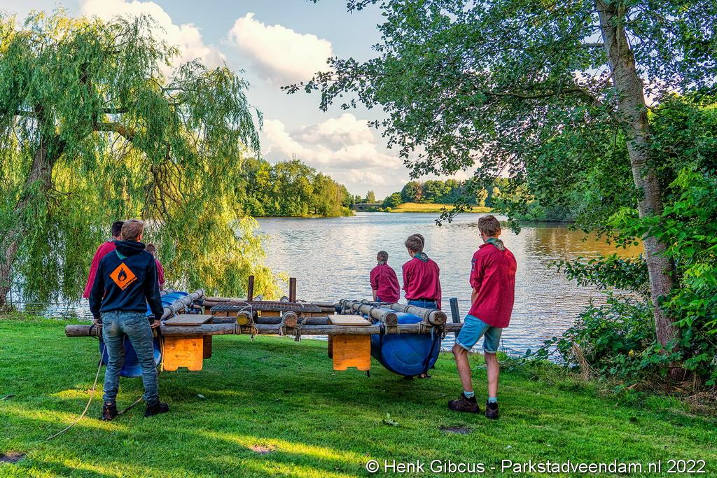 De Explorers vermaken zich vandaag met het bouwen van een vlot. Daarna mét een vuurkorf het water op. Berjan, al 12 jaar lid van de Scouting Veendam, vindt het prachtig. De gezelligheid en het samendoen spreekt hem het meeste aan.
