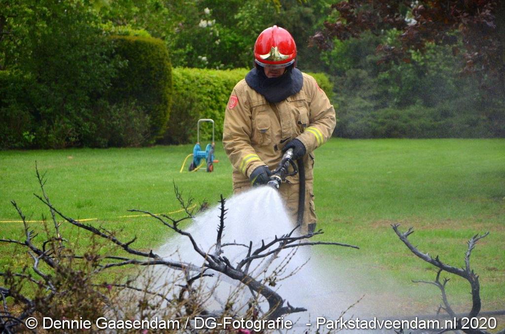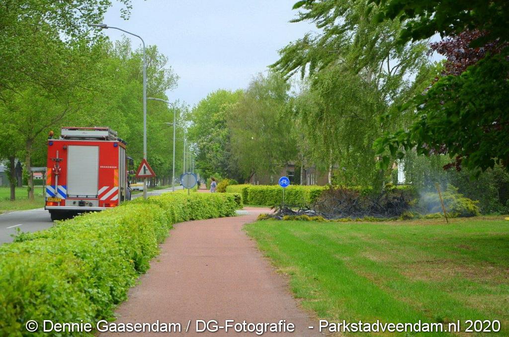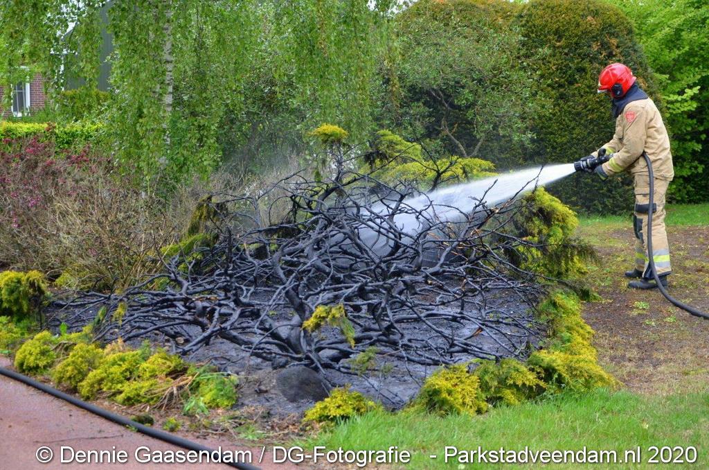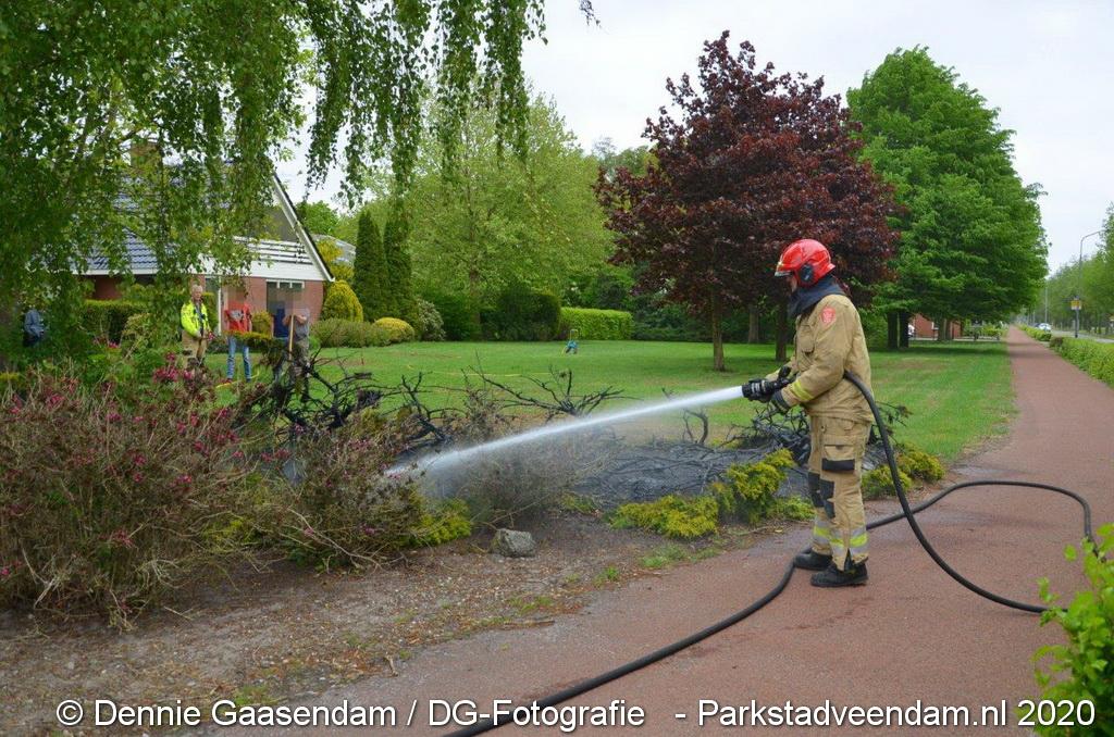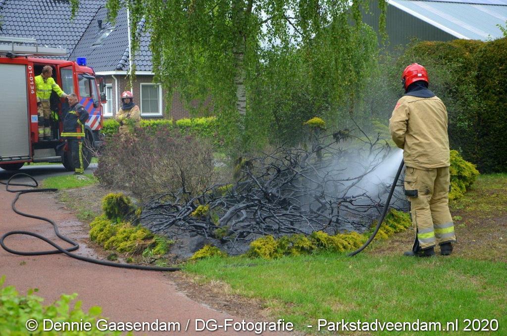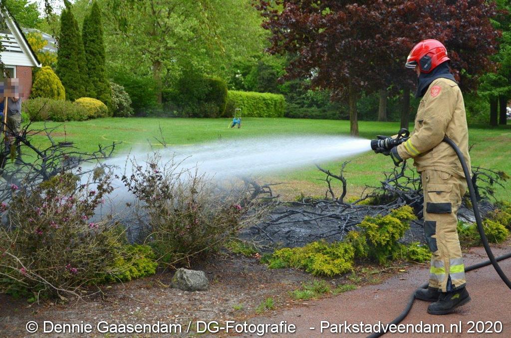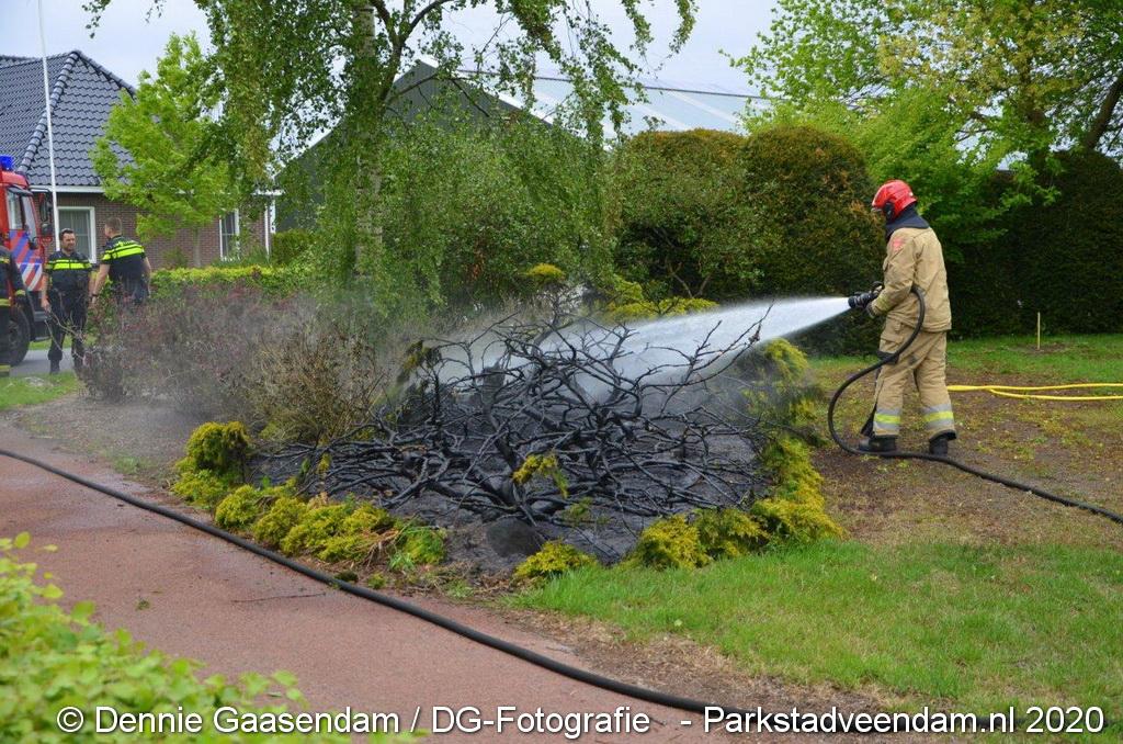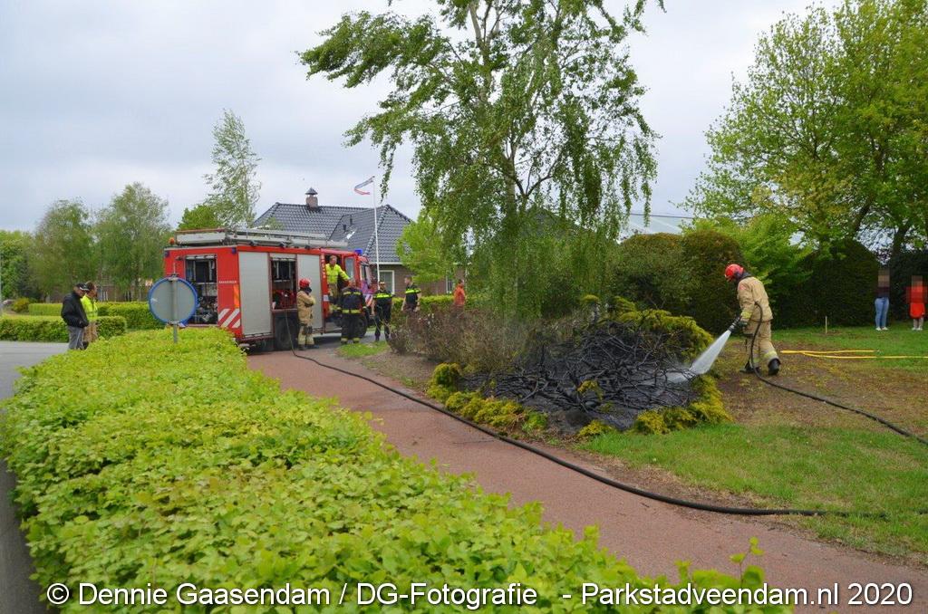 Zondagmiddag is brand ontstaan in een voortuin in Ommelanderwijk, Veendam. Na het uitbreken van de brand heeft de bewoner zelf al grotendeels de brand kunnen blussen met een tuinslang.