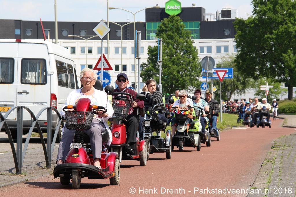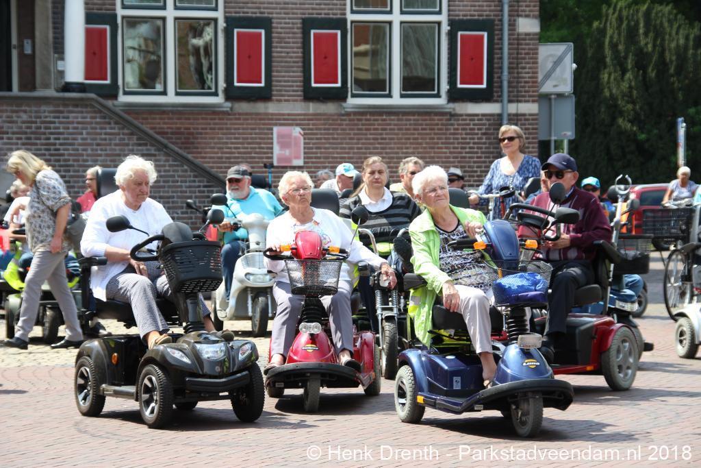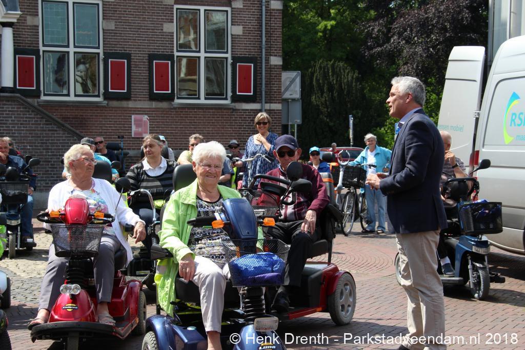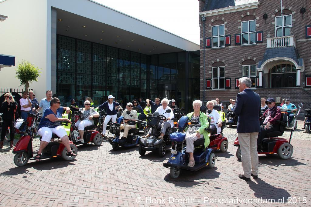 Woensdagmiddag was vanaf een zonovergoten Raadhuisplein de scootmobieltocht van start gegaan. Dit jaar werd door wethouder Jaap Velema aan 41 deelnemers het startsein gegeven.