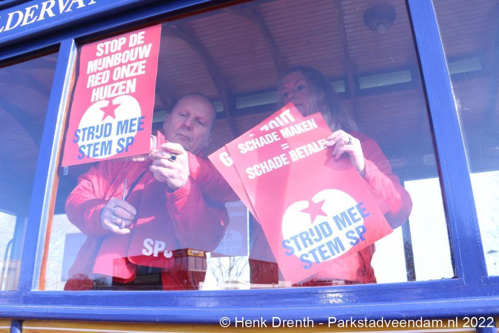 De tram was bomvol met affisches en flyermateriaal en met vele super gemotiveerde SP-ers. De route ging langs de dorpen die zo getroffen worden door mijnbouw, met alle schade van dien.