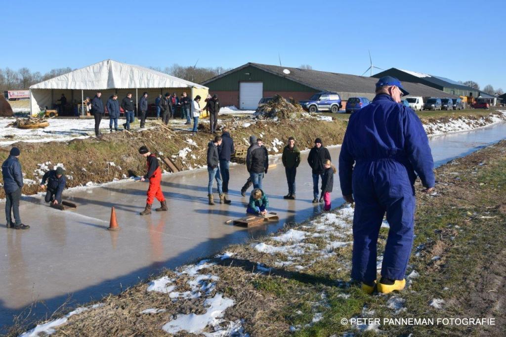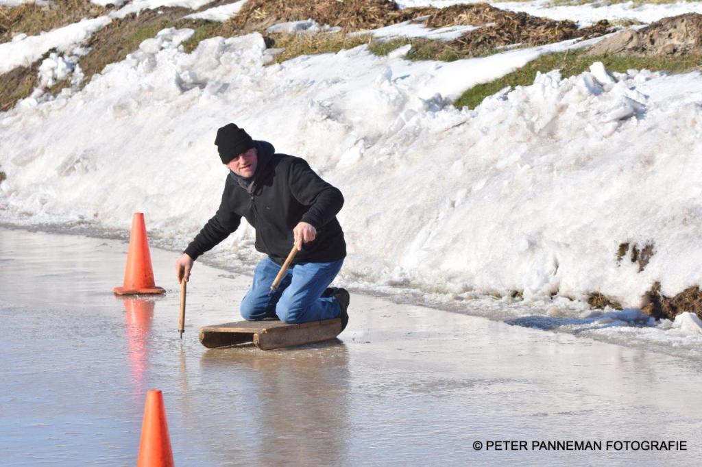 Maar de baan kon open en voor ongeveer 65 bezoekers lag deze uitnodigend te schitteren in de zon. De mooie ijsvloer was in drie lagen opgebouwd met 40 tot 50 kuub opgespoten water over het onderliggende sneeuwijs. De ijsvereniging heeft de beschikking over een eigen waterbron op 40 meter diepte. Met een slang zijn de vrijwilligers, over twee avonden en een keer overdag, de hele baan rond geweest voor een laag van 1 centimeter. De rest heeft de natuur gedaan op de 270 meter lange baan.