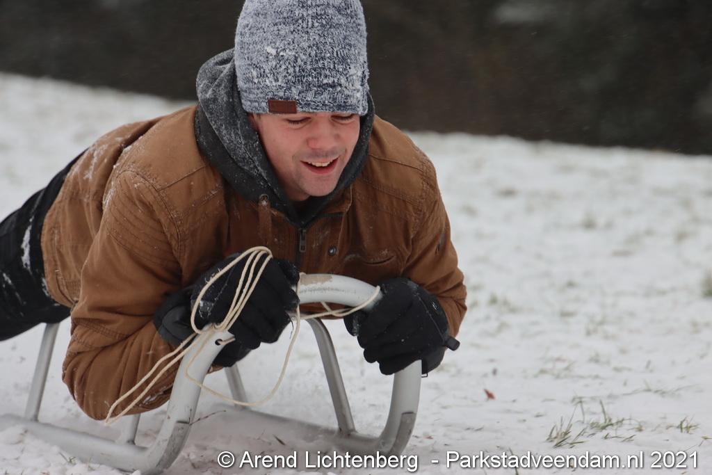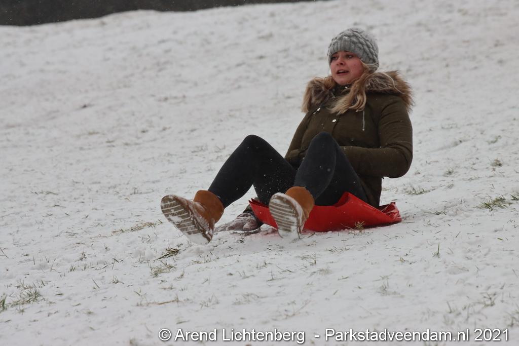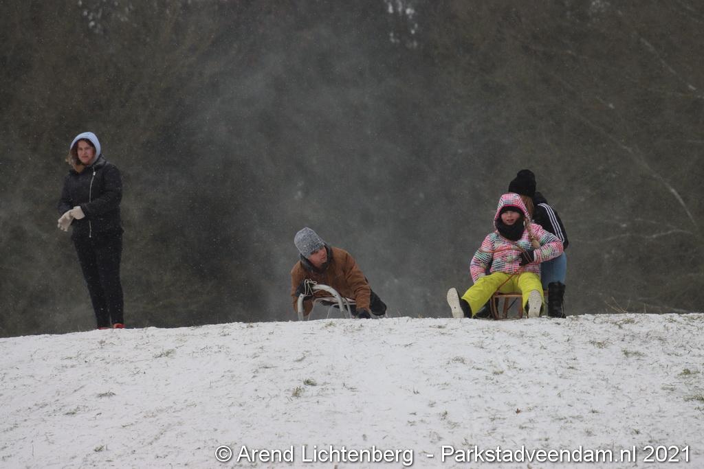 Door de harde sneeuwstorm heeft het zich bij stoepranden en tussen geparkeerde auto’s opgehoogd van 12- tot plaatselijk 32 centimeter.