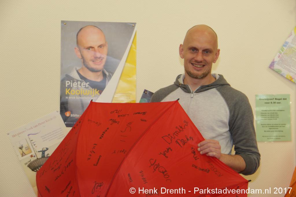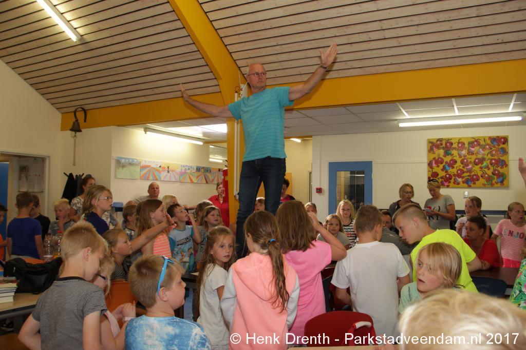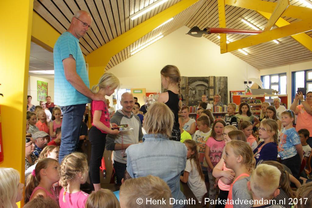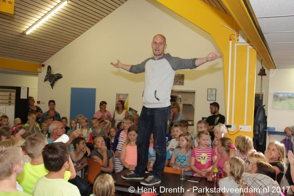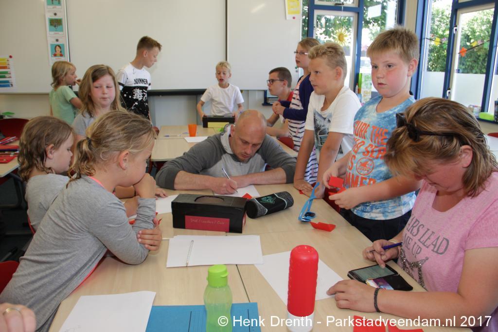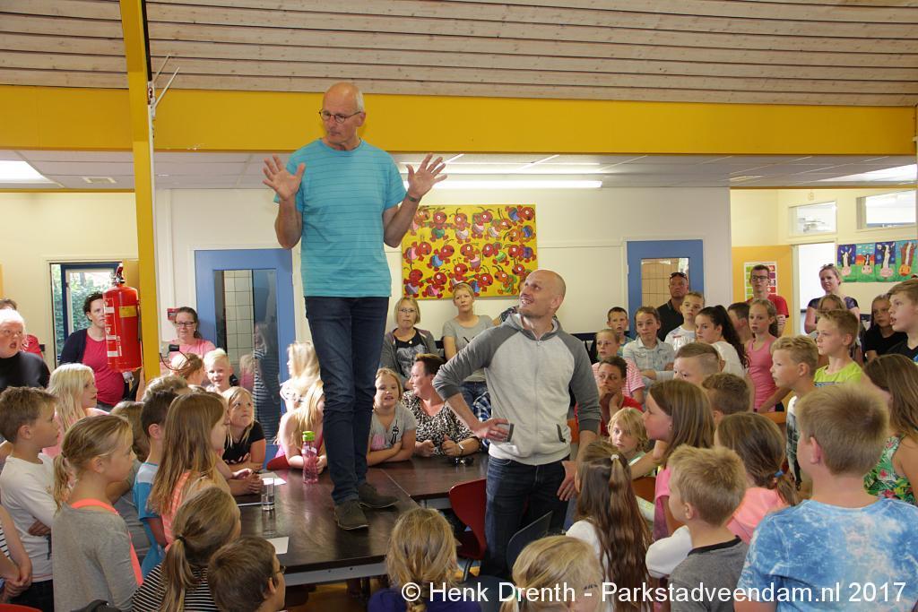 Bij het afscheid van schoolschrijver Pieter Koolwijk waren ook de ouders aanwezig. Waarbij zij ook met de spelletjes mee konden doen. De kinderen mochten met een creatieve en speelse invulling op hun eigen school zelf even Schoolschrijver voor hun ouders zijn.
