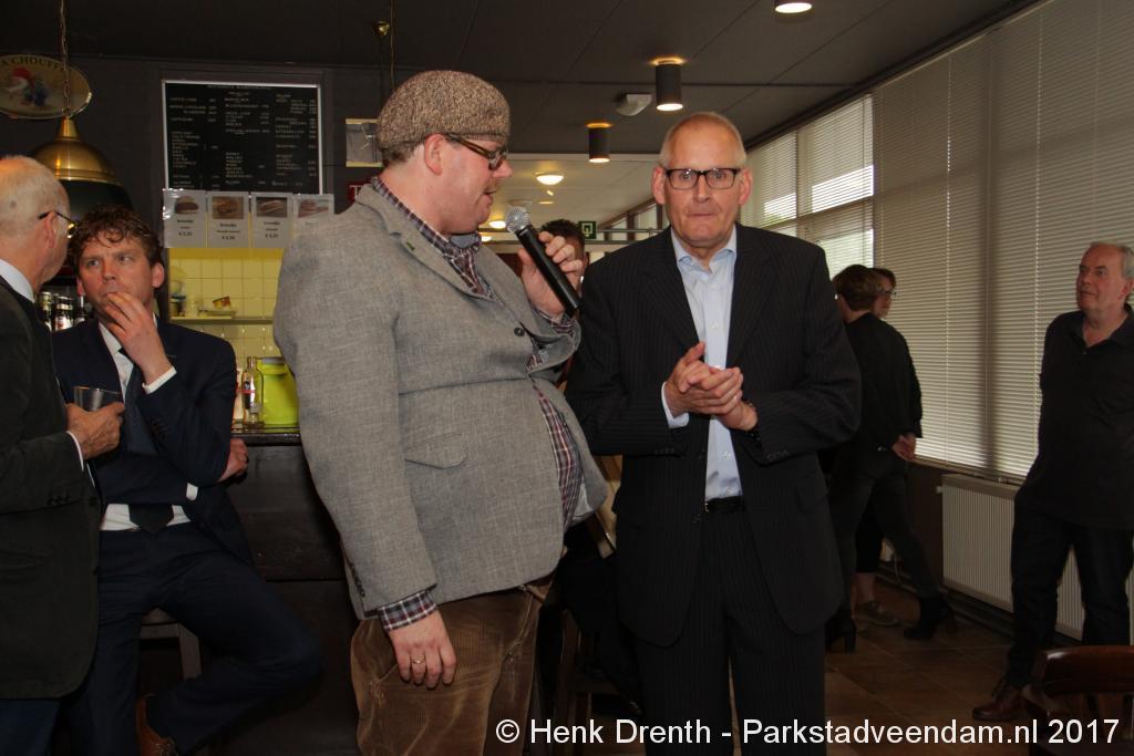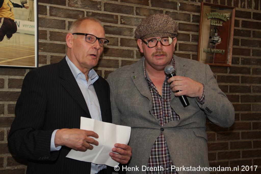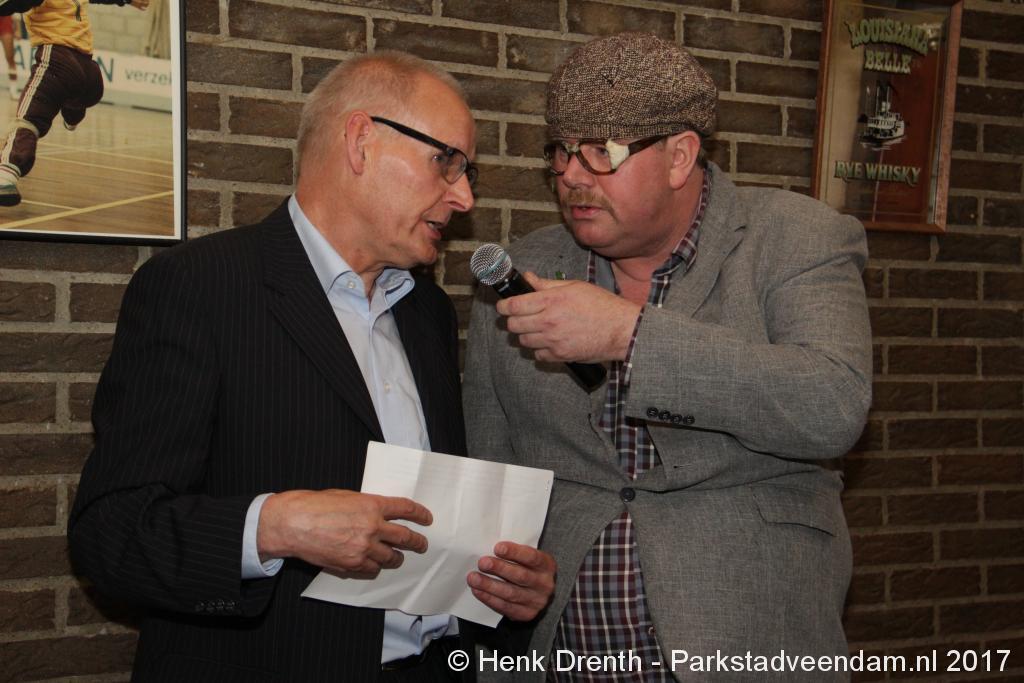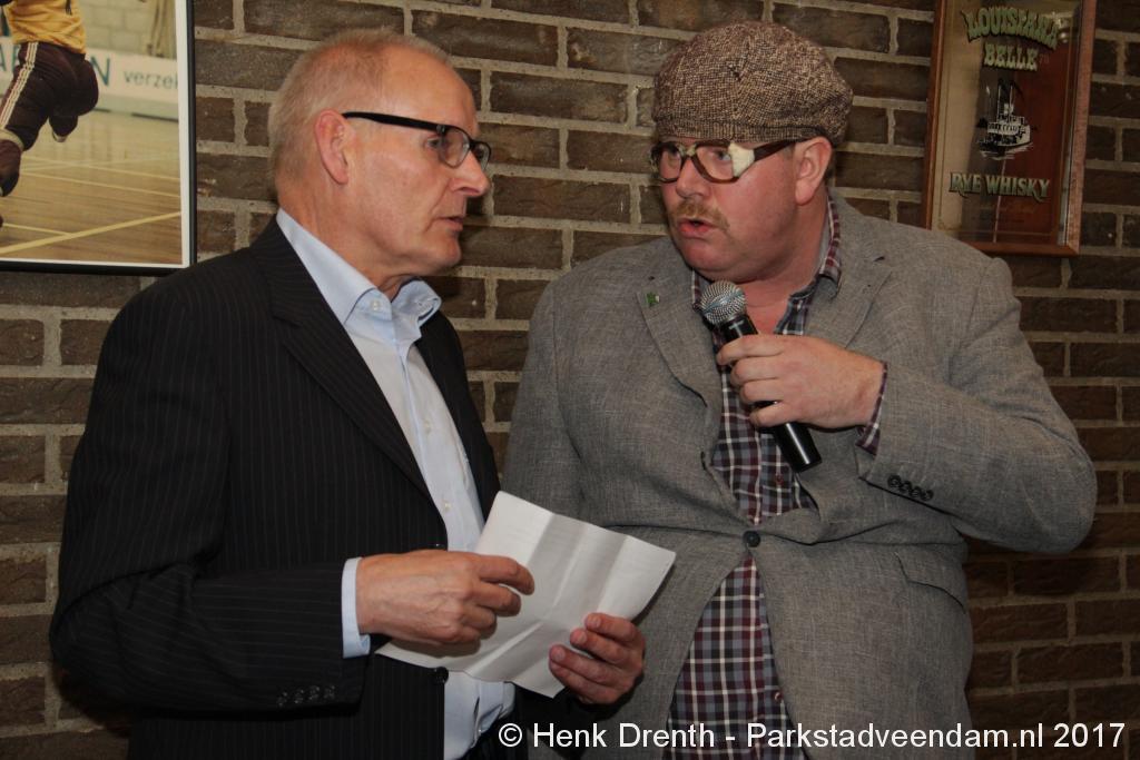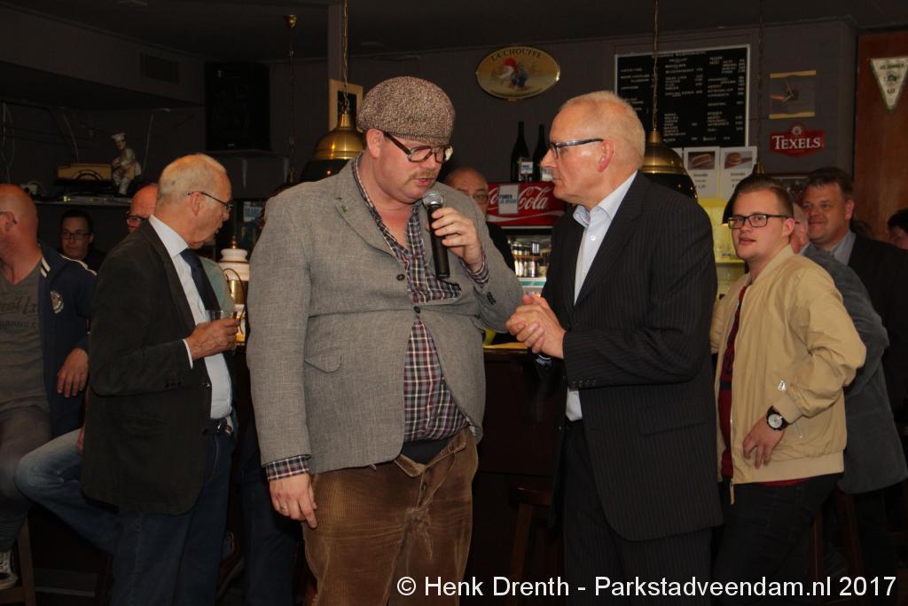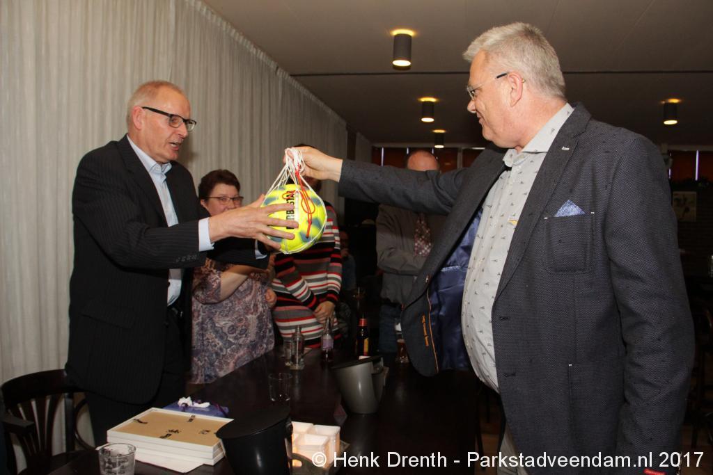 Tijdens de receptie werd aan het hooggeëerd publiek ook een special guest op het 'toneel' gebracht. Dat was niemand minder dan Evert Baptist. En hij ging met ondergetekende van Parkstadveendam ook nog even op de foto. Het was een drukte van belang om het bestuur de handen te schudden. Ik zag namens de KNVB Gerard Bults, voormalig elftalleider van BV Veendam. En namens de gemeente Veendam was wethouder Henk Jan Schmaal aanwezig.