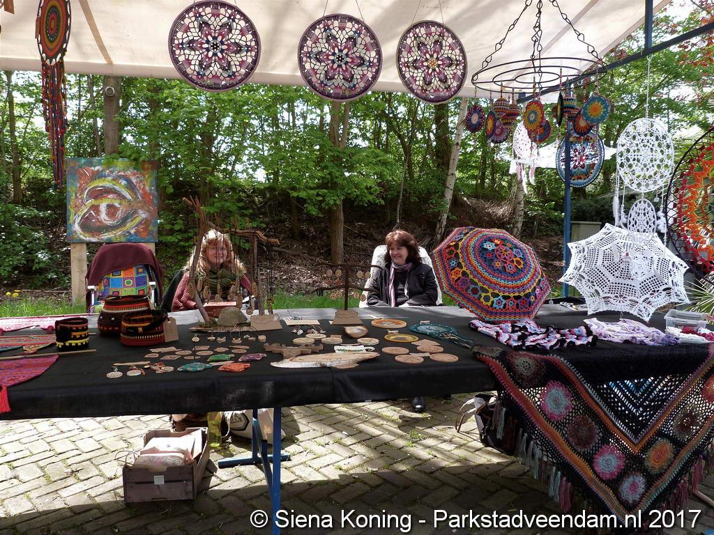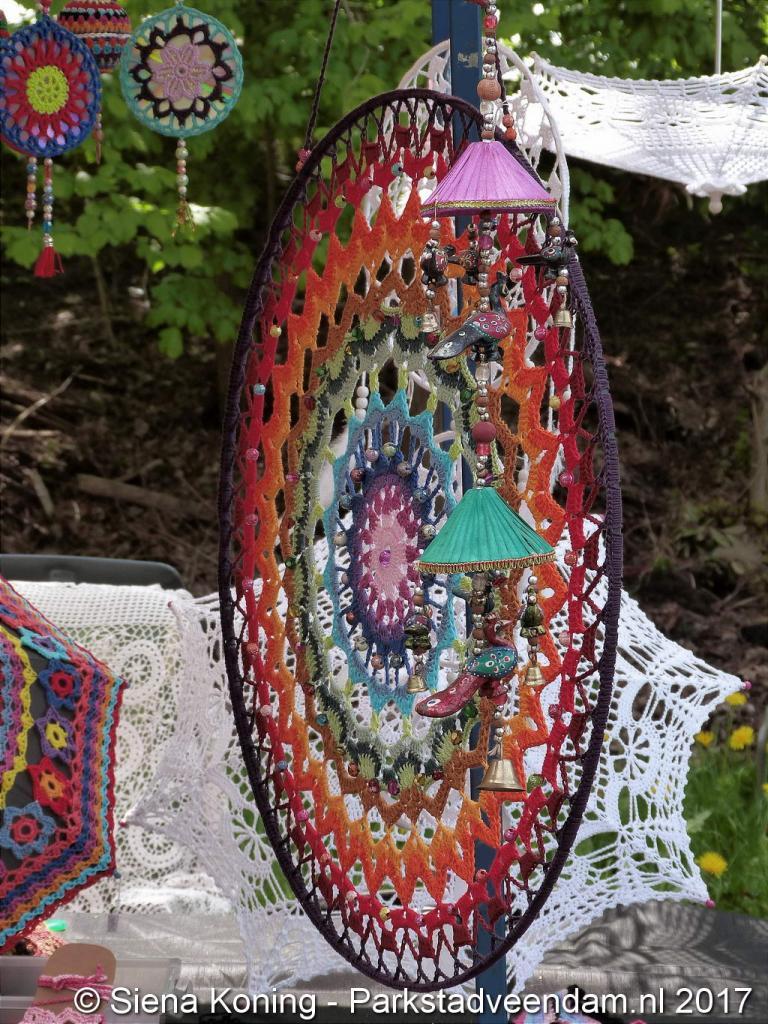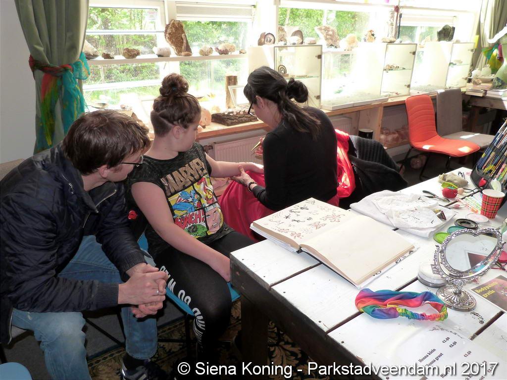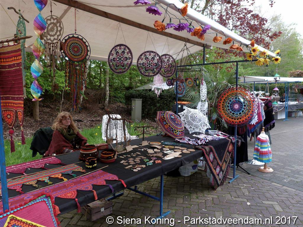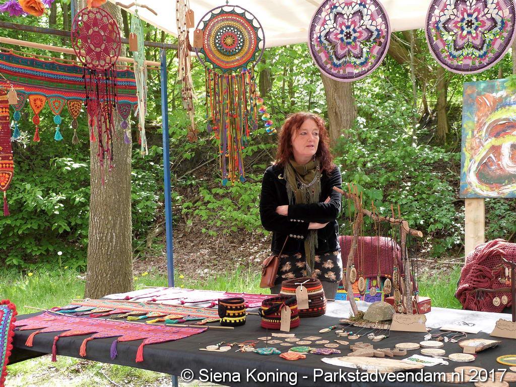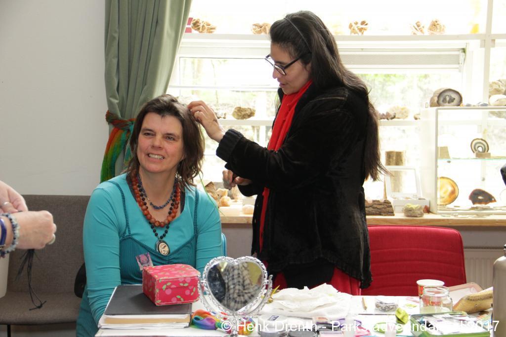 Creatieve haaksters en breisters hadden hun eigen kleurige omslagdoeken, poncho’s, gebreide poppen en meer bij zich. Renée van Os was er om met schmink en henna op gezicht en handen prachtige versieringen aan te brengen. Of het vlechten van een mooie veer in het haar. Natuurlijk was er een uitgebreide collectie stenen en kristallen te bewonderen.