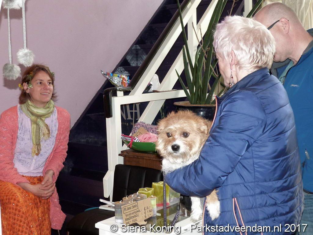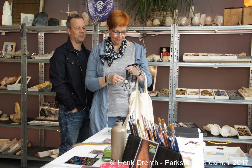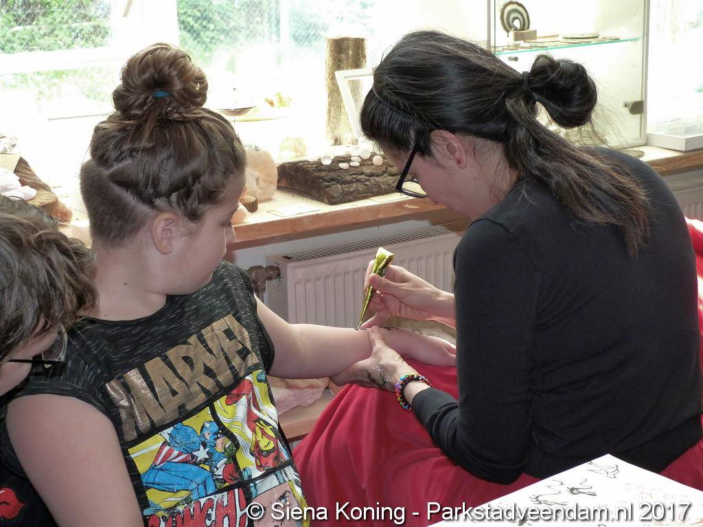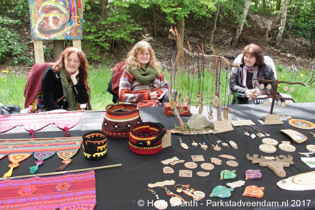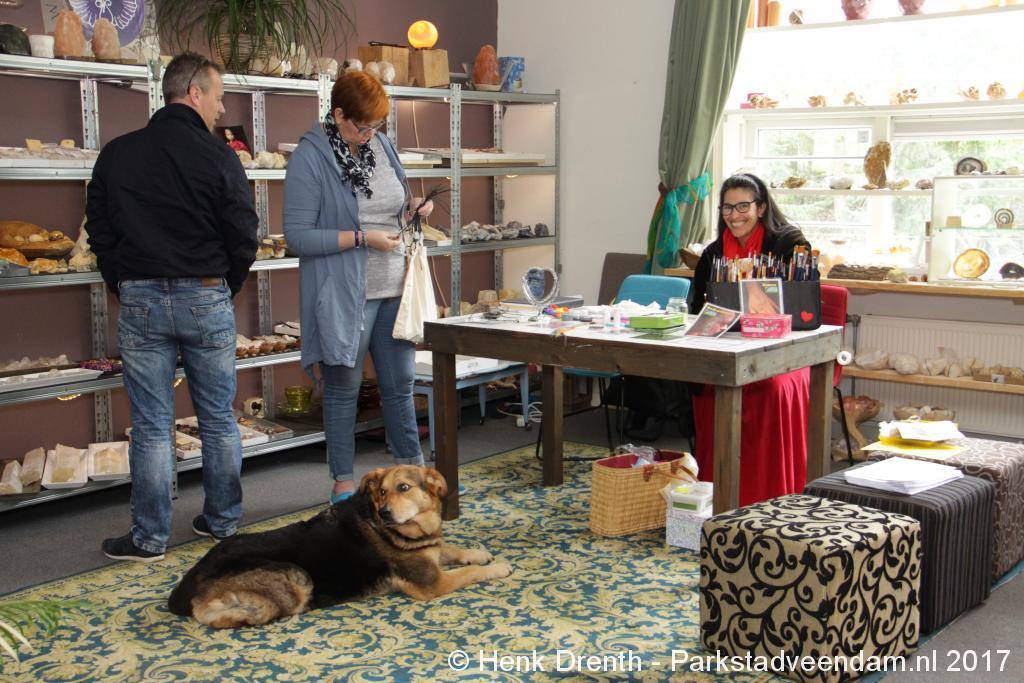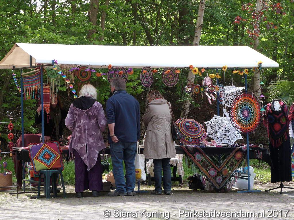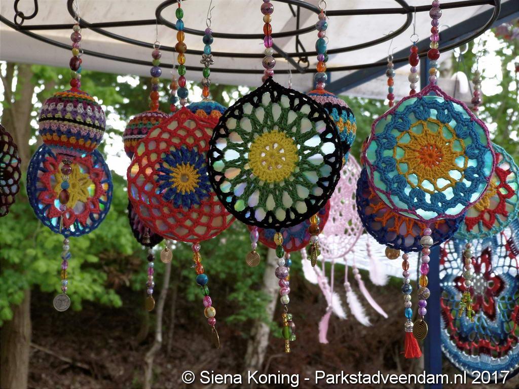 Creatieve haaksters en breisters hadden hun eigen kleurige omslagdoeken, poncho’s, gebreide poppen en meer bij zich. Renée van Os was er om met schmink en henna op gezicht en handen prachtige versieringen aan te brengen. Of het vlechten van een mooie veer in het haar. Natuurlijk was er een uitgebreide collectie stenen en kristallen te bewonderen.