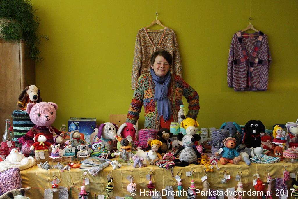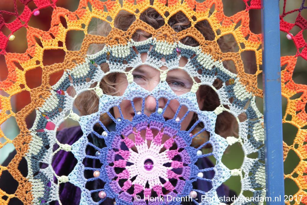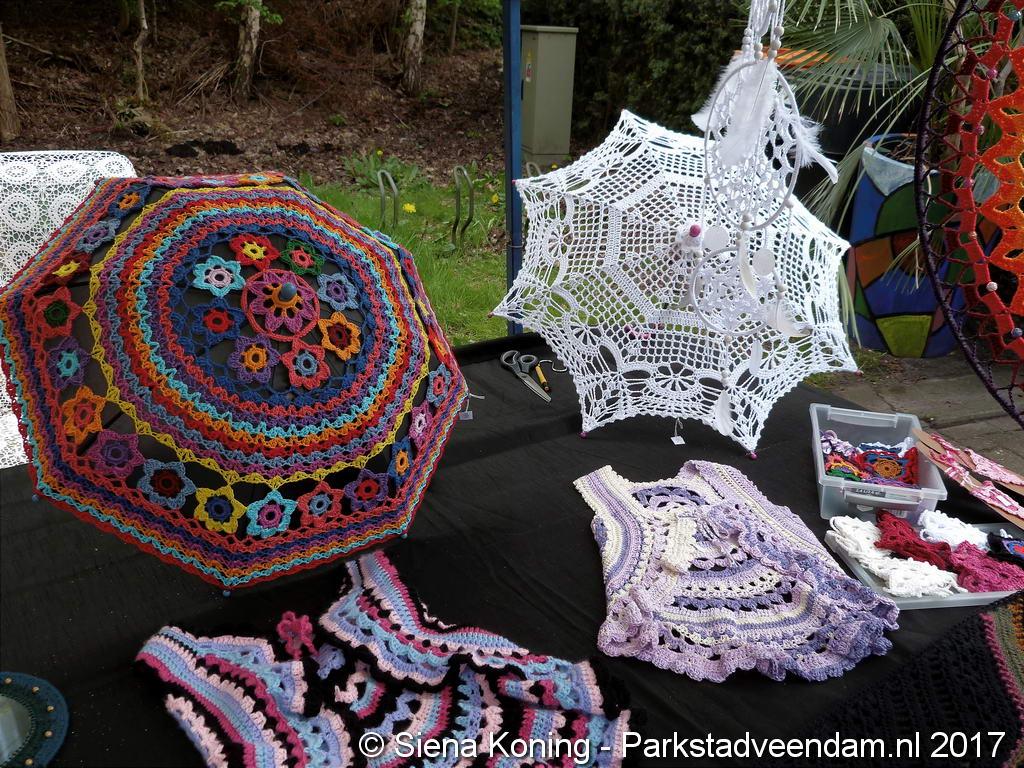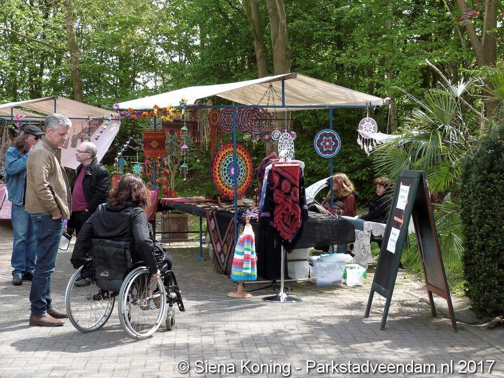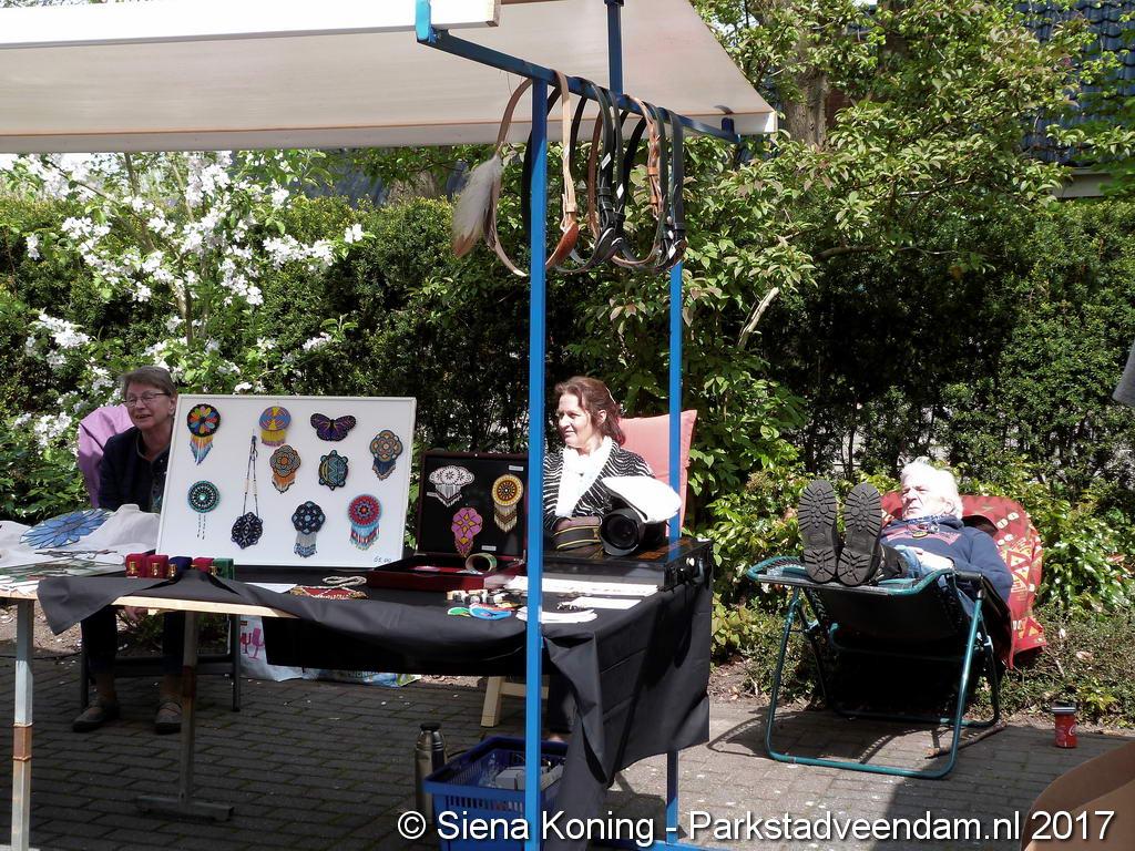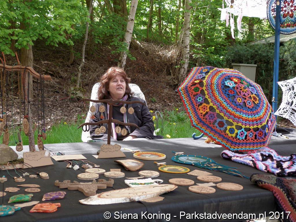 Creatieve haaksters en breisters hadden hun eigen kleurige omslagdoeken, poncho’s, gebreide poppen en meer bij zich. Renée van Os was er om met schmink en henna op gezicht en handen prachtige versieringen aan te brengen. Of het vlechten van een mooie veer in het haar. Natuurlijk was er een uitgebreide collectie stenen en kristallen te bewonderen.