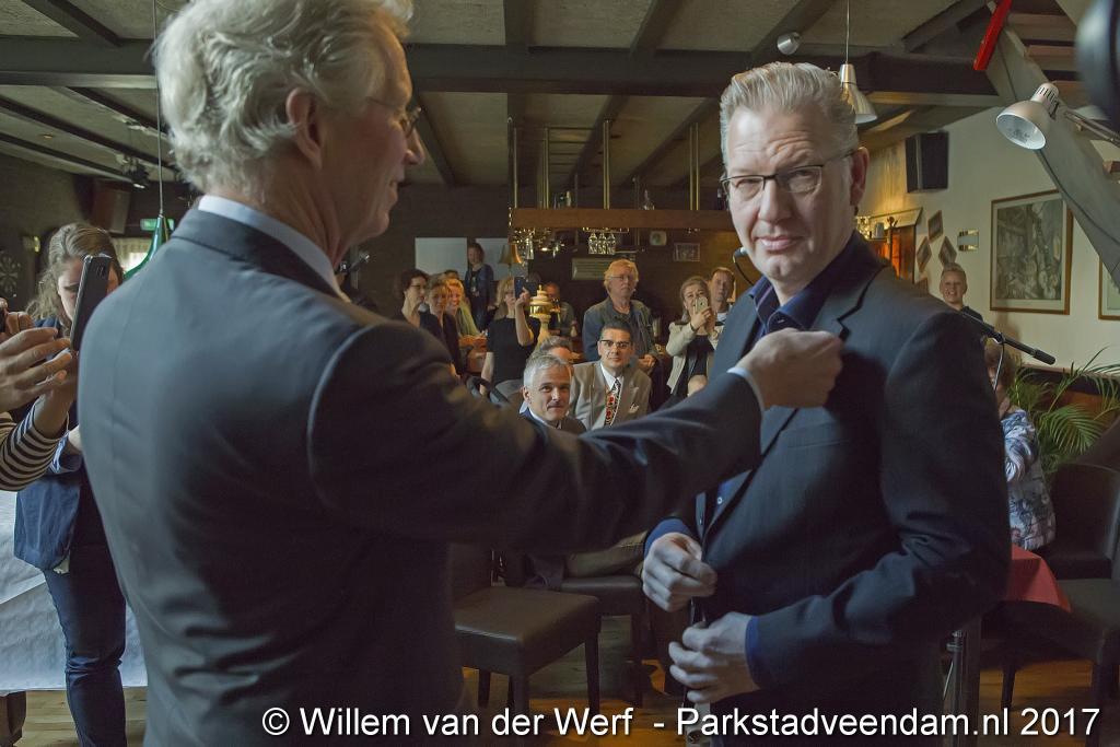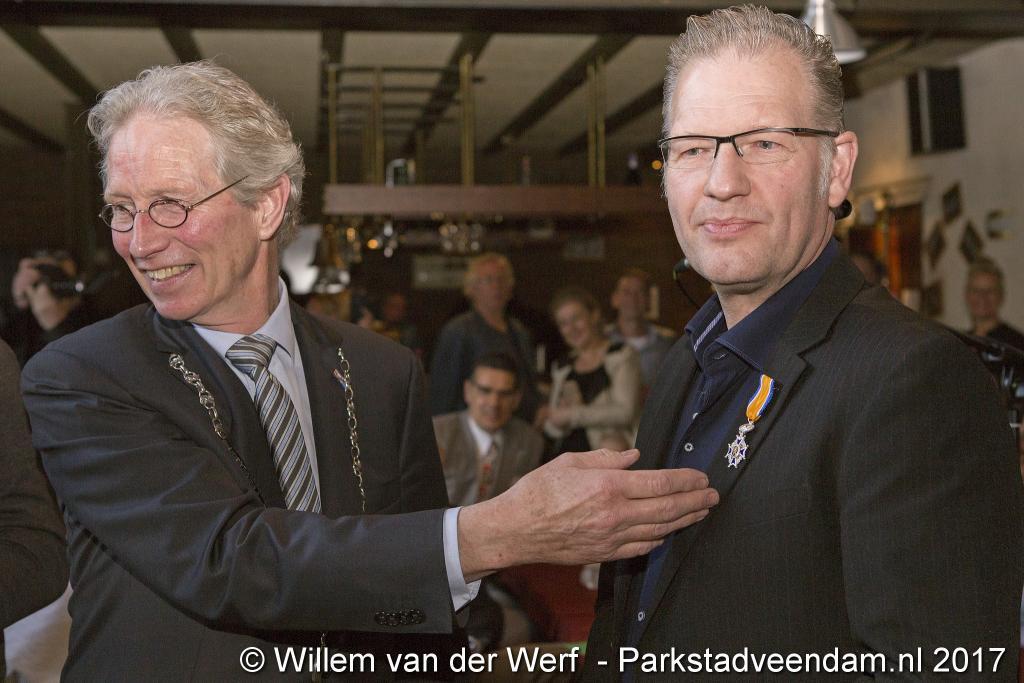 De KNV EHBO vertegenwoordiger van district Groningen Roelof Kuil spelde de onderscheidingen op, en ook was er een pen met inscriptie. Voor de beide echtgenotes werd een bos bloemen uitgereikt.