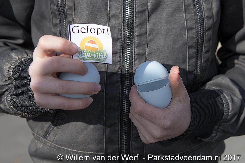 Honderd echte eieren waren door de vrijwilligers met mooie decoraties beschilderd. Verder was door het vinden van 100 plastic eitjes mooie prijzen te winnen. Ook kregen de kinderen paasnetjes uitgereikt. Ouderen van de Meridiaan hebben de netjes gehaakt in mooie kleuren. Voor en na de zoektocht  was er lekkers en drinken bij de partytent. Al dit lekkers was door de Albert Heijn in het ABC complex geschonken.