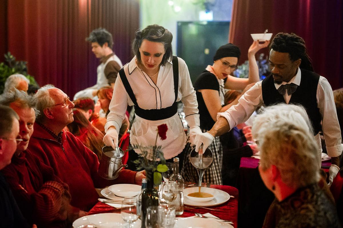 Alles doorspekt met muziek, schreven we. En hoe zit het dan het diner? Tussen de bedrijven door wordt een culinair hoogstaand driegangendiner geserveerd. Nou ja, tussen de bedrijven door… Er kan in alle rust worden gegeten en genoten van de heerlijke gerechten. Vooraf kun je aangeven of je de vlees- of vegetarische variant wilt. Het kookteam van het StadsLab spant zich in om ook op het culinaire gebied een topprestatie te leveren. Bijzonder is dat de artiesten niet alleen hun act “in het circus” doen, maar ook de gerechten aan tafel serveren.