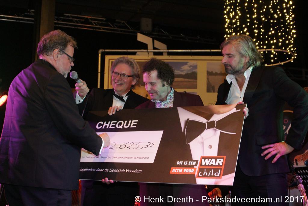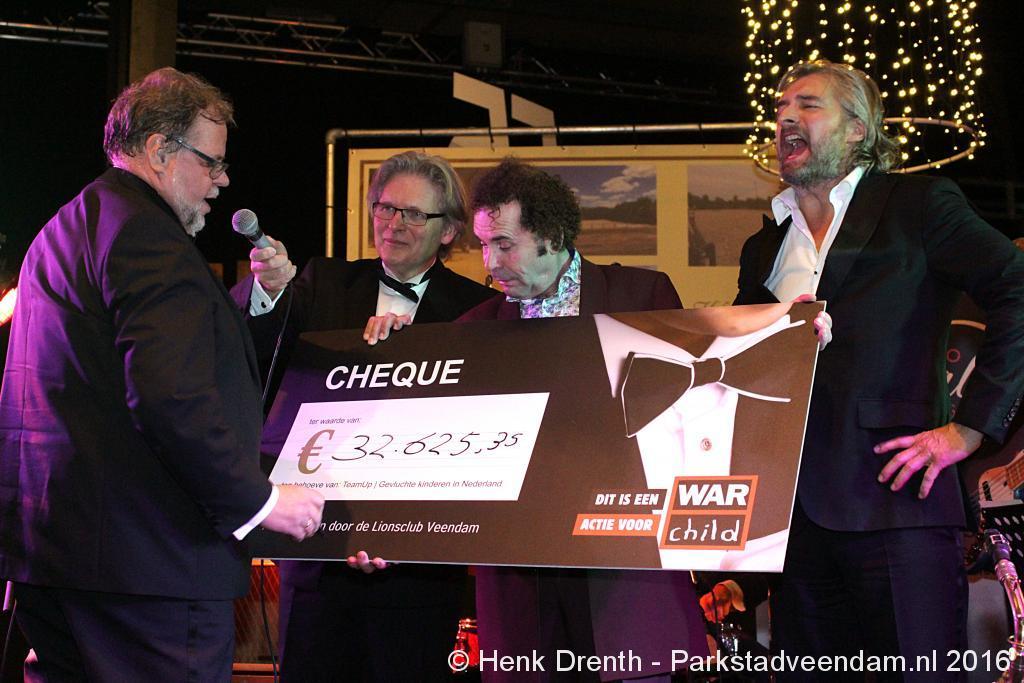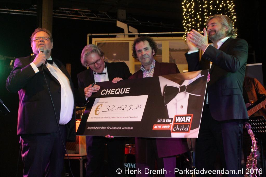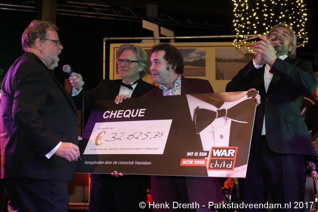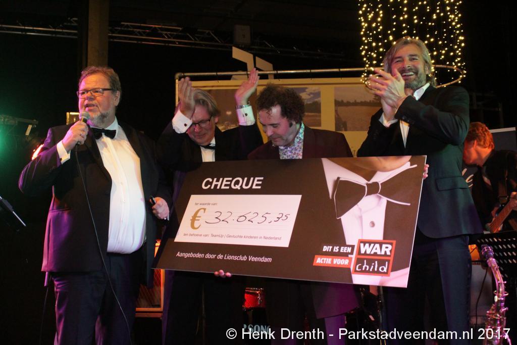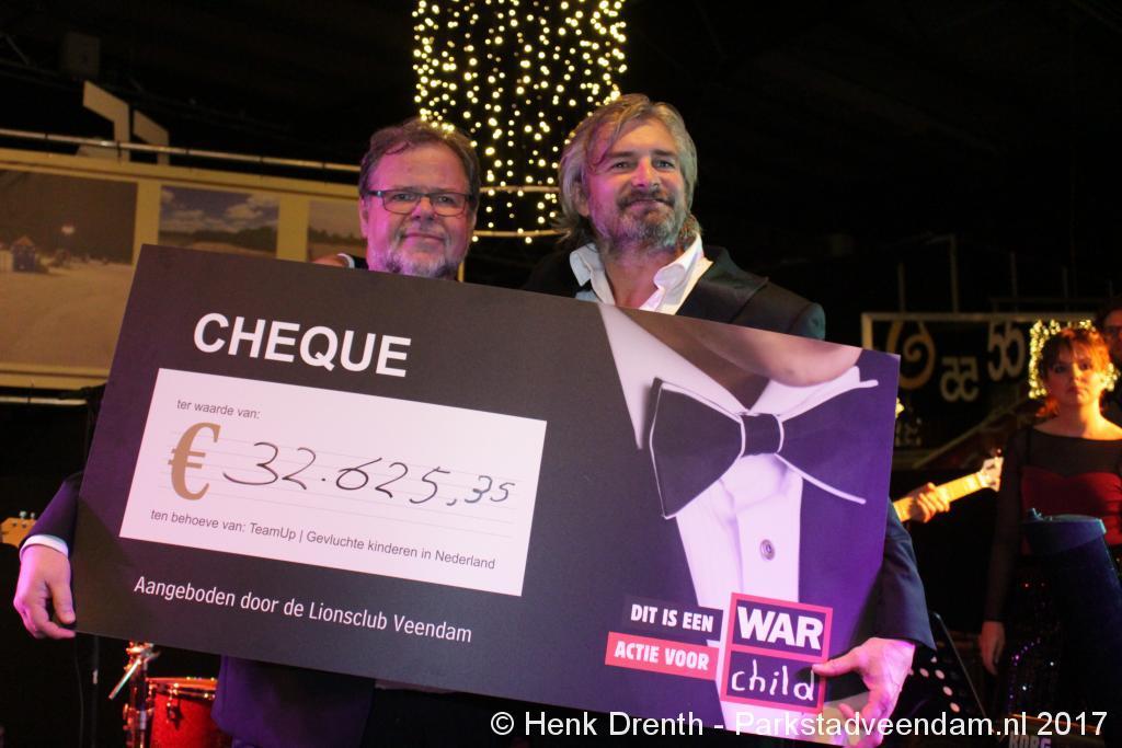 Lions lid en voorzitter van de organisatiecommissie Aaldert de Vries maakte woensdagavond de opbrengst van de Lions gala voor War Child bekend. Dat deed hij door het bedrag van € 32.625,32 van rechts naar links op de cheque te schrijven met de eerste 3 als laatste. Voor het in ontvangst nemen van de cheque was de acteur Victor Reinier naar Veendam gekomen. Victor Reinier is ambassadeur van War Child. Hij was uitzinnig na de bekendmaking.