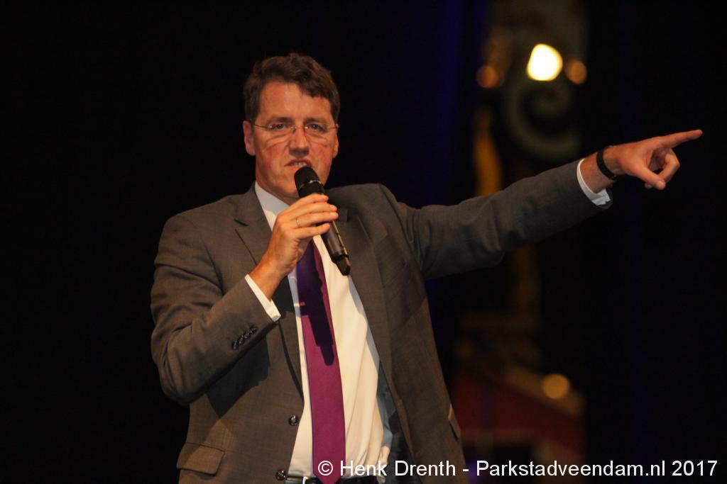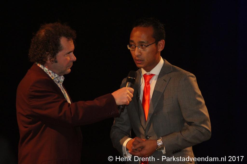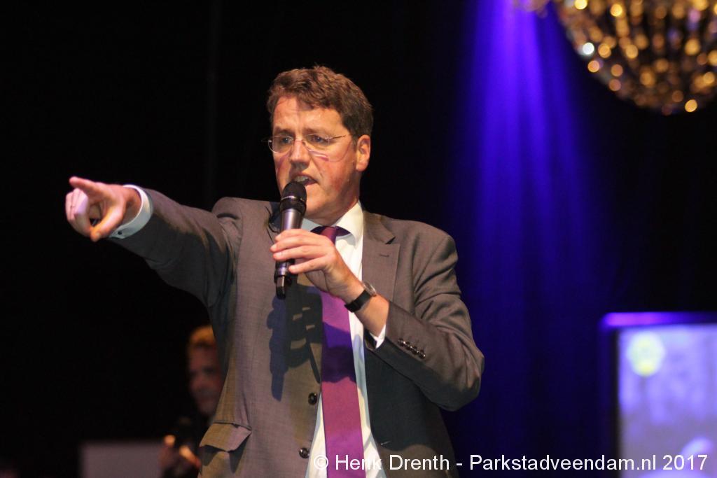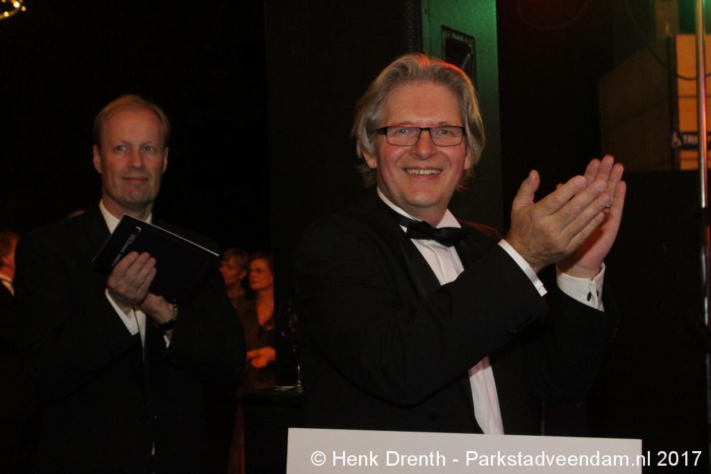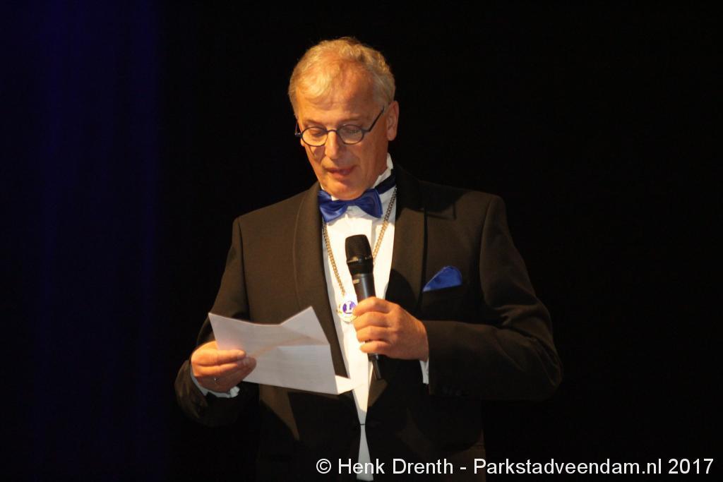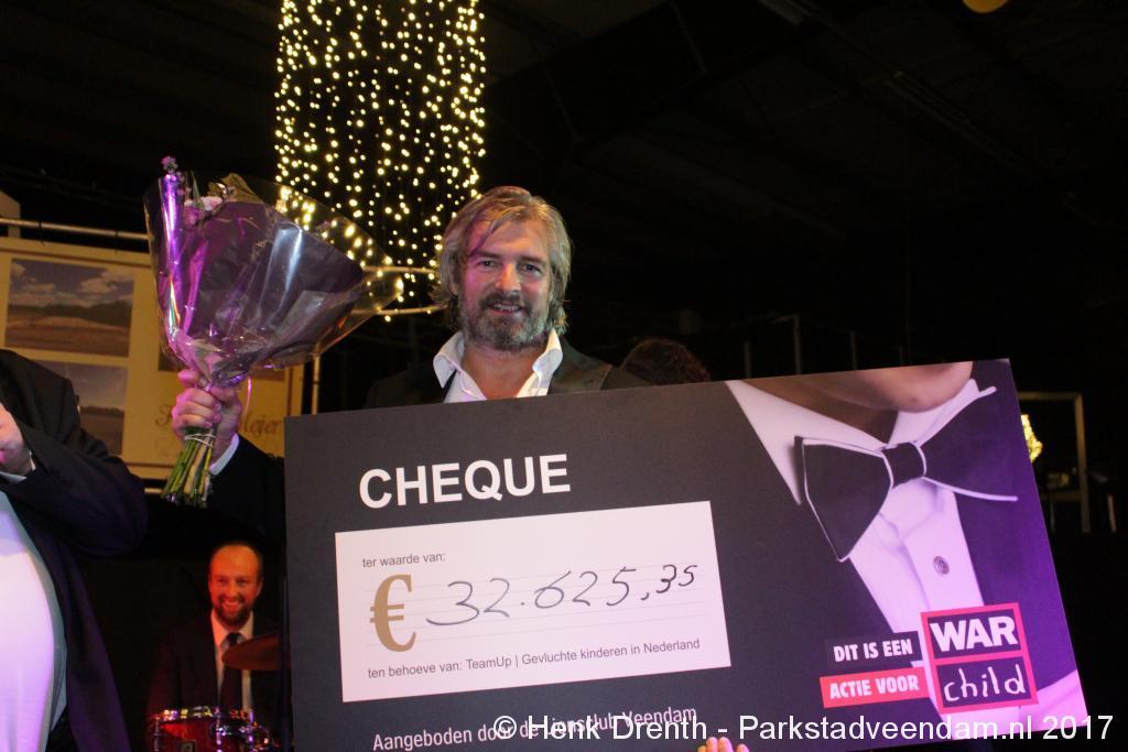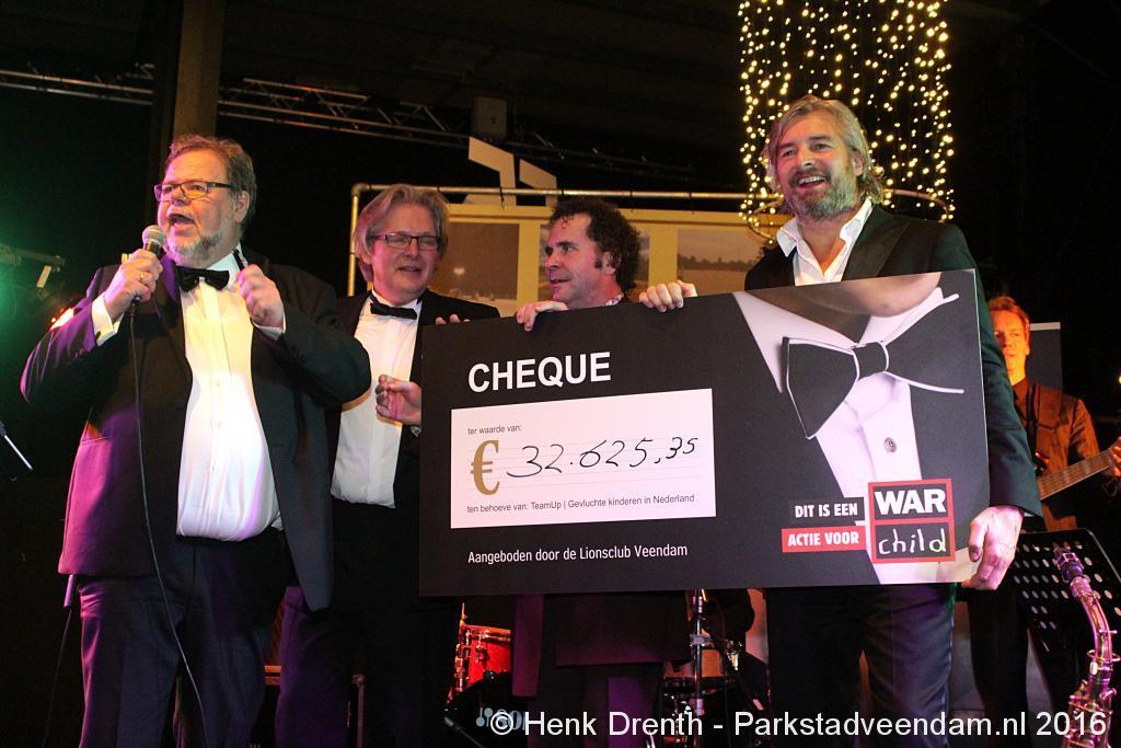 Lions lid en voorzitter van de organisatiecommissie Aaldert de Vries maakte woensdagavond de opbrengst van de Lions gala voor War Child bekend. Dat deed hij door het bedrag van € 32.625,32 van rechts naar links op de cheque te schrijven met de eerste 3 als laatste. Voor het in ontvangst nemen van de cheque was de acteur Victor Reinier naar Veendam gekomen. Victor Reinier is ambassadeur van War Child. Hij was uitzinnig na de bekendmaking.
