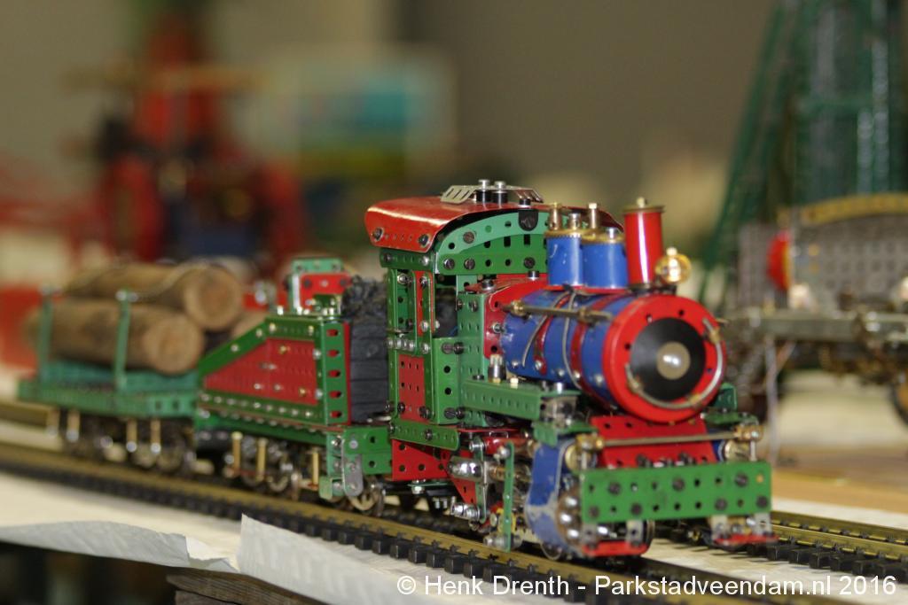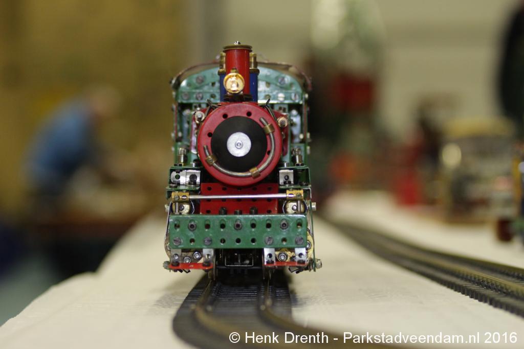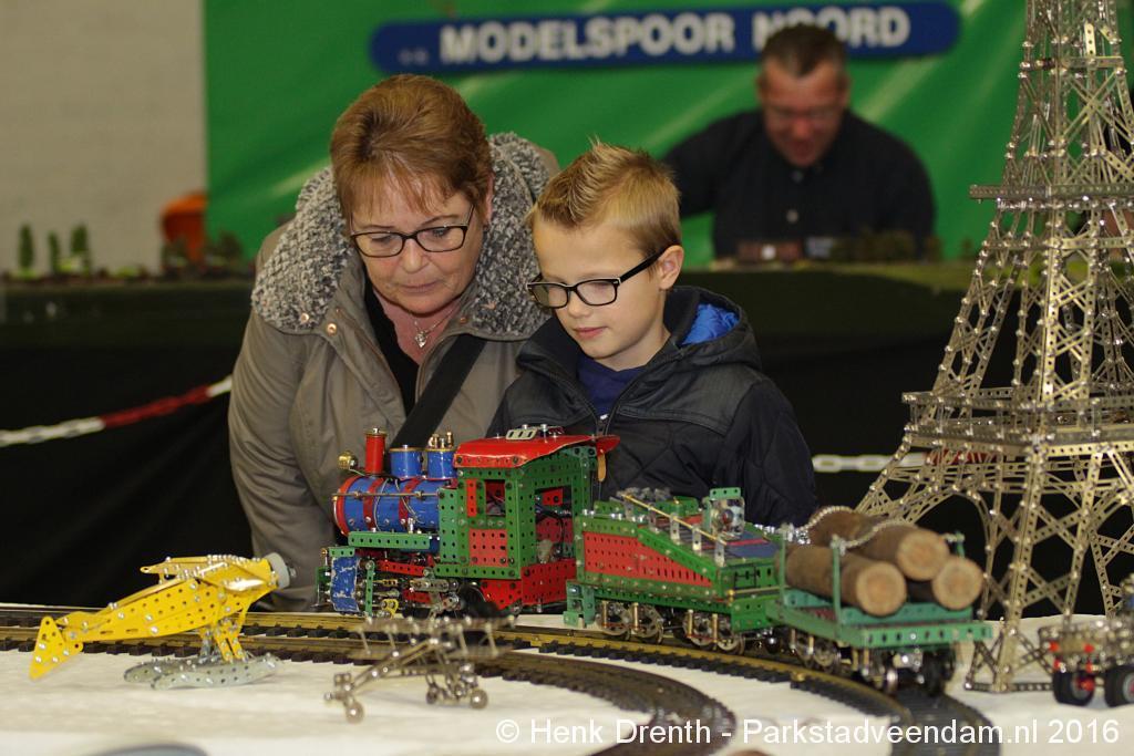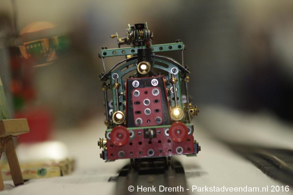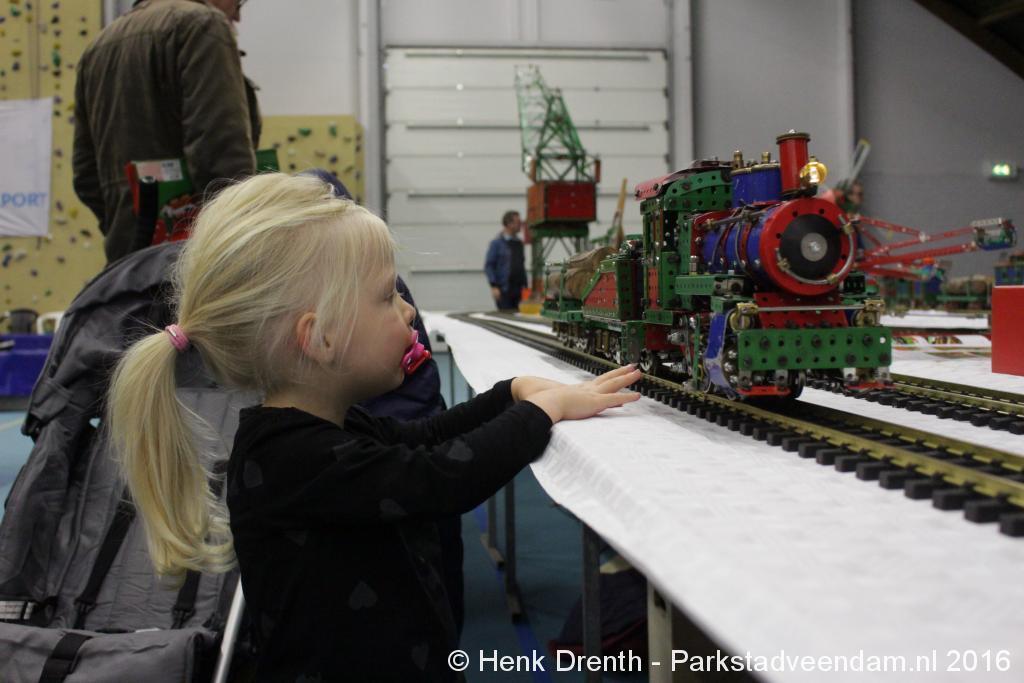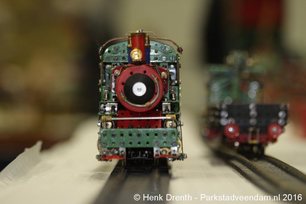 Van het montagemateriaal Meccano reden twee locomotieven hun rondes. Welke volop de aandacht trokken van de 6 jarige Beau Frikken uit Muntendam.