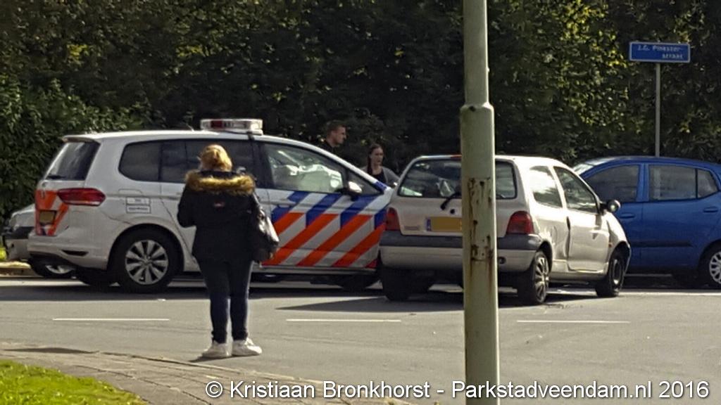 De vrouwelijke bestuurder liep lichte letsel op. De mogelijke toedracht is een voorrangsfout. Vele leerlingen van de Winkler Prins kwamen een kijkje nemen.