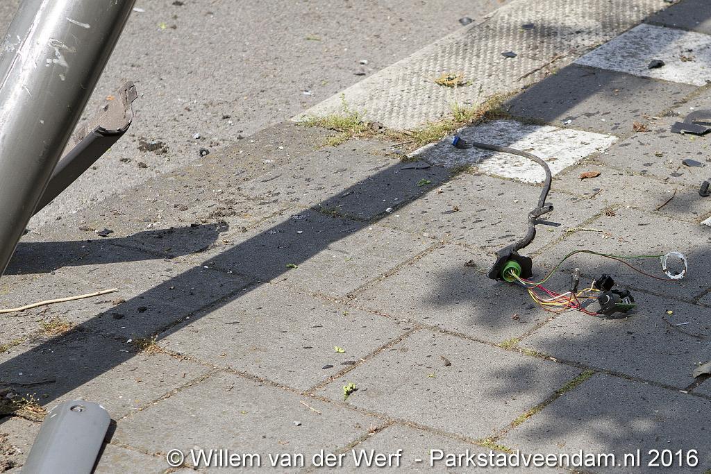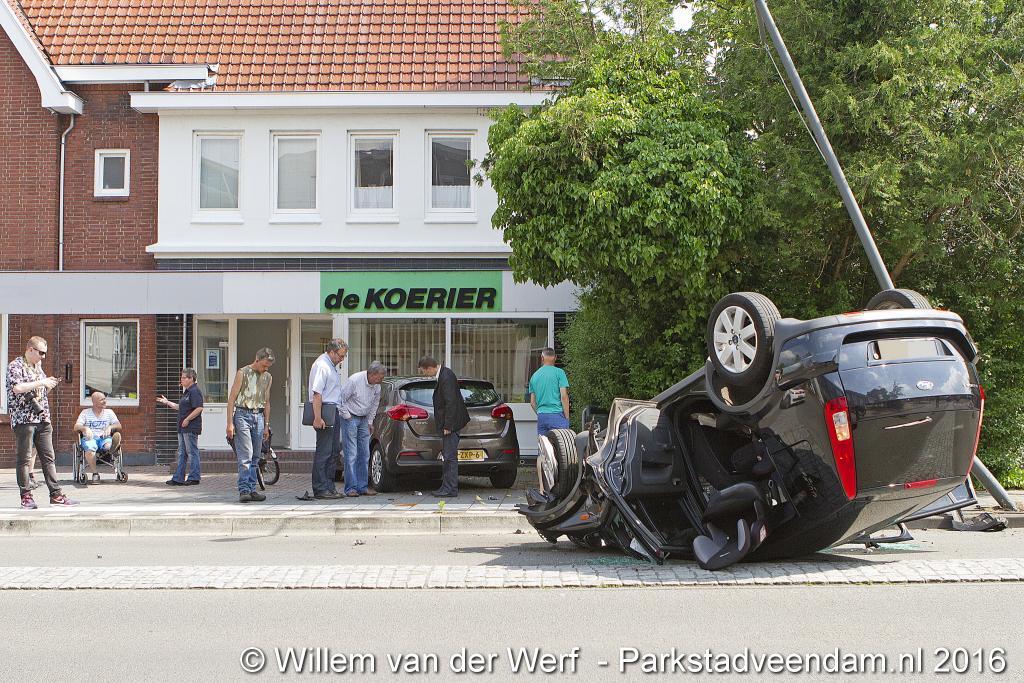 Deze eenzijdige ongeval gebeurde voor de deur van weekkrant de Koerier. Daar raakte de auto ook een lantarenpaal.