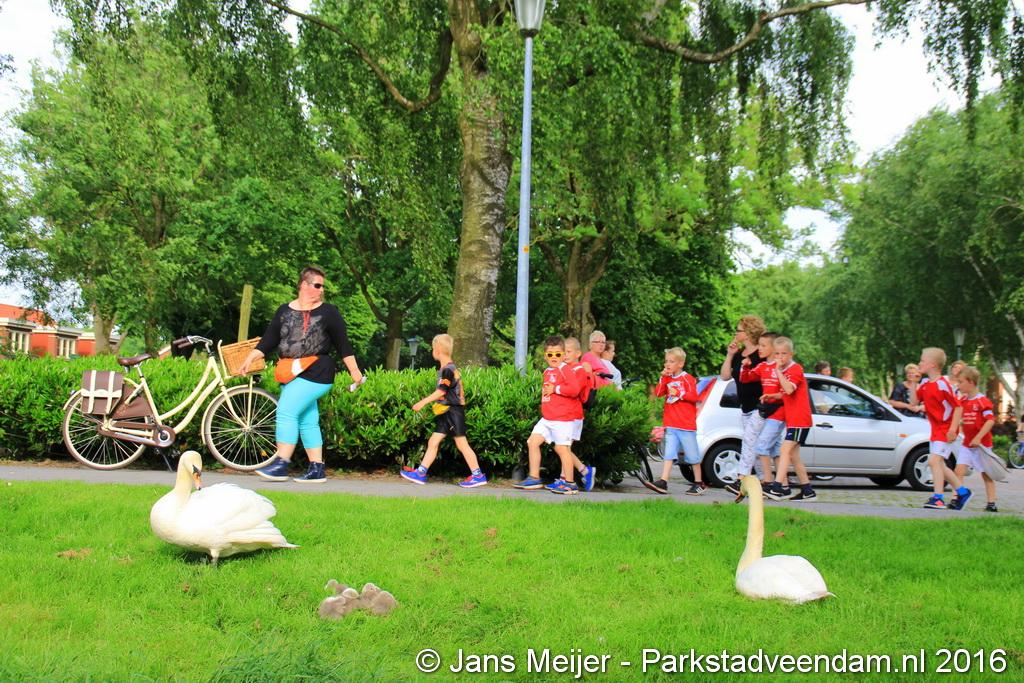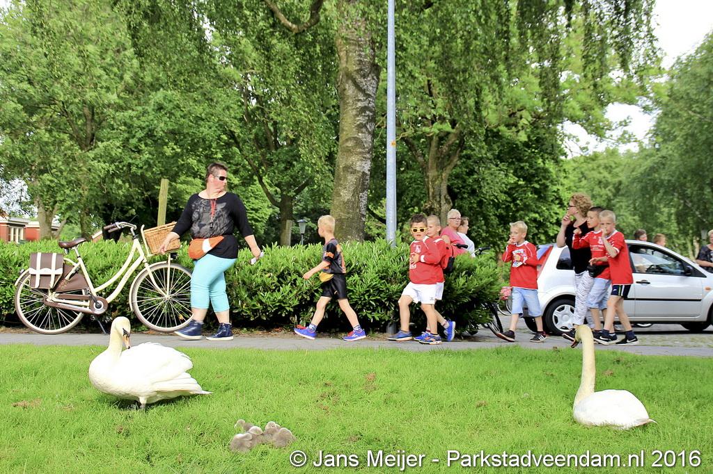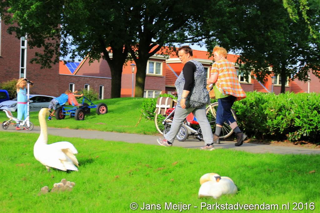 WILDERVANK - De Avondvierdaagse in Wildervank had woensdagavond wel hele speciale toeschouwers. Een zwanenfamilie met een aantal jongen. Vele wandelaars kozen een andere route zodat het jonge gezinnetje niet werd gestoord. Donderdag (vandaag) is de alweer laatste dag met aansluitend de feestelijk intocht van alle wandelaars, die start rond 19:00 uur bij de Vijverlaan.