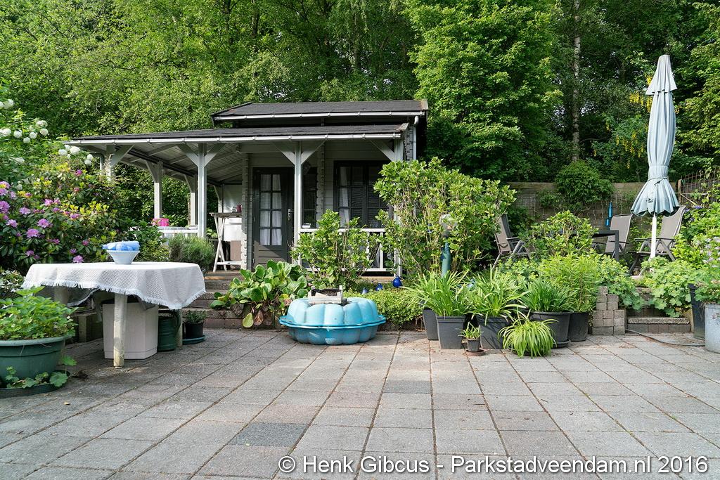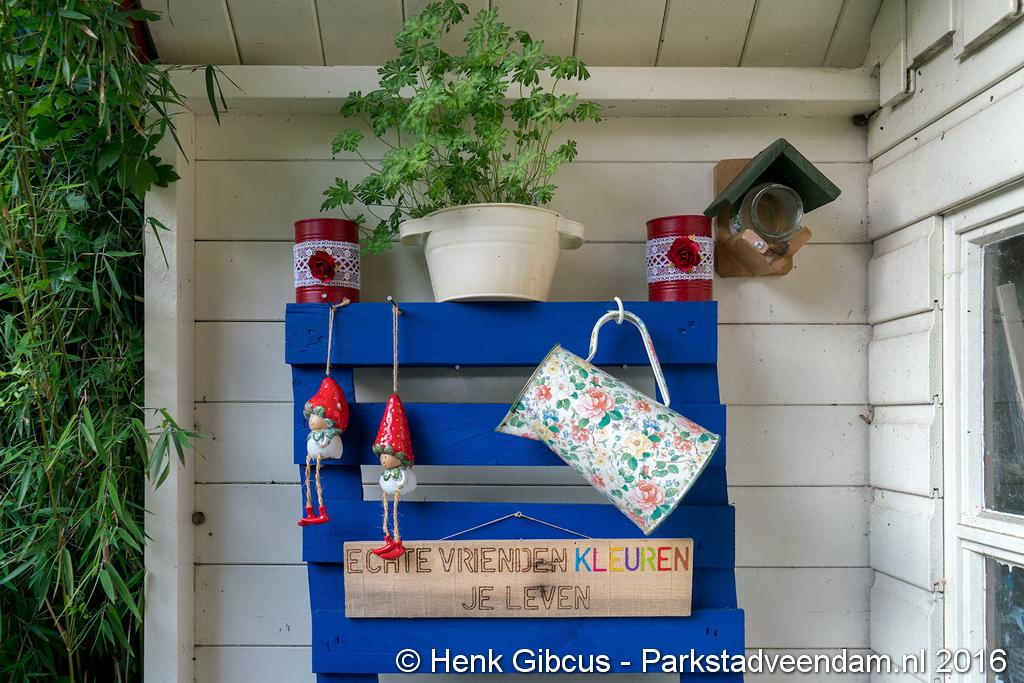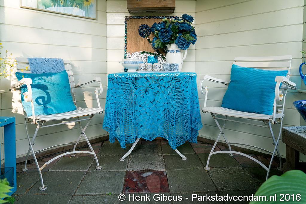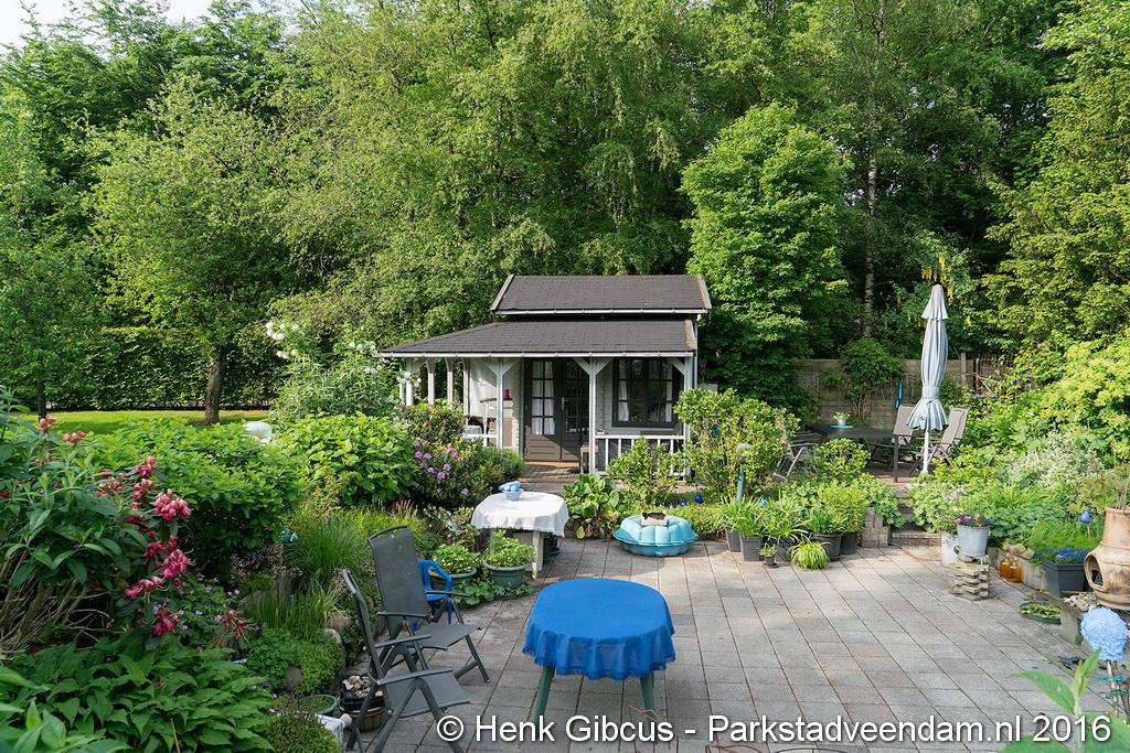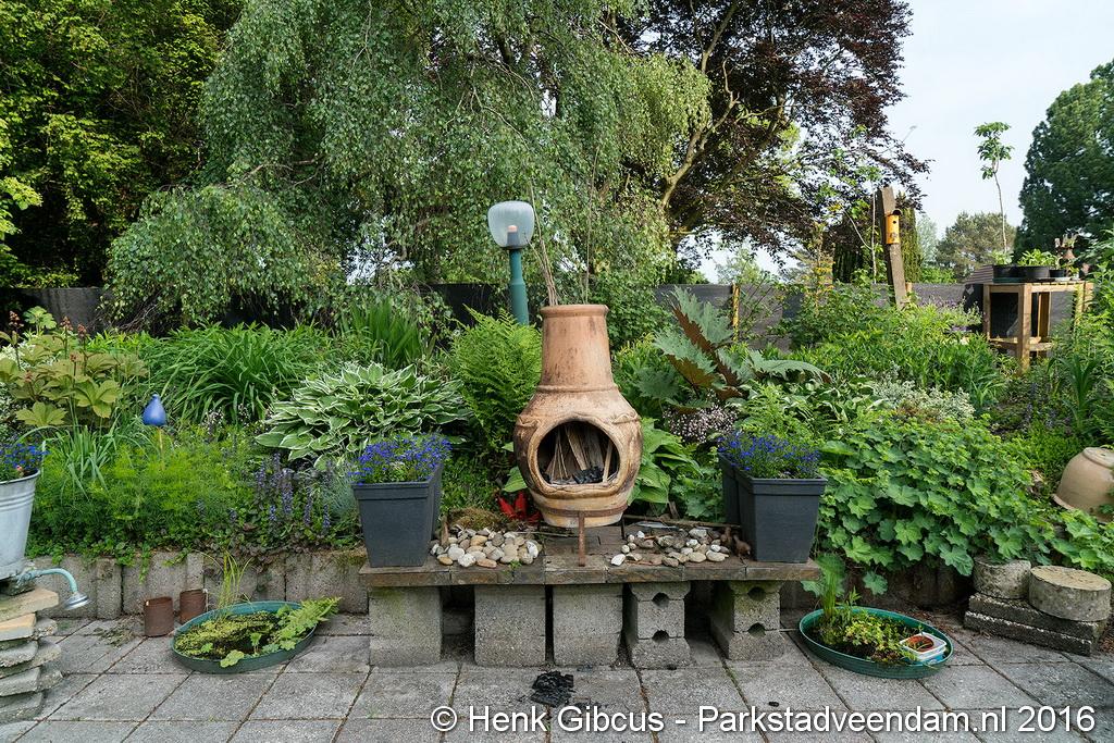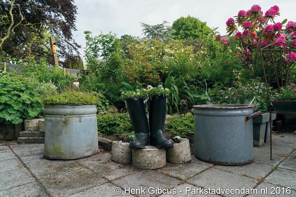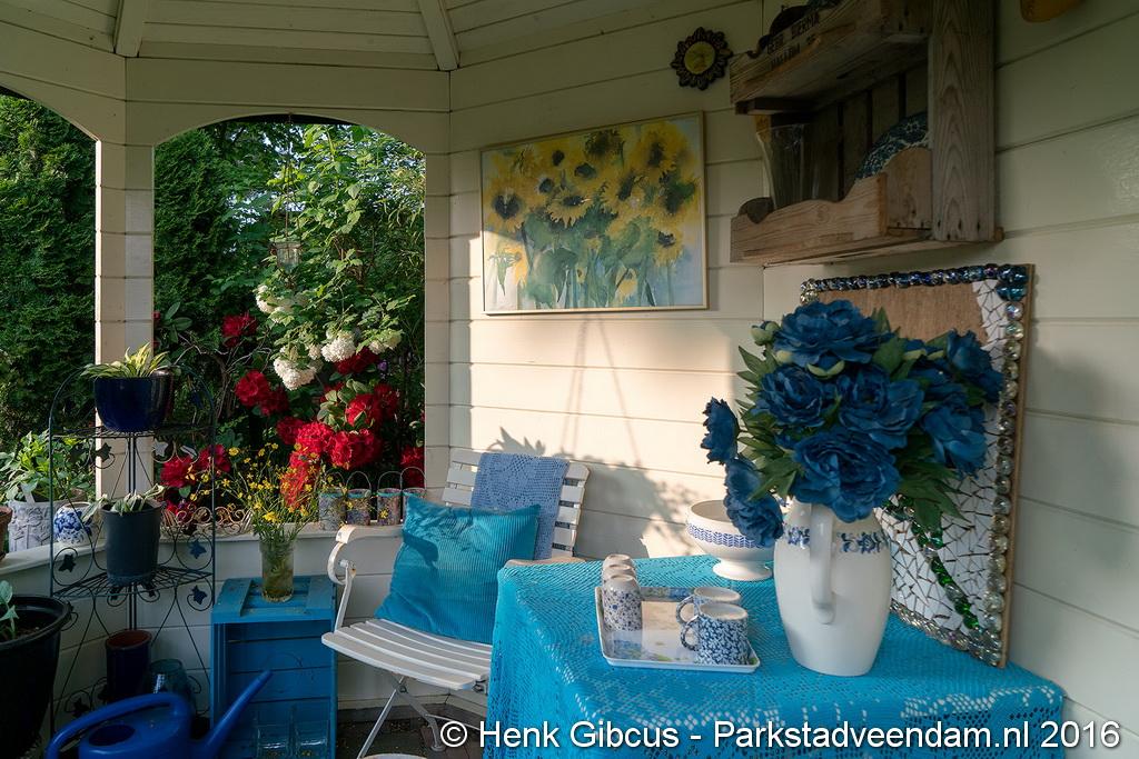 We zijn aangeland op de Landbouwstraat in Wildervank en wel op de nummers 23 en 128. Ondanks dat de nummers ogenschijnlijk ver uit elkaar liggen is het slechts de straat oversteken om beide tuinen te ontdekken. Twee tuinen die totaal van elkaar verschillen, maar zeker ook zaken gemeen hebben. Ben Vegter, agogisch begeleider bij Lentis, heeft een smalle diepe tuin met gezellige pittoreske hoekjes/zitjes, een kronkelpaadje, een prieeltje en komt romantisch over. De tuin bij Ina Laarman is een boerderij-tuin. Zij is  getrouwd met een boer en is naast moeder, oma ook boerin. Ze woont op een boerderij, vandaar die boerderij-tuin! Deze beschikt over een groot verdiept terras (zitkuil), een tuinhuis met veranda, een bostuin, een vijver met vissen, een fruithof en een oud bomenbestand met een linde van meer dan 100 jaar! Wat ze gemeen hebben zijn de kleurrijke gevarieerde bloemenborders, hoewel bij Ben de kleur blauw de boventoon voert. “Blauw geeft diepte in de tuin, het lijkt groter,” vertelt hij enthousiast. Ook het ontwerp, aanleg hebben ze gemeen. Ze hebben namelijk alles zelf gedaan. Ina: “De terrassen en paadjes heb ik zelf gelegd met waterpas en al,” en ze kijkt erbij alsof ze haar rug nog voelt! Gemeenschappelijk hebben ze ook dat het een échte liefhebberstuin is. Géén rariteiten of exotische aanplant, maar “gewoon” gangbaar spul van de super, Praxis of Gerards Bloemenkas. Een enkele keer laten ze zich verleiden door de aankoop van een ondersoort of cultivar (variëteit die bij het kweken is ontstaan) bij Foltz in Meeden.