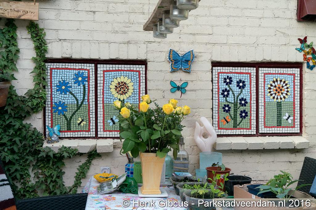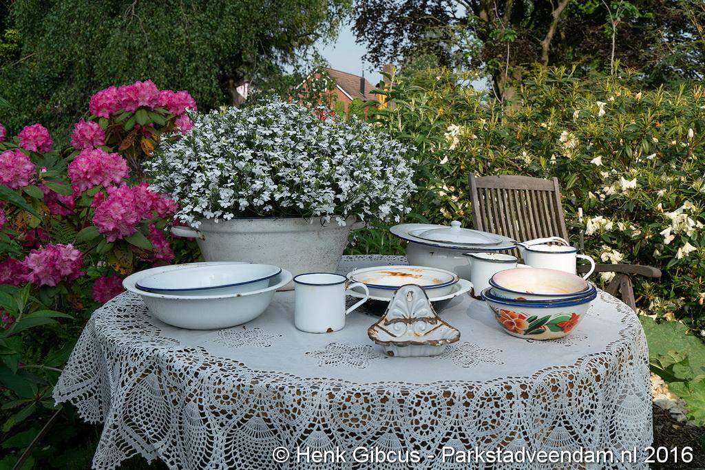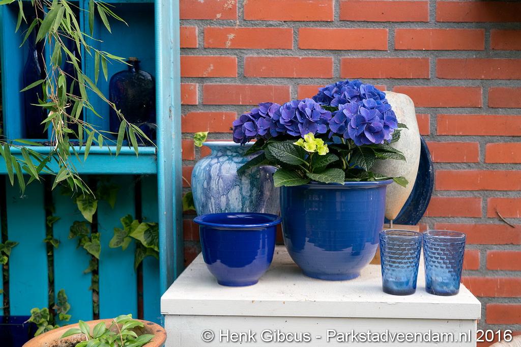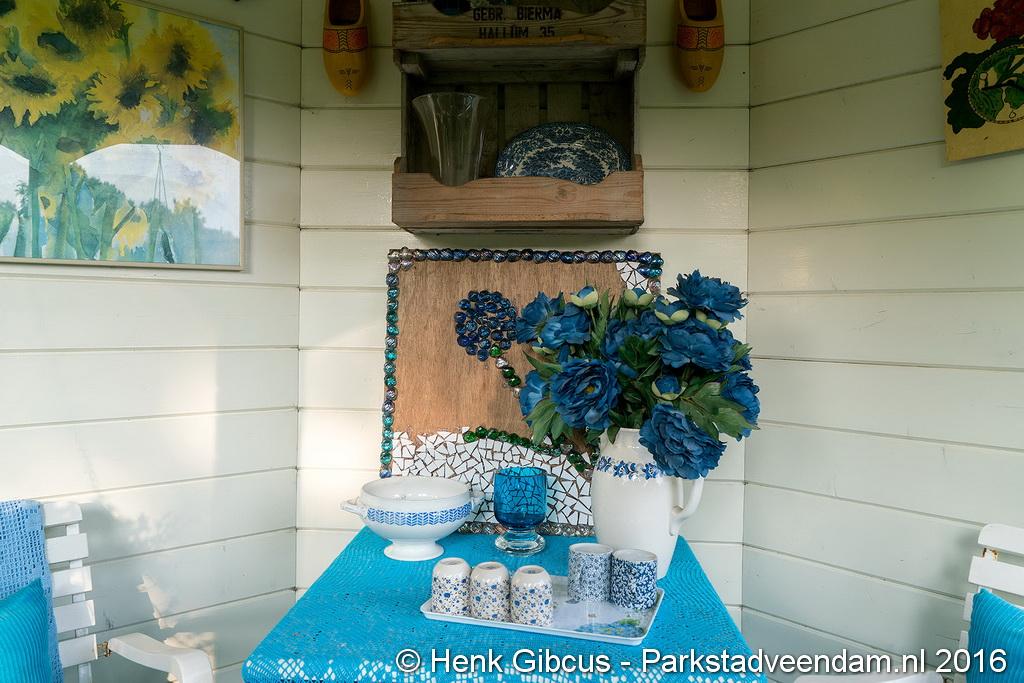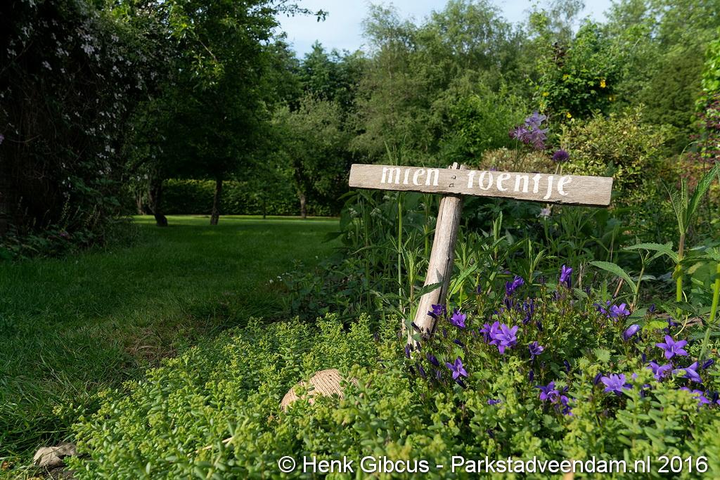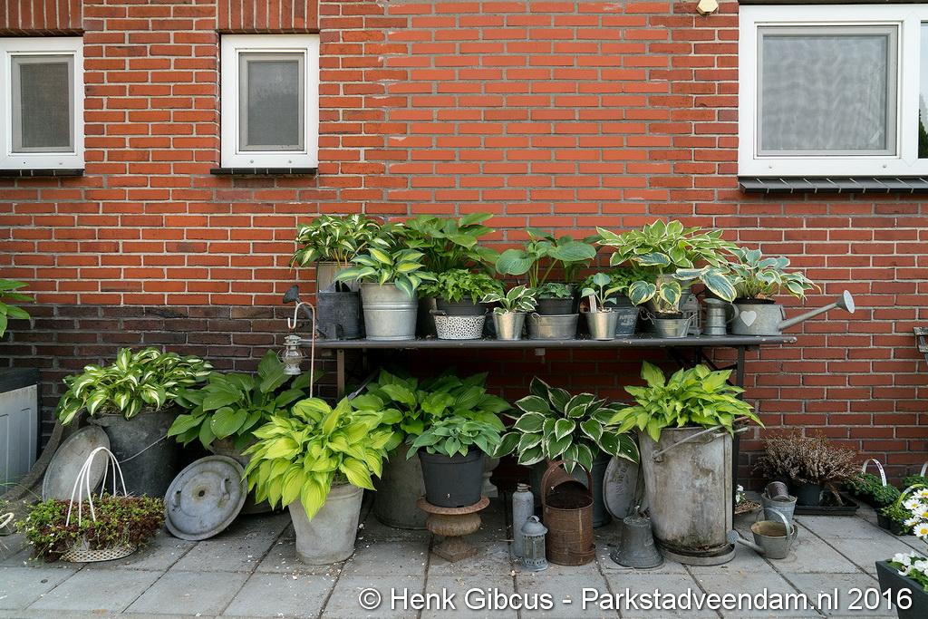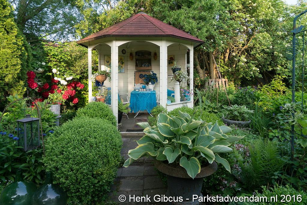 We zijn aangeland op de Landbouwstraat in Wildervank en wel op de nummers 23 en 128. Ondanks dat de nummers ogenschijnlijk ver uit elkaar liggen is het slechts de straat oversteken om beide tuinen te ontdekken. Twee tuinen die totaal van elkaar verschillen, maar zeker ook zaken gemeen hebben. Ben Vegter, agogisch begeleider bij Lentis, heeft een smalle diepe tuin met gezellige pittoreske hoekjes/zitjes, een kronkelpaadje, een prieeltje en komt romantisch over. De tuin bij Ina Laarman is een boerderij-tuin. Zij is  getrouwd met een boer en is naast moeder, oma ook boerin. Ze woont op een boerderij, vandaar die boerderij-tuin! Deze beschikt over een groot verdiept terras (zitkuil), een tuinhuis met veranda, een bostuin, een vijver met vissen, een fruithof en een oud bomenbestand met een linde van meer dan 100 jaar! Wat ze gemeen hebben zijn de kleurrijke gevarieerde bloemenborders, hoewel bij Ben de kleur blauw de boventoon voert. “Blauw geeft diepte in de tuin, het lijkt groter,” vertelt hij enthousiast. Ook het ontwerp, aanleg hebben ze gemeen. Ze hebben namelijk alles zelf gedaan. Ina: “De terrassen en paadjes heb ik zelf gelegd met waterpas en al,” en ze kijkt erbij alsof ze haar rug nog voelt! Gemeenschappelijk hebben ze ook dat het een échte liefhebberstuin is. Géén rariteiten of exotische aanplant, maar “gewoon” gangbaar spul van de super, Praxis of Gerards Bloemenkas. Een enkele keer laten ze zich verleiden door de aankoop van een ondersoort of cultivar (variëteit die bij het kweken is ontstaan) bij Foltz in Meeden.