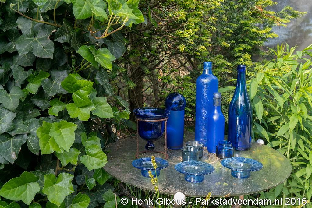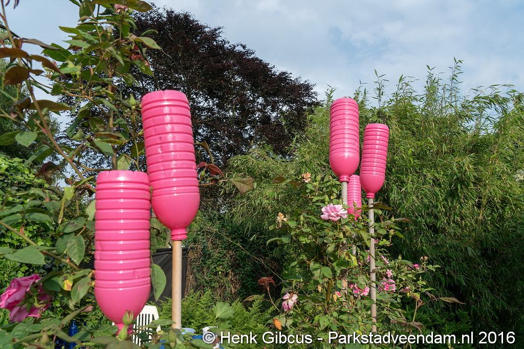 Ina is met geheel andere dingen bezig. Zij knutselt heel wat af. Nu heeft ze weer waterballonnen gevuld en die bedekt met een soort plamuur/vulmiddel. Nadat dit uitgehard is laat ze de ballon leeglopen en schildert ze de buitenkant, liefst blauw! “Staat erg leuk op een stok of driepoot tussen de plantjes,” glimlacht ze spontaan. Ook beschildert ze flessen bijvoorbeeld roze en zet die op stokken van verschillende hoogtes tussen de bloeiende rozen met dezelfde kleur! “Op deze manier kleed ik de tuin een beetje aan.”