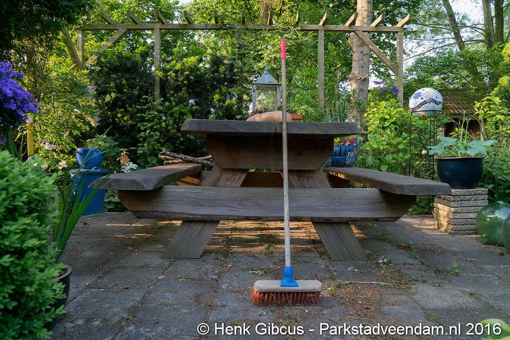 Ben zit veel onder de overkapping – vrij en eveneens uit de wind. Het mooiste plekje bij hem is bij het prieel. Na een enerverende werkdag is het hier zalig bijkomen. Als het erg warm is zet hij de poort open, zodat er wat wind doorheen kan waaien en dit voor verkoeling zorgt.