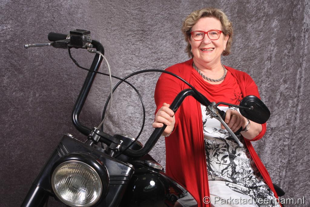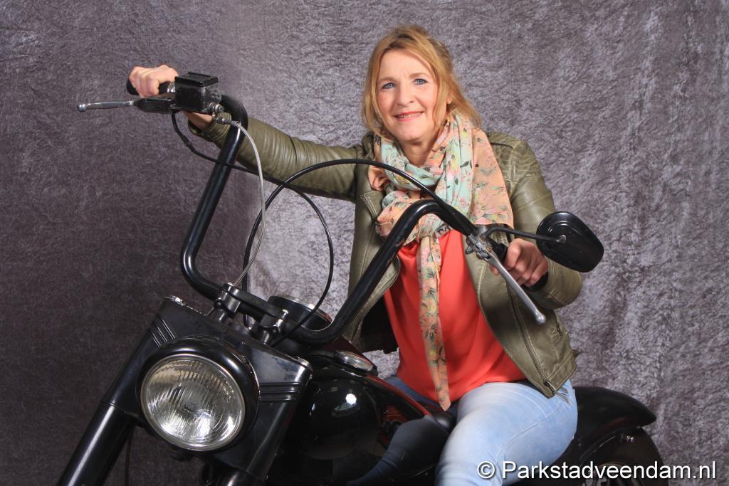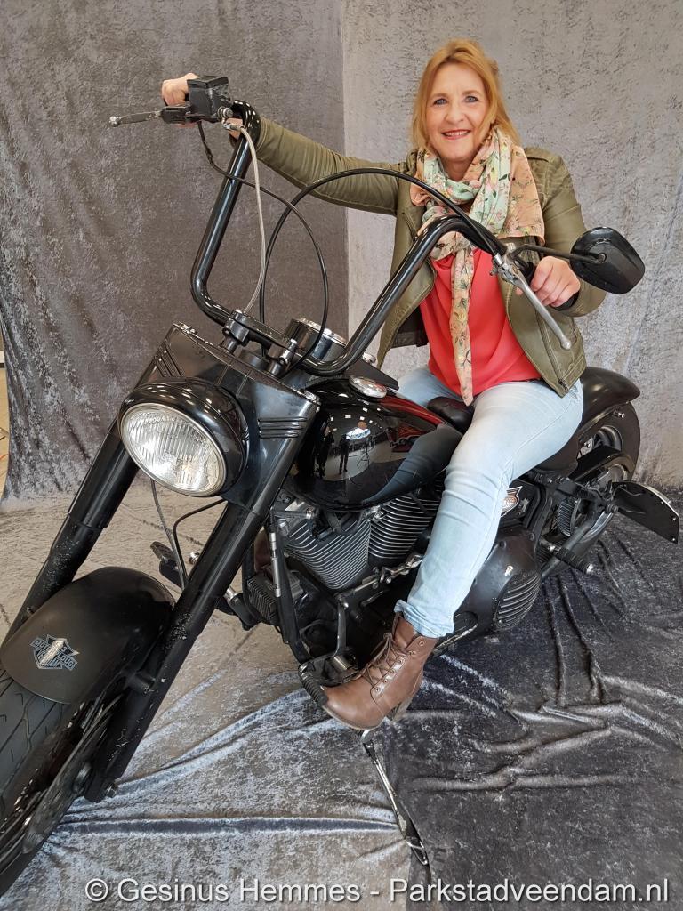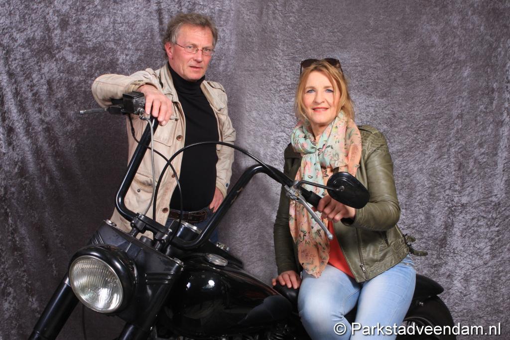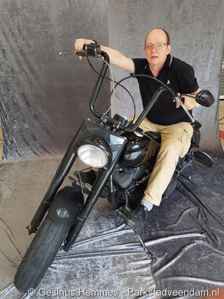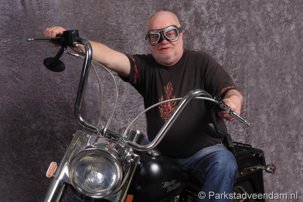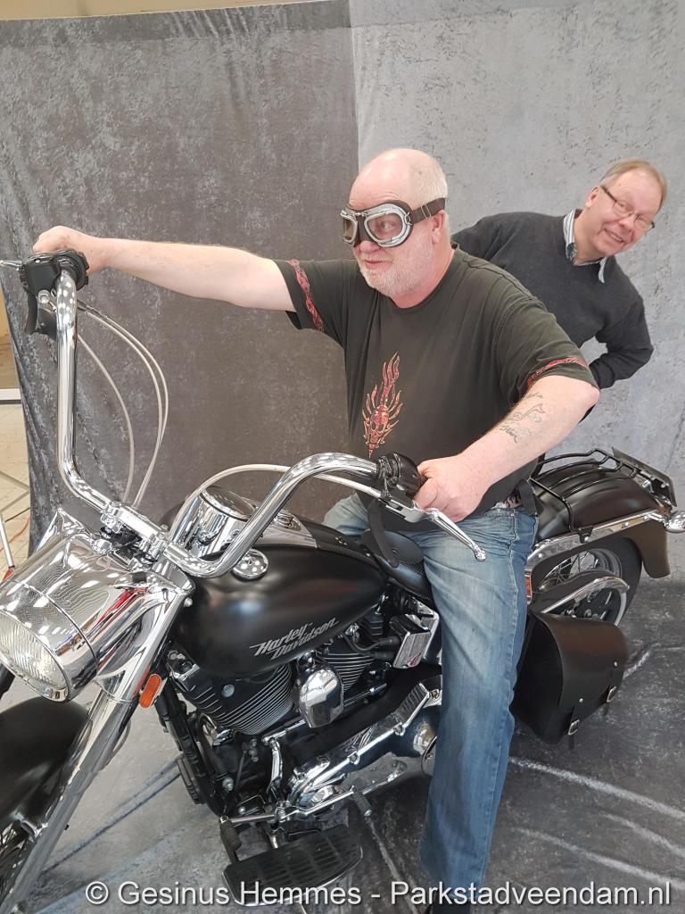 Ronnie Meijer was er de hele tijd bij. In de middaguren waren vier clubgenoten van hem ook even komen kijken. En natuurlijk waren ze op hun Harley’s komen aanrijden. Het typerende geluid van de vier machines weerklonk gelijktijdig in de hal. Ze waren prachtig opgepoetst en stonden klaar om in de fotoshoot opstelling gewisseld te worden. Natuurlijk zijn ook de eigenaren zelf op portret gekomen. Pé Langen had een vintage helm met motorbril uitgeleend en had ook even op de motor plaatsgenomen.