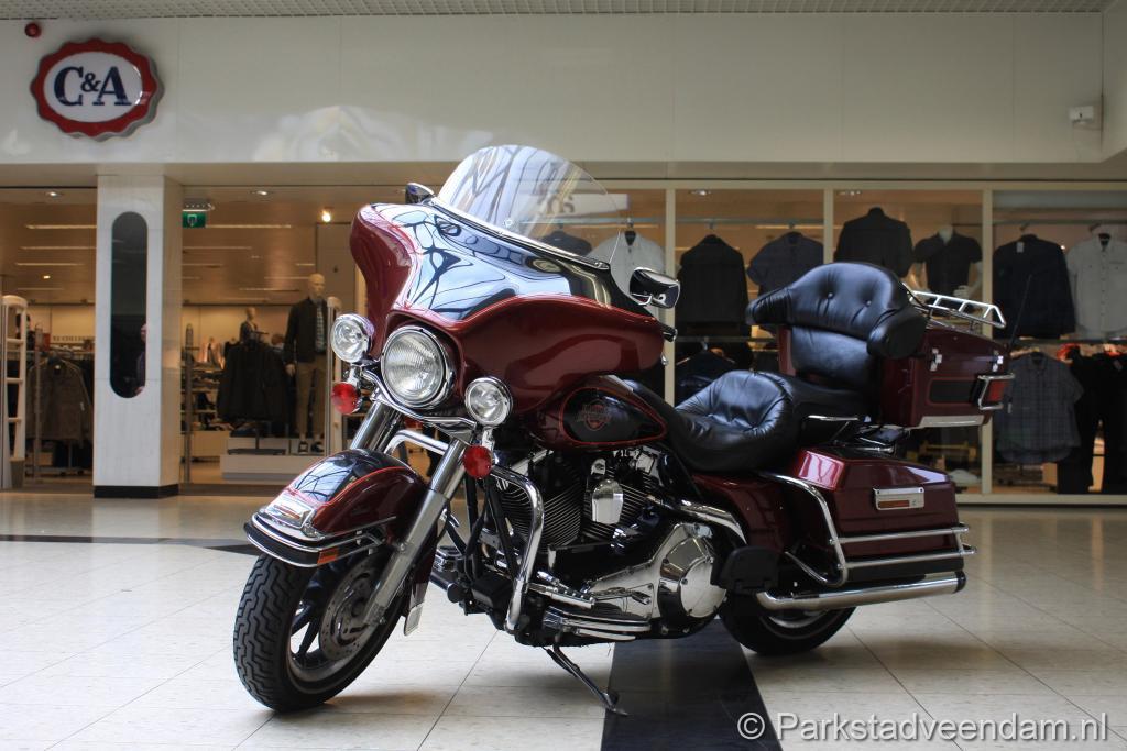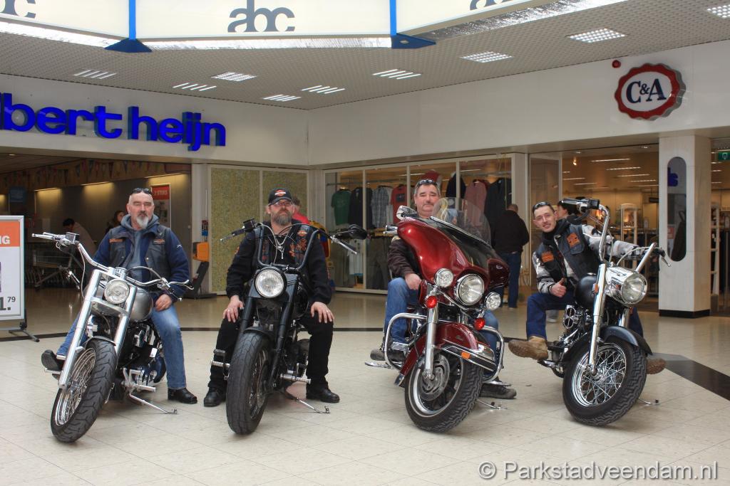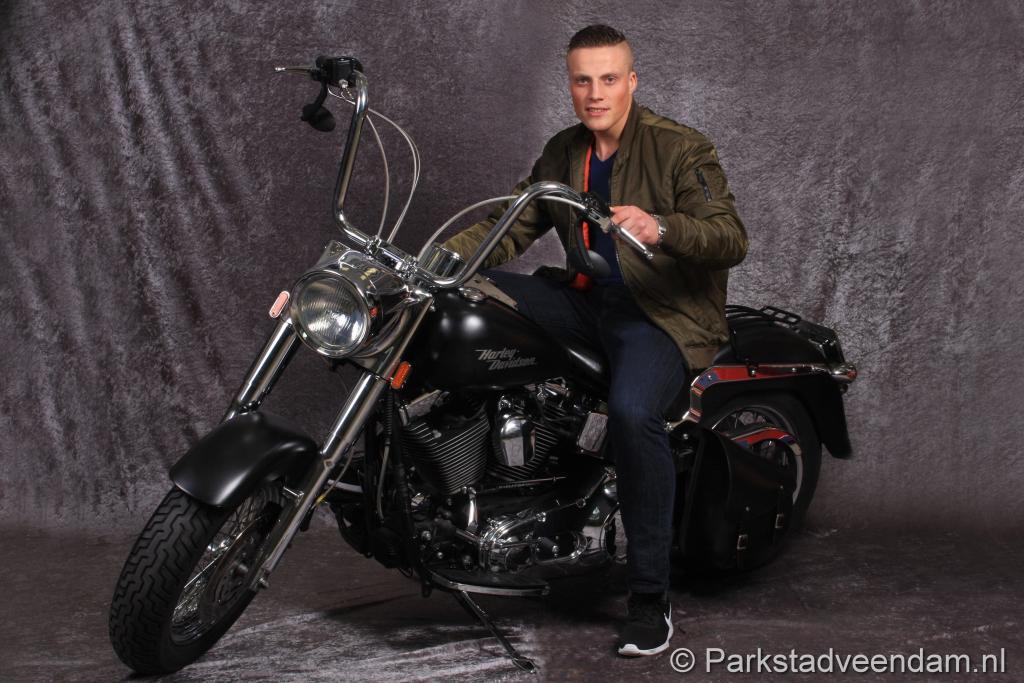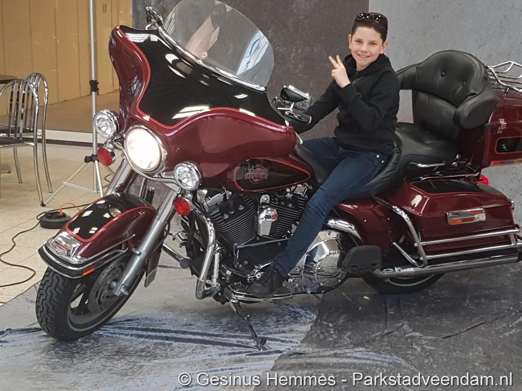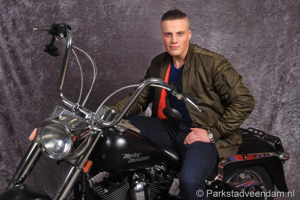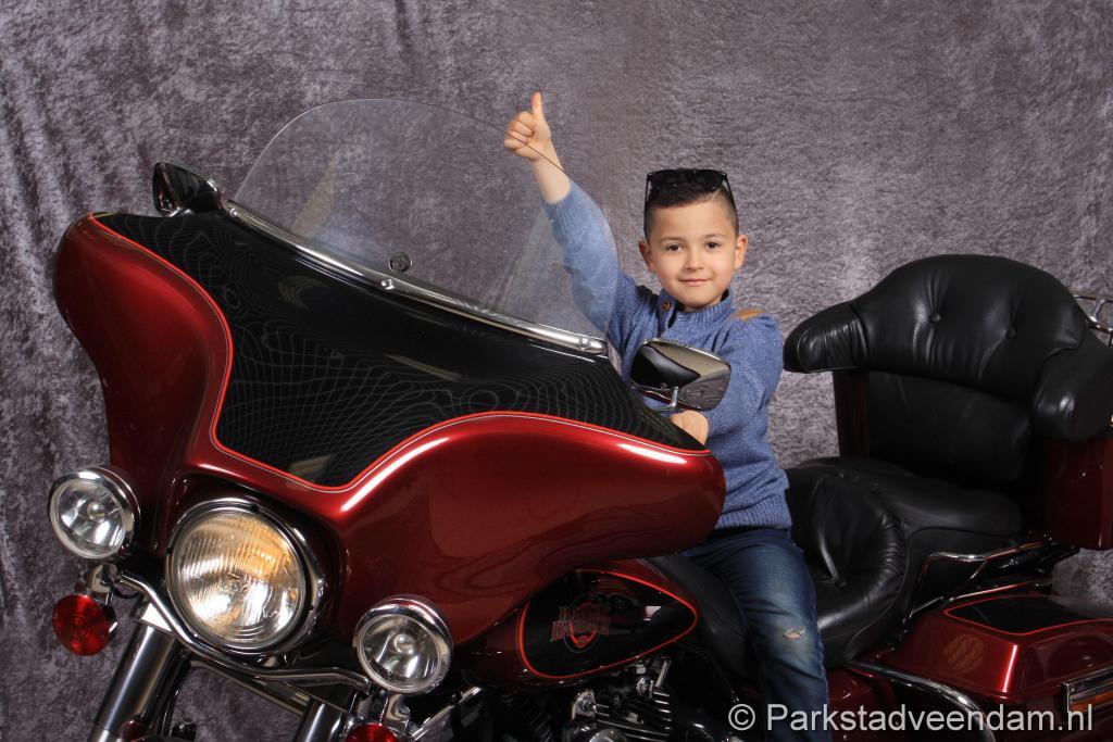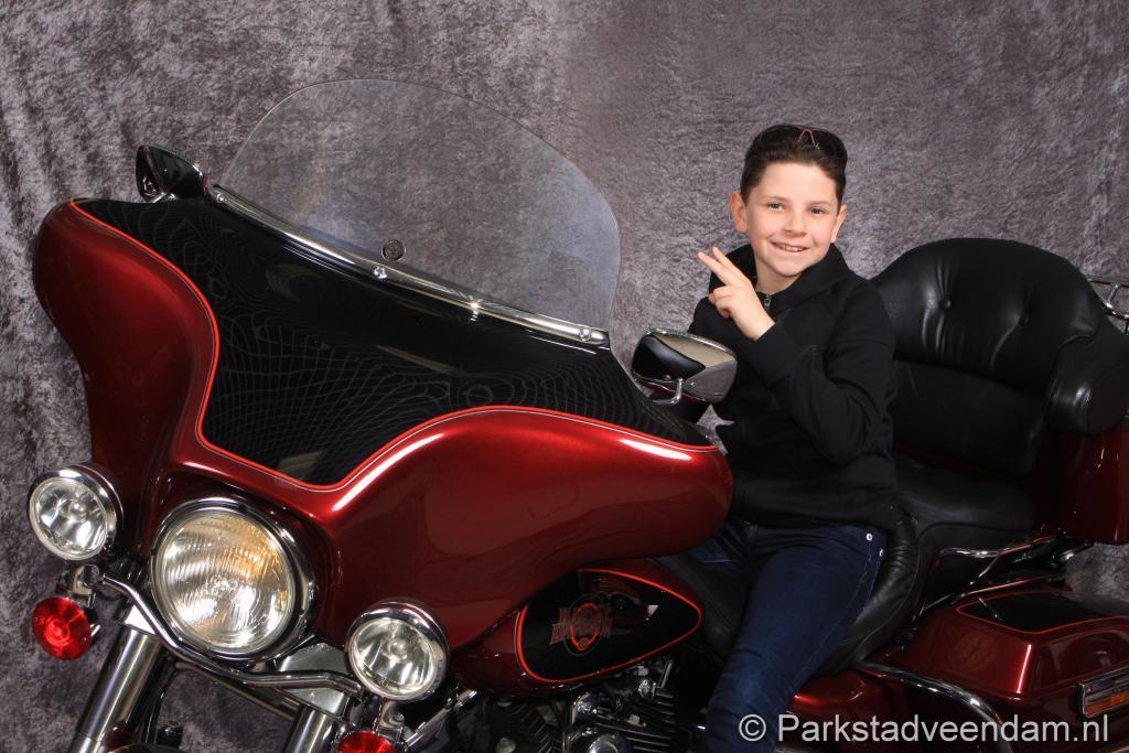 Ronnie Meijer was er de hele tijd bij. In de middaguren waren vier clubgenoten van hem ook even komen kijken. En natuurlijk waren ze op hun Harley’s komen aanrijden. Het typerende geluid van de vier machines weerklonk gelijktijdig in de hal. Ze waren prachtig opgepoetst en stonden klaar om in de fotoshoot opstelling gewisseld te worden. Natuurlijk zijn ook de eigenaren zelf op portret gekomen. Pé Langen had een vintage helm met motorbril uitgeleend en had ook even op de motor plaatsgenomen.