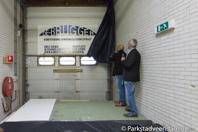 Met deze woorden trekt Glenn aan een koord waardoor een doek omhoog gaat. Het bord met een logo van De Bruggen wordt onthuld. Het bord wordt binnen onthuld omdat het deze middag regent maar het is de bedoeling dat hij buiten wordt op gehangen.