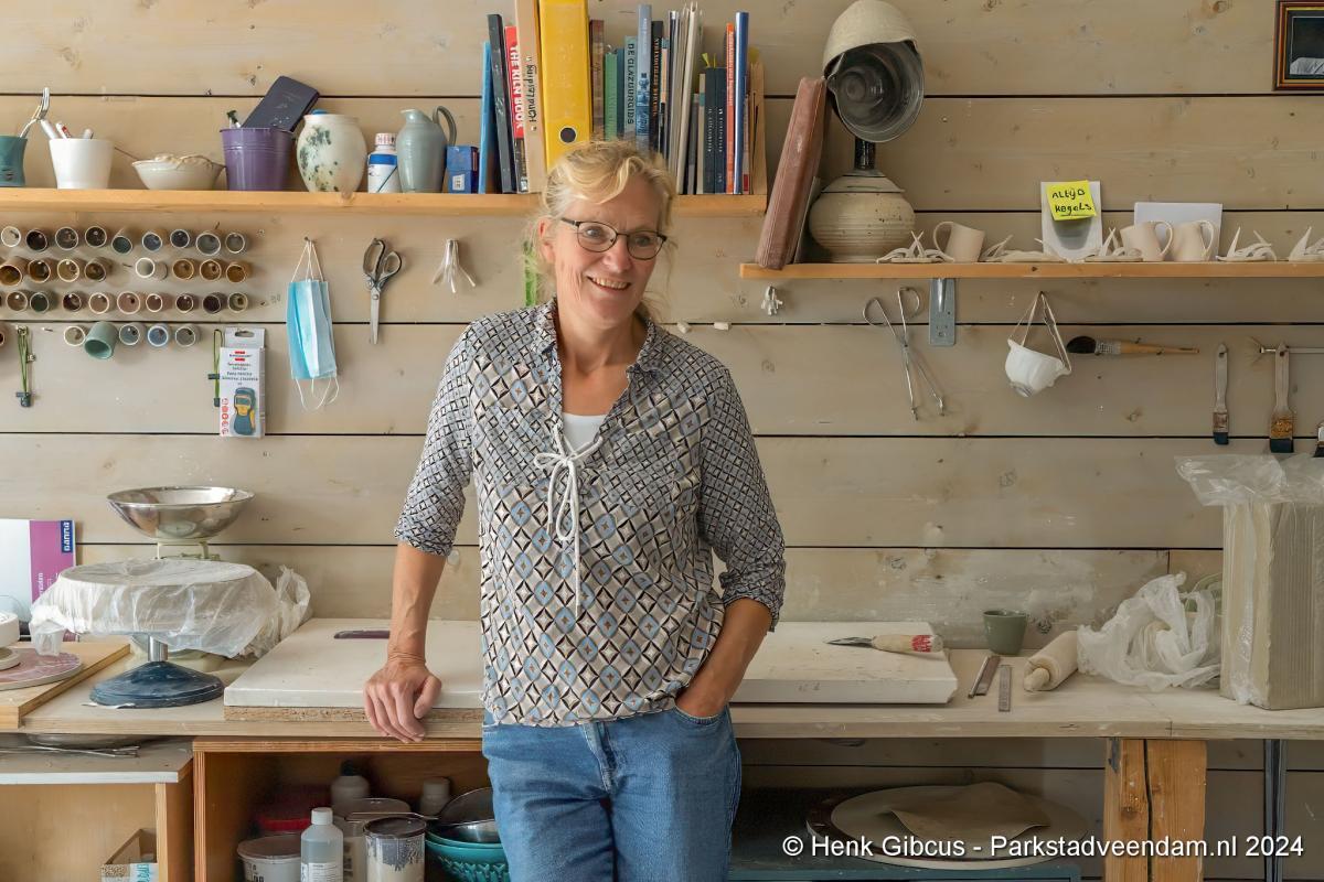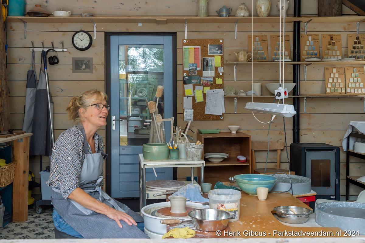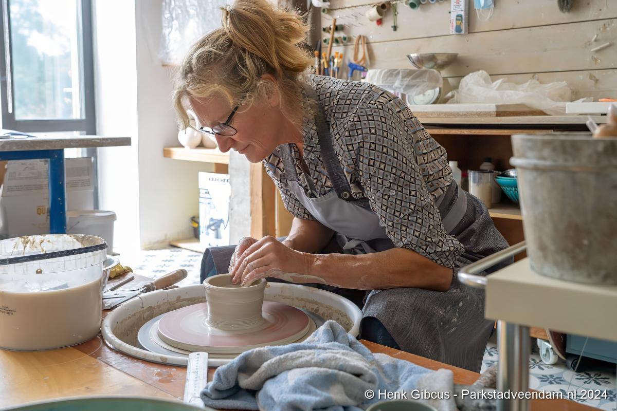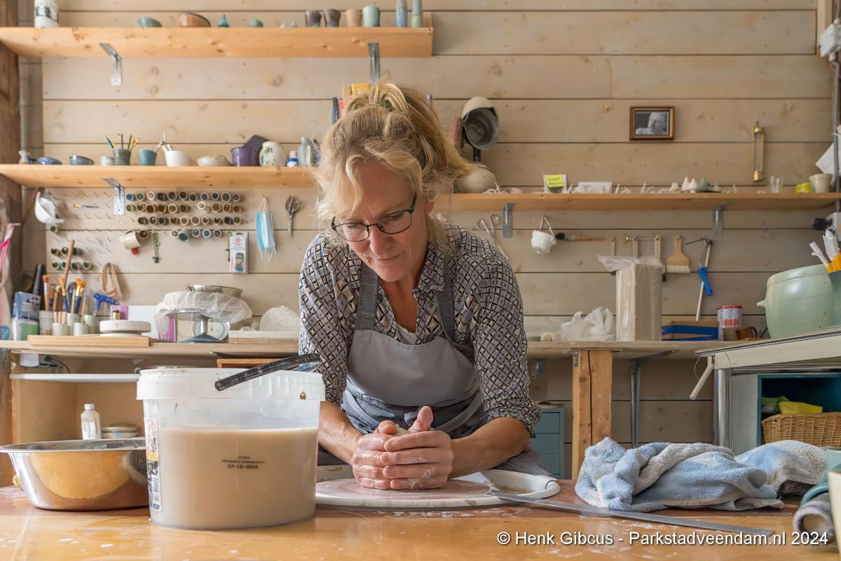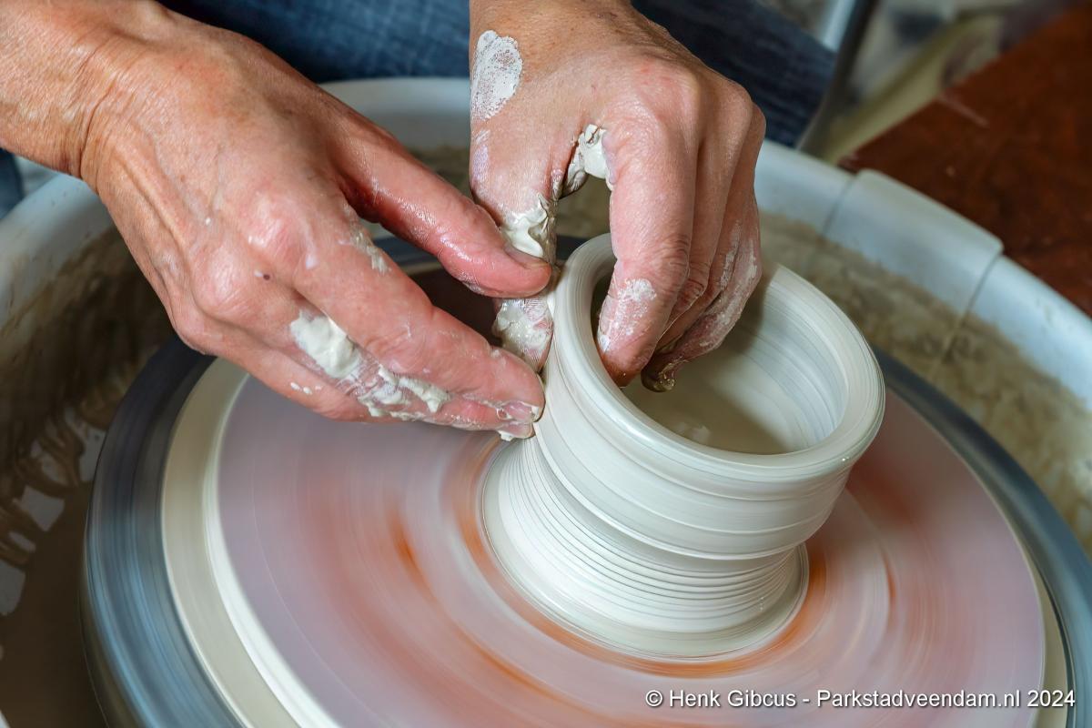 Voorafgaand aan het interview mogen we eerst haar atelier bewonderen. In haar volledig toegeruste werkruimte geeft ze een korte demonstratie. Een stuk klei wordt op de draaischijf gelegd. Haar handen vouwt ze om de klei en dan begint het draaien, beetje water erop en weer verder. Wow, dat ziet er goed uit en oh, wat lijkt dat gemakkelijk. De nadruk ligt op lijkt, want voordat je zover bent, ben je een aantal stappen en weken/maanden verder. Dat doe je niet zomaar even…