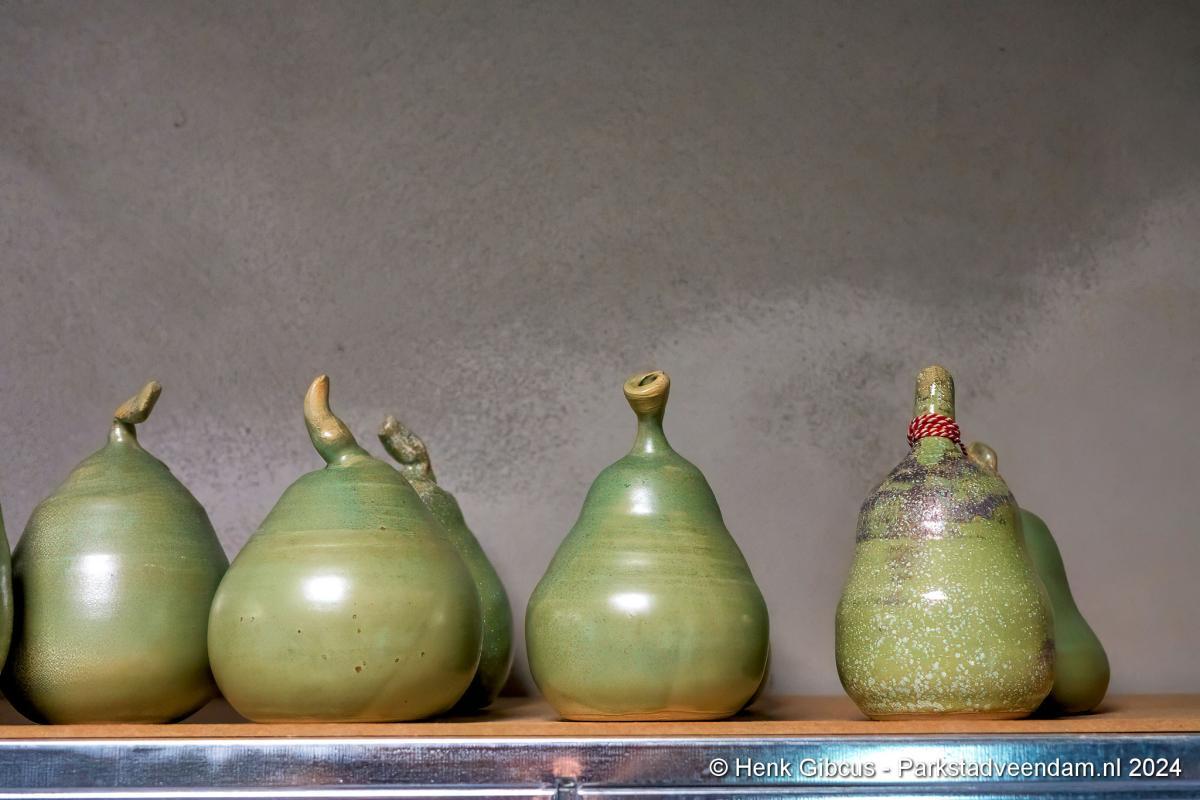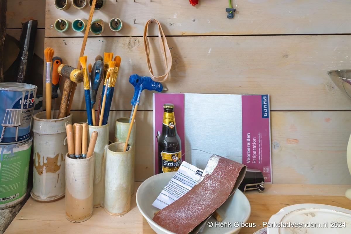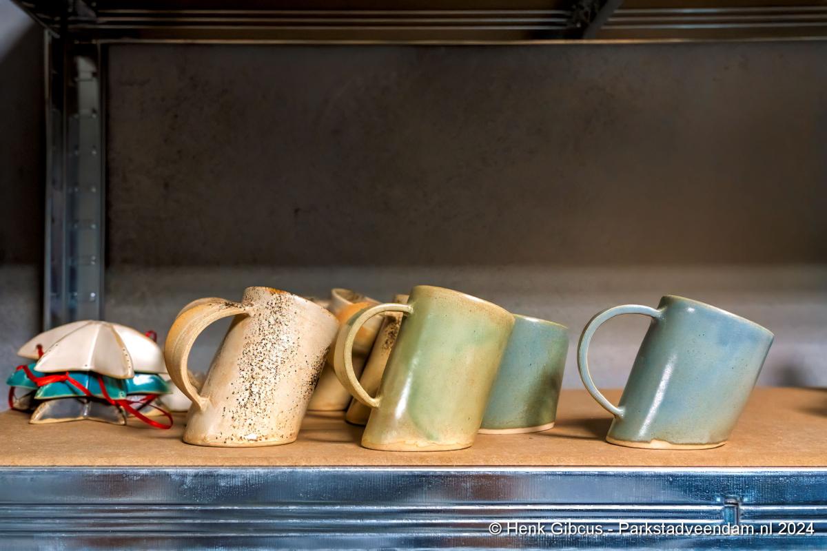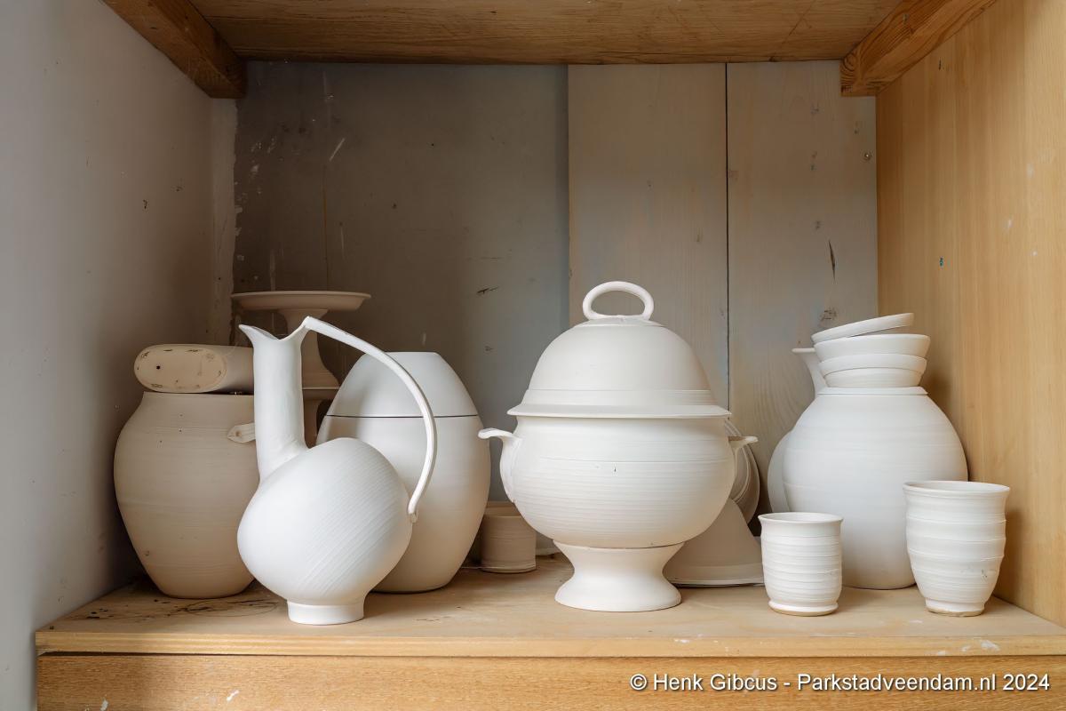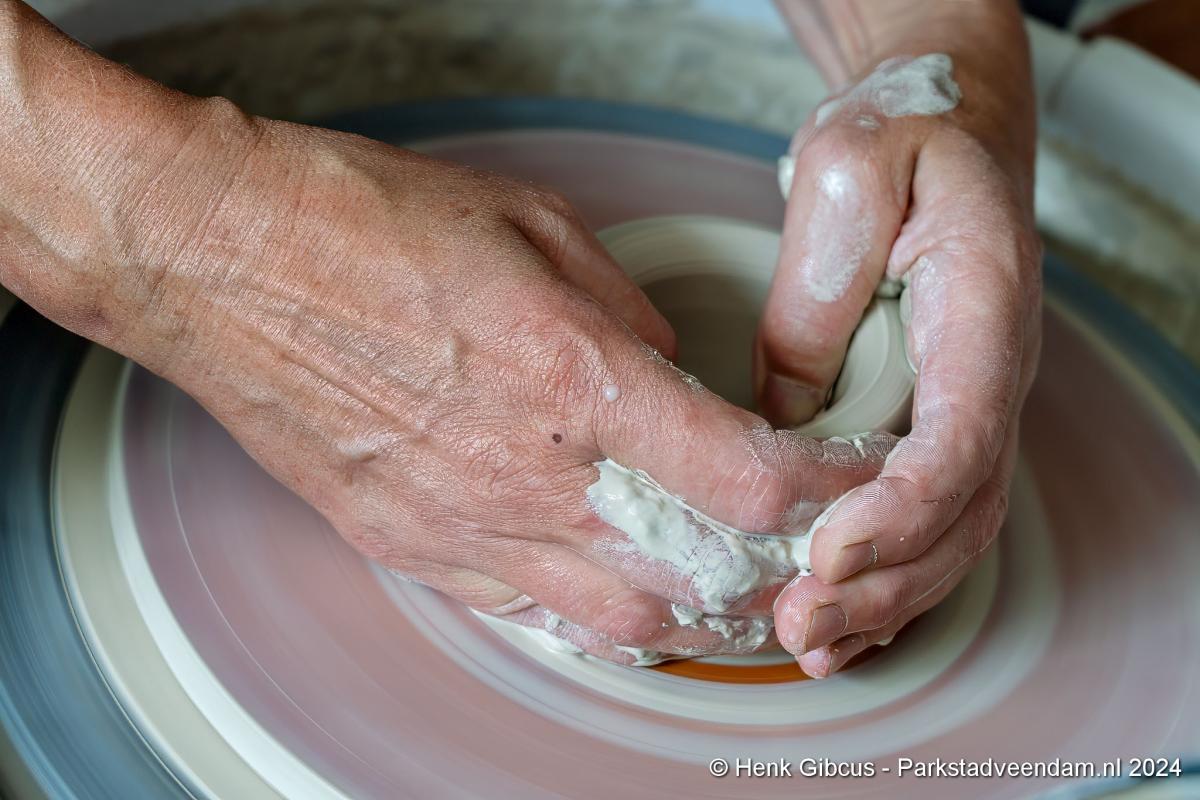 Voorafgaand aan het interview mogen we eerst haar atelier bewonderen. In haar volledig toegeruste werkruimte geeft ze een korte demonstratie. Een stuk klei wordt op de draaischijf gelegd. Haar handen vouwt ze om de klei en dan begint het draaien, beetje water erop en weer verder. Wow, dat ziet er goed uit en oh, wat lijkt dat gemakkelijk. De nadruk ligt op lijkt, want voordat je zover bent, ben je een aantal stappen en weken/maanden verder. Dat doe je niet zomaar even…