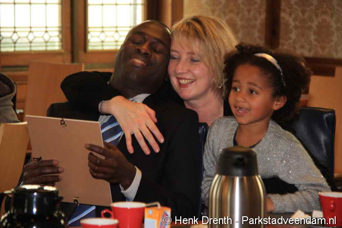 Burgemeester Swierstra feliciteerde als eerste de 'naturalisandi' voor het Nederlanderschap. Met zichtbare blijdschap bij de deelnemers.
