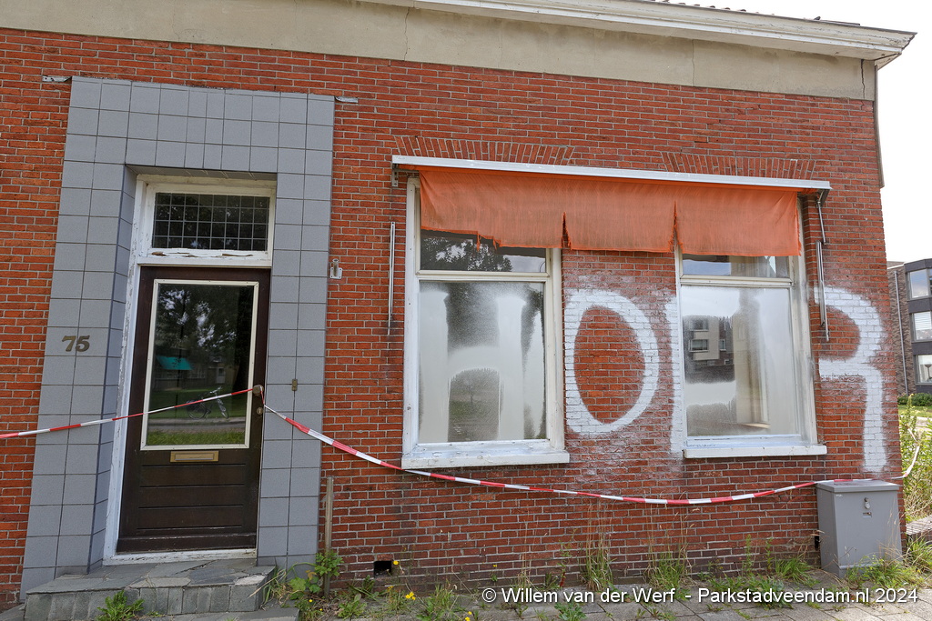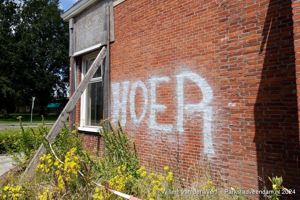 Een woning op de hoek van het Boven Westerdiep - Julianalaan in Veendam is beklad. De woning die al geruime tijd leeg staat werd onlangs nog afgezet met lint en hekwerk.