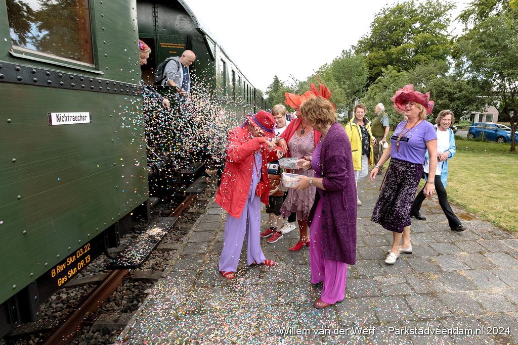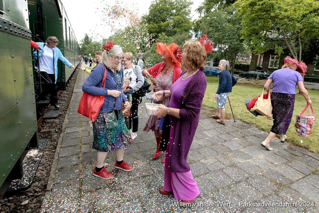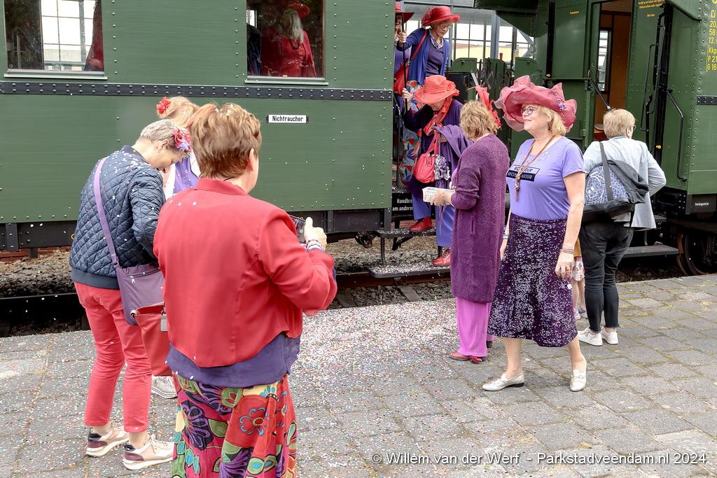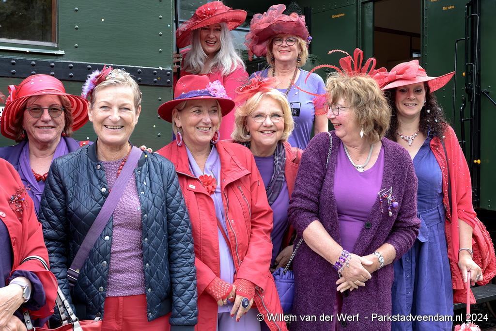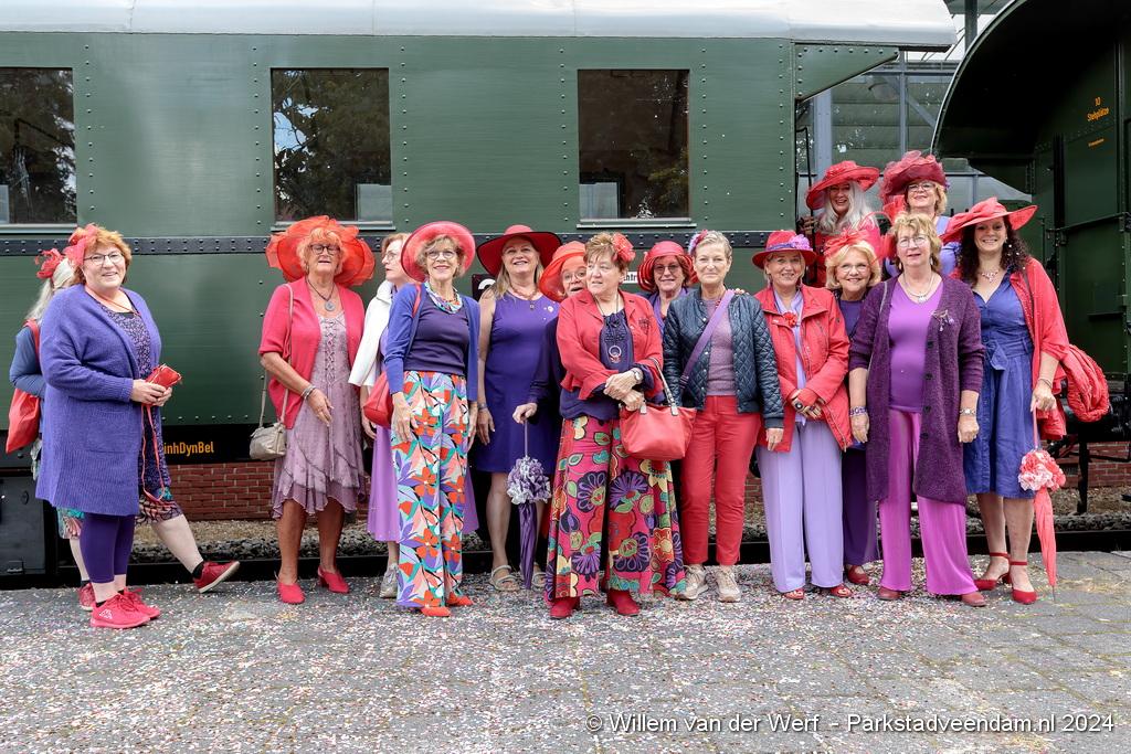 En daar stonden ze dan plotseling in Veendam, met de STAR trein  vanuit Stadskanaal aangekomen. Vijftien dames allemaal in rood paars gekleed, van de Red Hat Society om het mooie van Veendam te verkennen en vervolgens te lunchen bij Brouwhotel Parkzicht. Onder de dames was ook Chris Ubels van Kars Potze mannenmodezaak aanwezig.