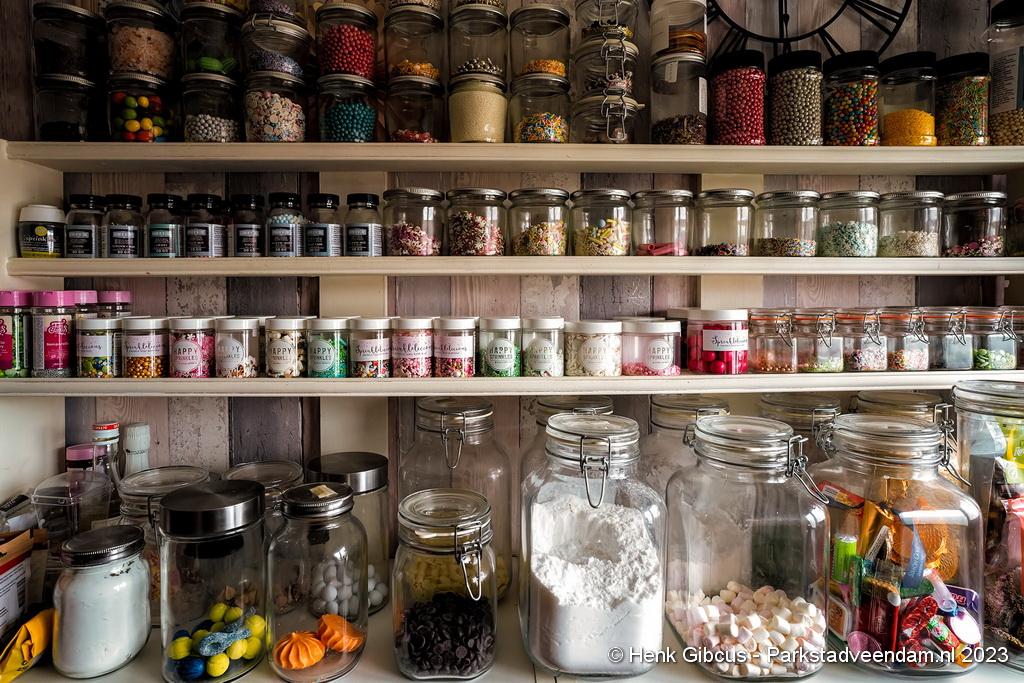 Als dit allemaal voltooid is, gaat Joke met enorm veel plezier aan de slag in haar eigen atelier. Nou ja atelier? Ja, toch wel hoor. Een van de slaapkamers is omgebouwd tot een ware bakkerij. Alles ligt of staat binnen handbereik. Een oventje, de klutsmachine, de koelkast, de broodbakmachine, de voorraad grondstoffen en andere ingrediënten, de ruimte is uiterst efficiënt ingericht. Het rvs-werkblad is gemakkelijk schoon te maken én hygiënisch. Het is een complete snoepwinkel!