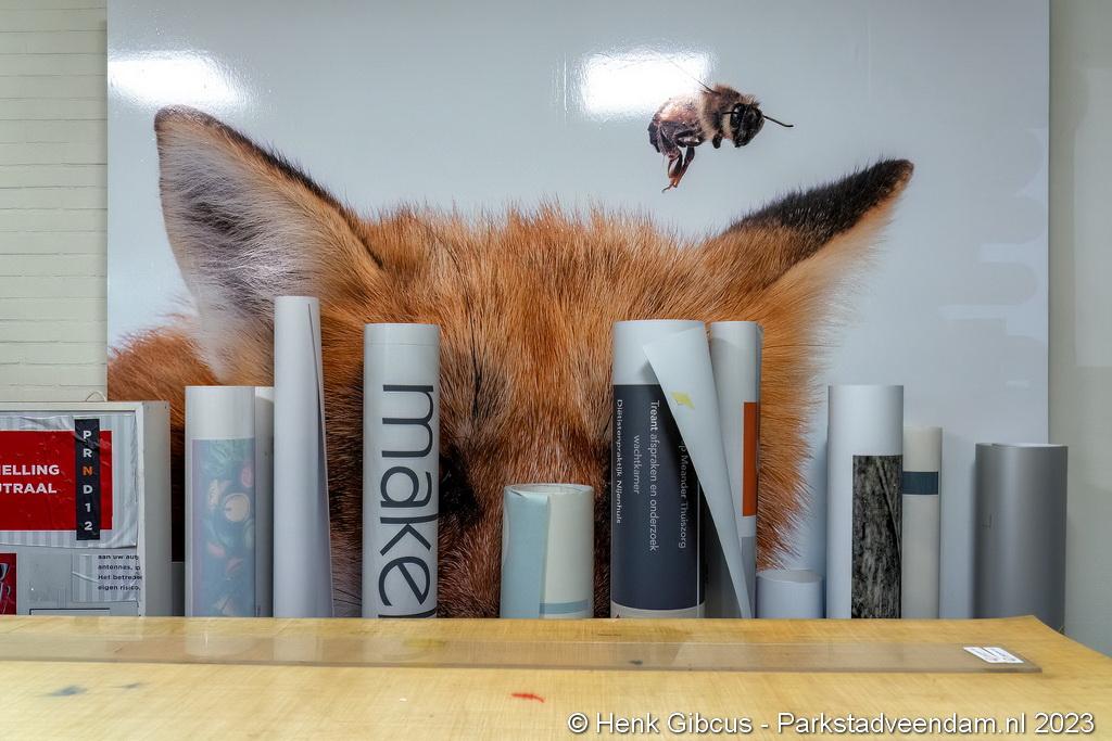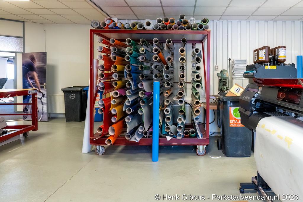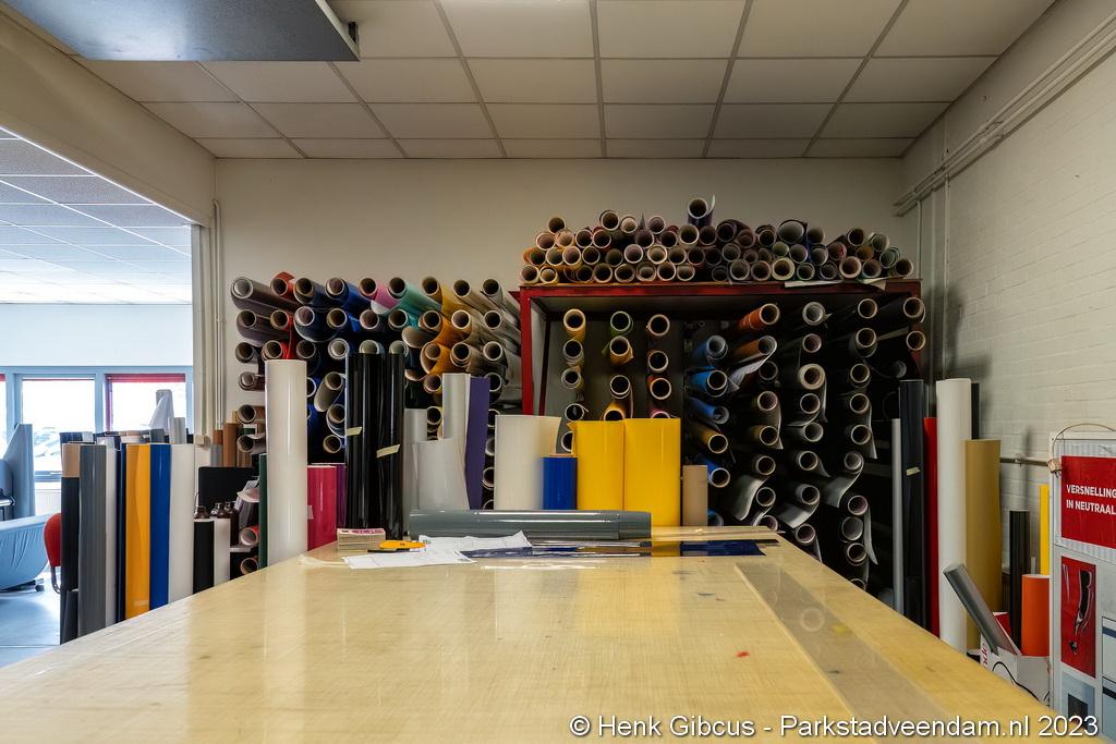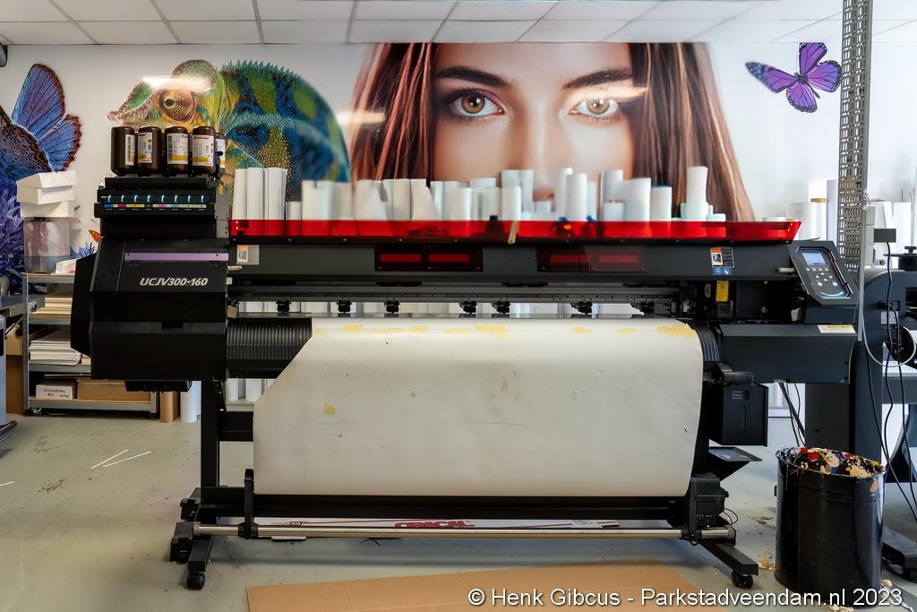We mogen een kijkje nemen achter de schermen. Alles wordt vanaf, zeg maar kantoor, digitaal aangestuurd. In de productieruimte enorme hoeveelheden rollen met folie in allerhande kleuren. Een van de printers is maar liefst 1.60 m breed, werkt met led full color techniek. De afbeelding of letters worden d.m.v. deze techniek op de ondergrond gedrukt met speciale UV-bestendige inkt. Om de duurzaamheid te vergroten gaat het ontwerp nog door een lamineermachine, waardoor er een extra laag wordt aangebracht ter bescherming. Deze printer kan zowel de bovengenoemde folie als papier, textiel, behang, canvas, diverse stoffen en andere materialen bedrukken!