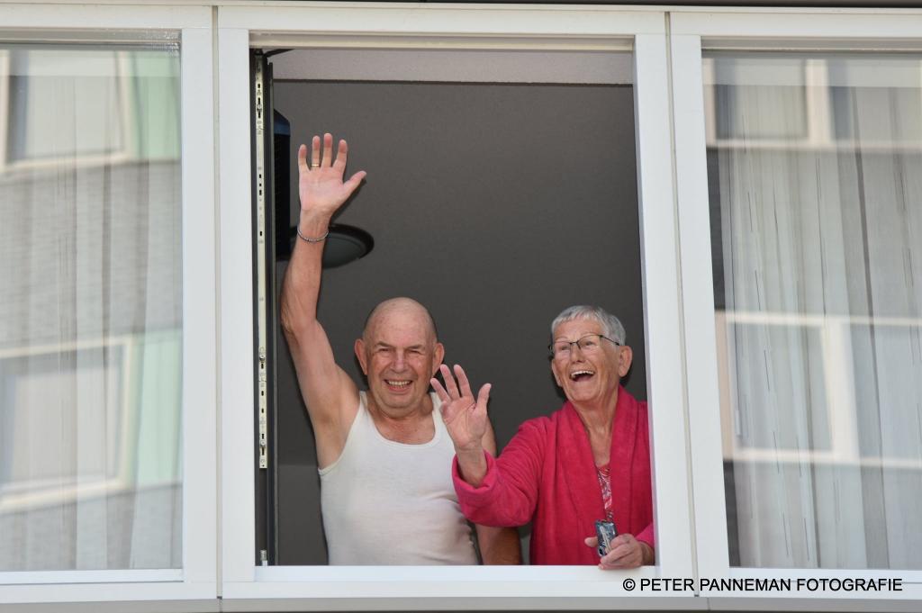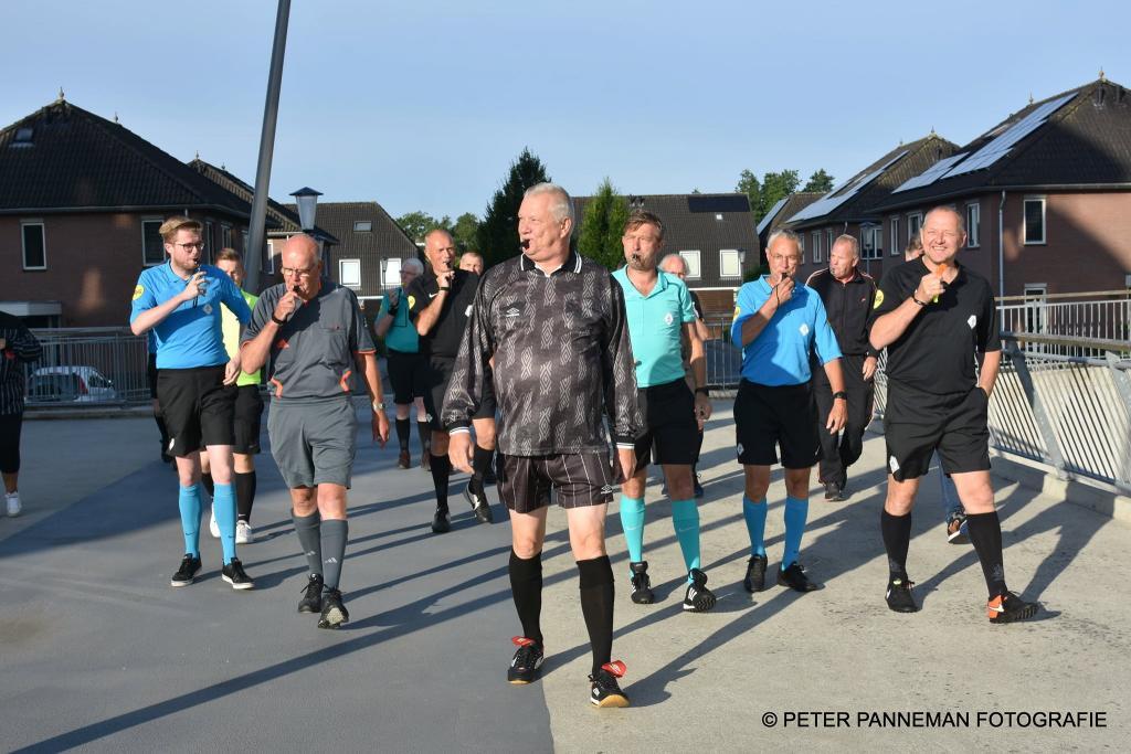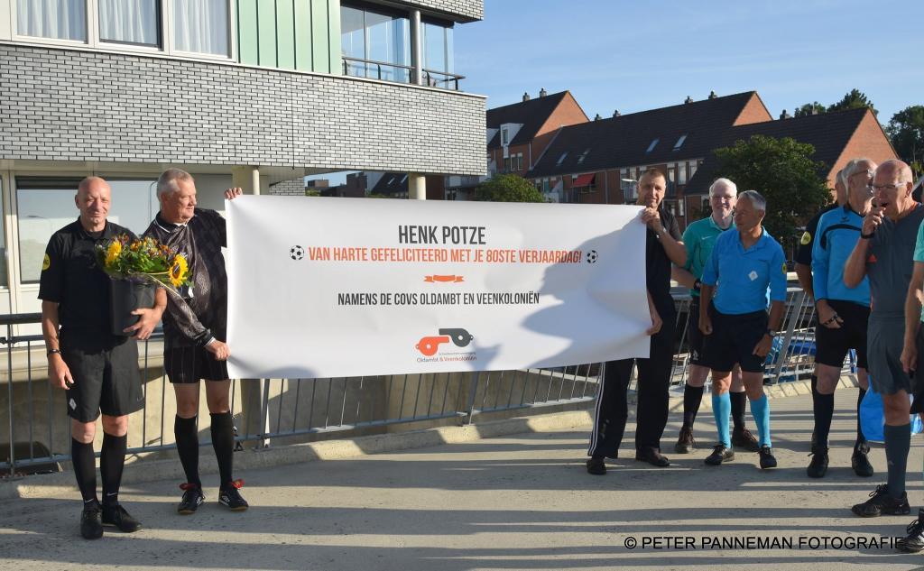 Verbazing alom bij Henk Potze die vrijdagmorgen om 07.30 uur in het bijzijn van zijn vrouw Janny door maar liefst 20 scheidsrechters van COVS Oldambt en Veenkoloniën in tenue, uit zijn bed werd gefloten. Reden voor deze bijzondere wekservice is het feit dat Henk vandaag zijn 80-jarige verjaardag viert. Henk mocht een spandoek ,taart en bloemen voor Janny in ontvangst nemen.