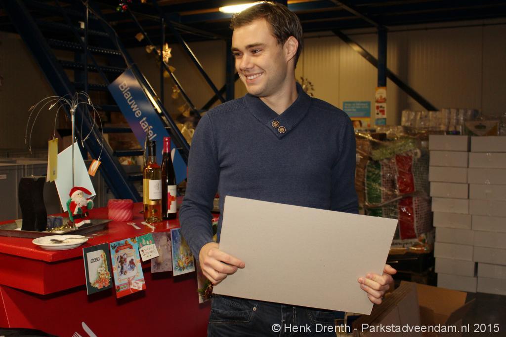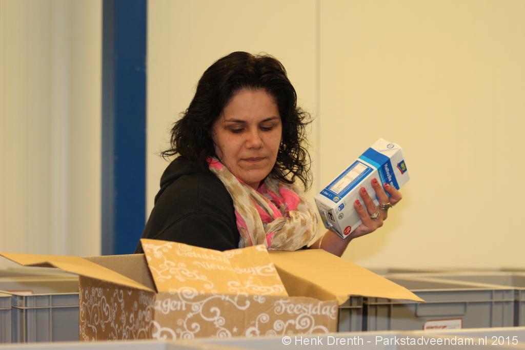 Tussen de bedrijven door werd door particuliere gevers een tiental dozen met kerstkransjes gebracht. Een van de vrijwilligers maakte zich even vrij om deze in ontvangst te nemen.