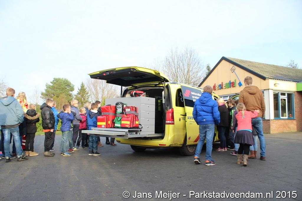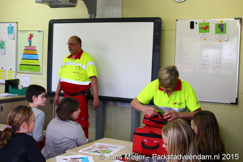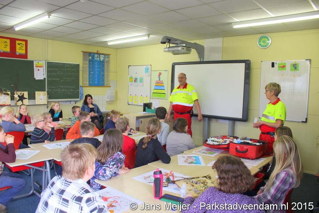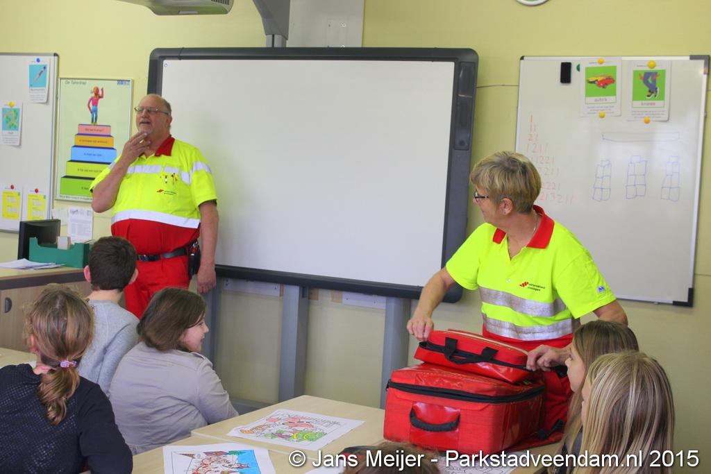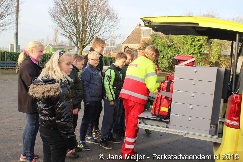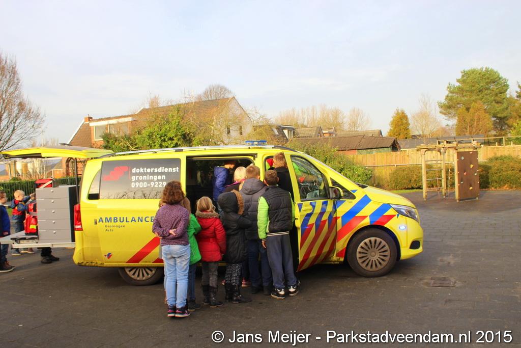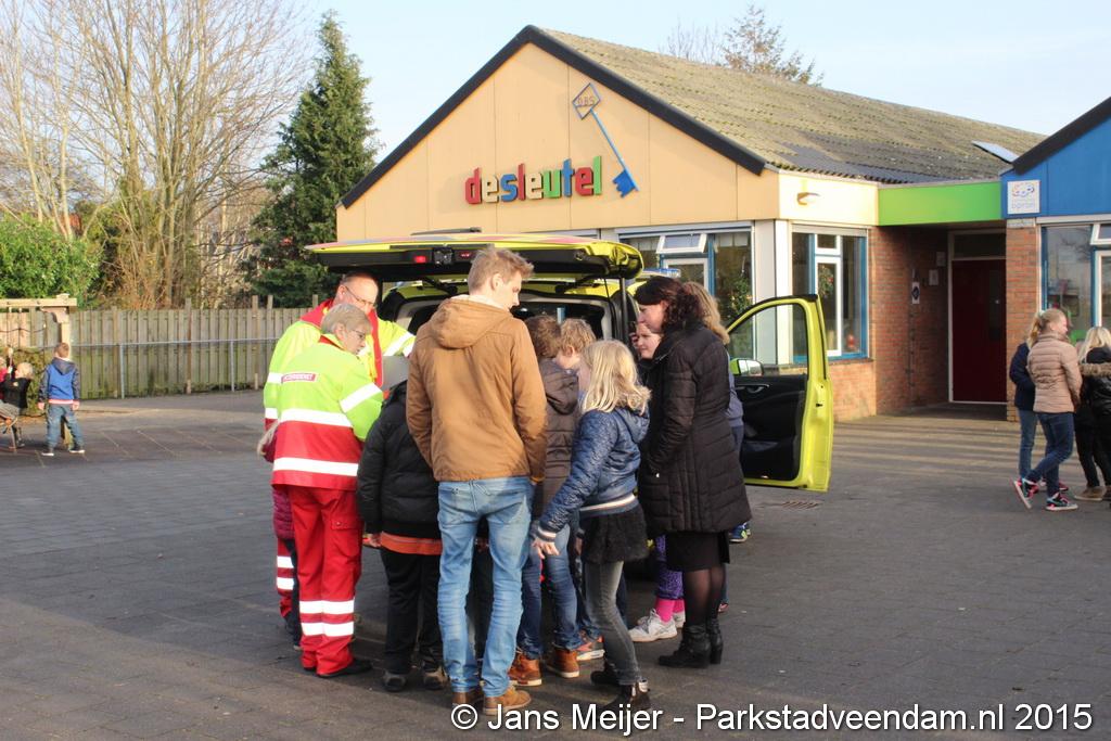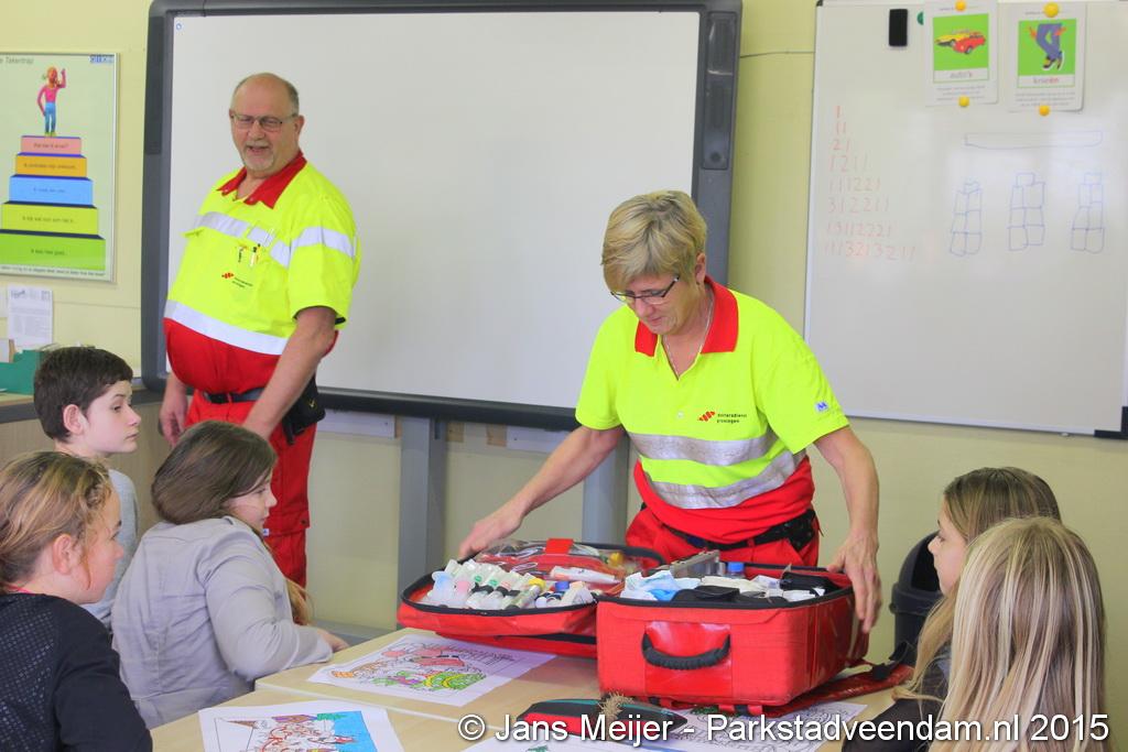 In de klas kregen de kinderen uitleg over de doktersdienst en mochten ze kijken wat de dokter en chauffeurs allemaal bij zich had in zijn dokterstas en mochten ze ook nog even een kijkje in de auto nemen
