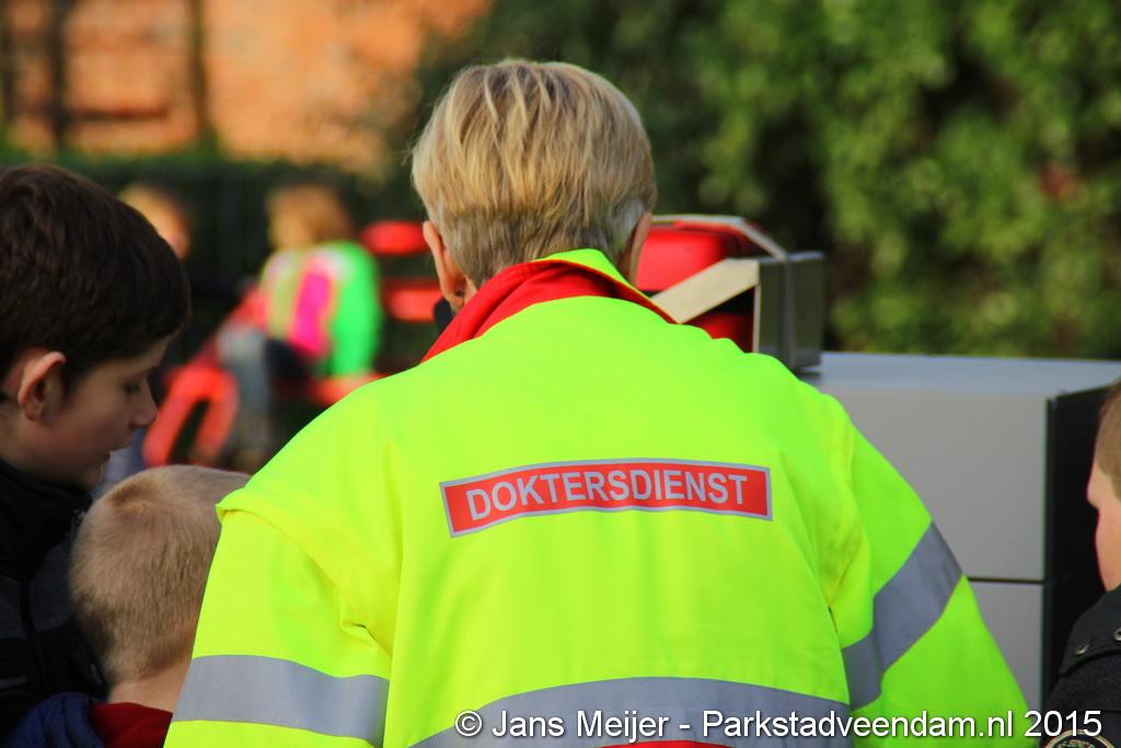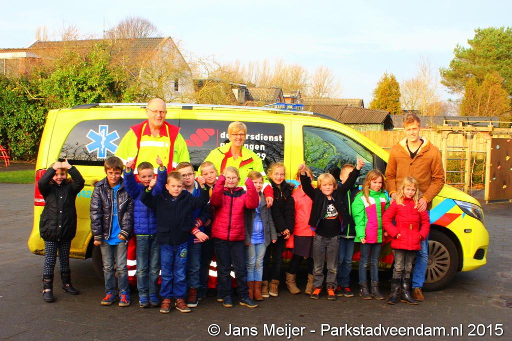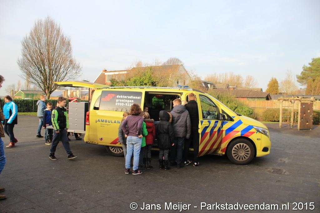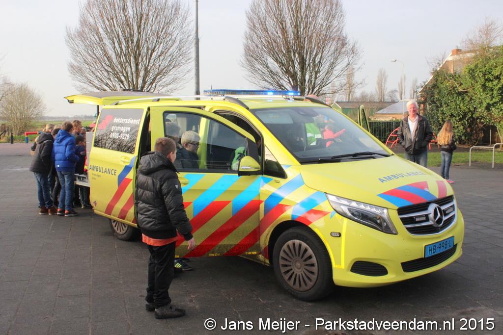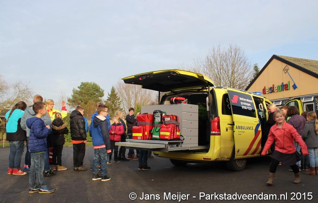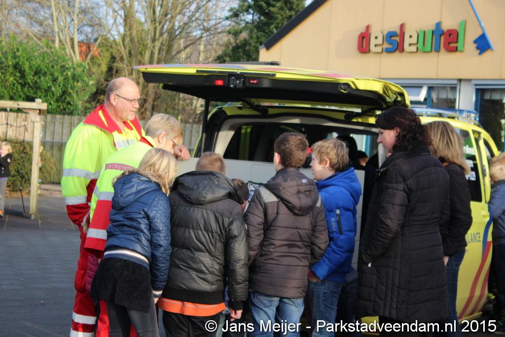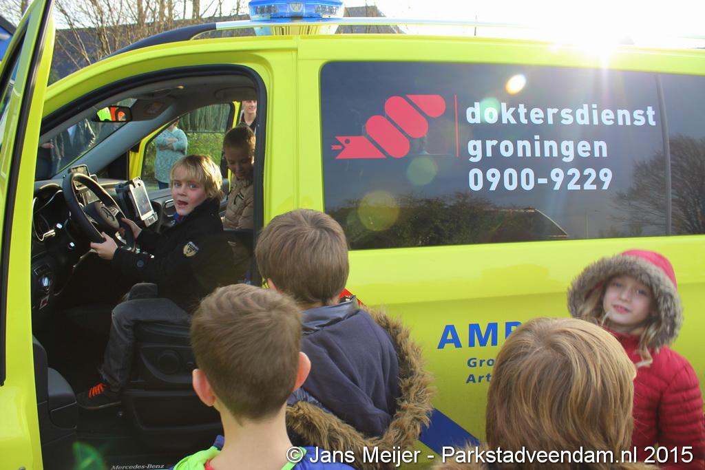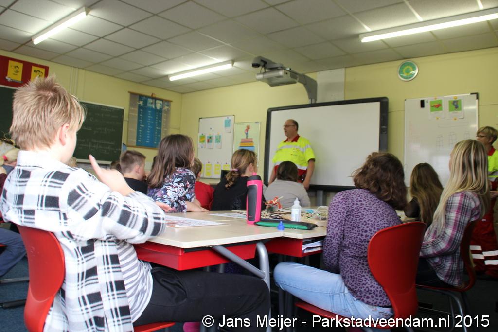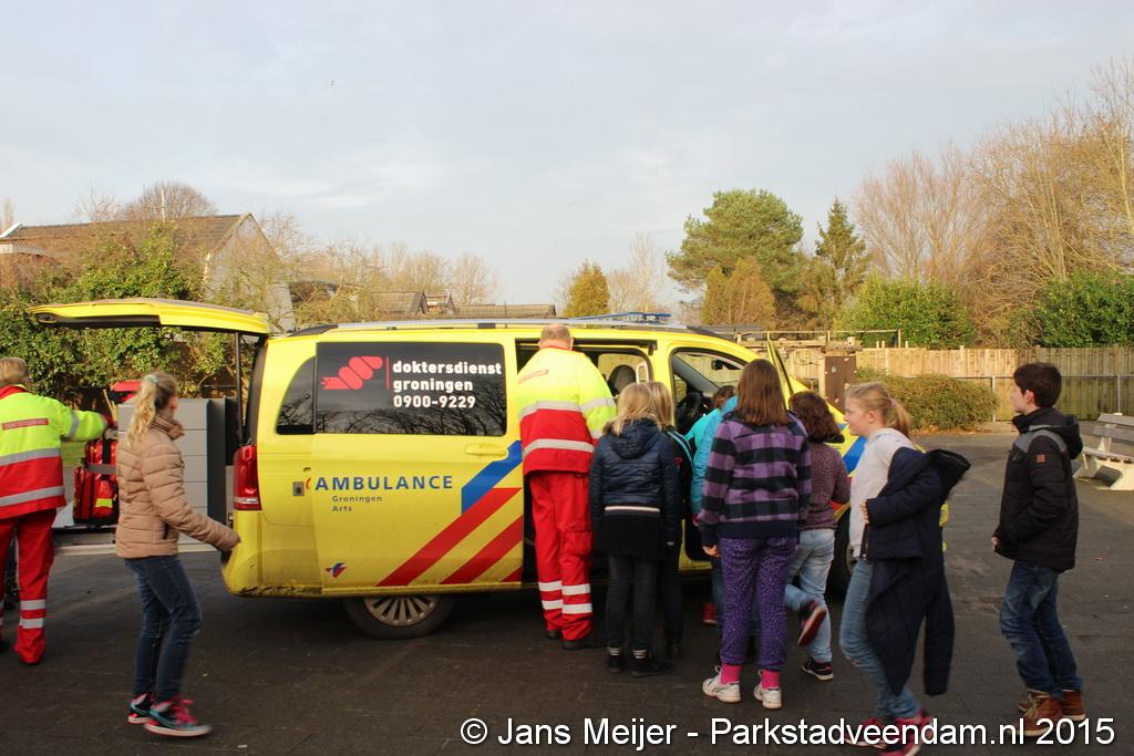 In de klas kregen de kinderen uitleg over de doktersdienst en mochten ze kijken wat de dokter en chauffeurs allemaal bij zich had in zijn dokterstas en mochten ze ook nog even een kijkje in de auto nemen