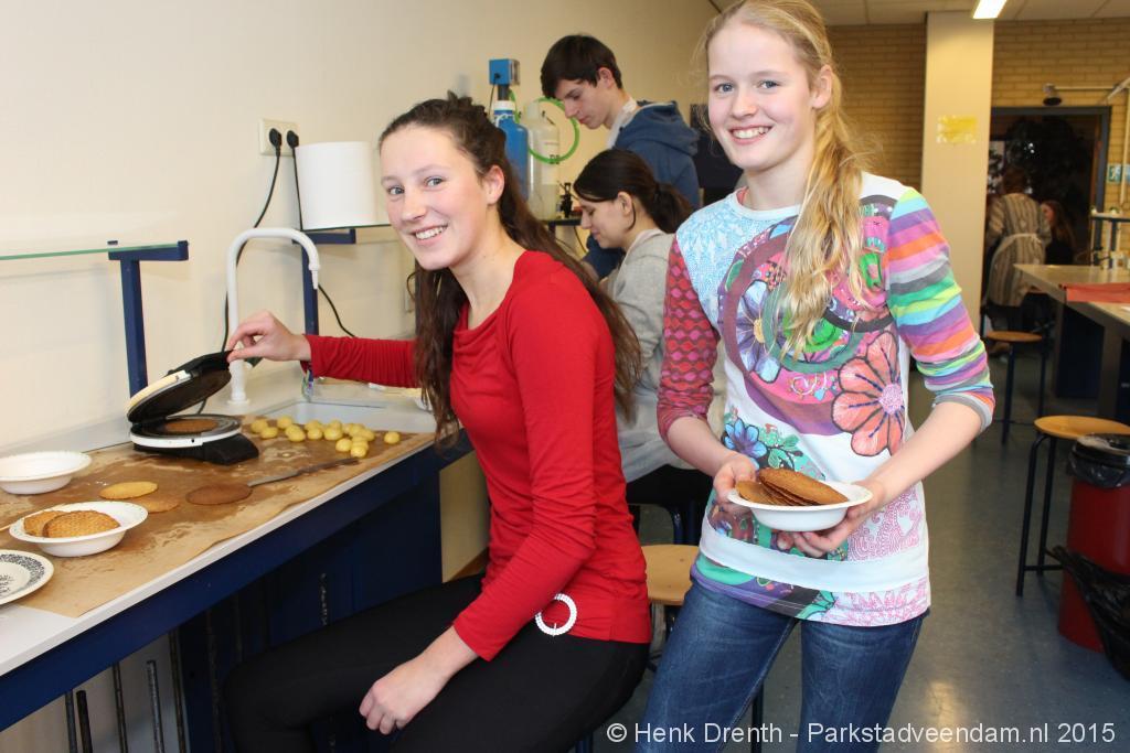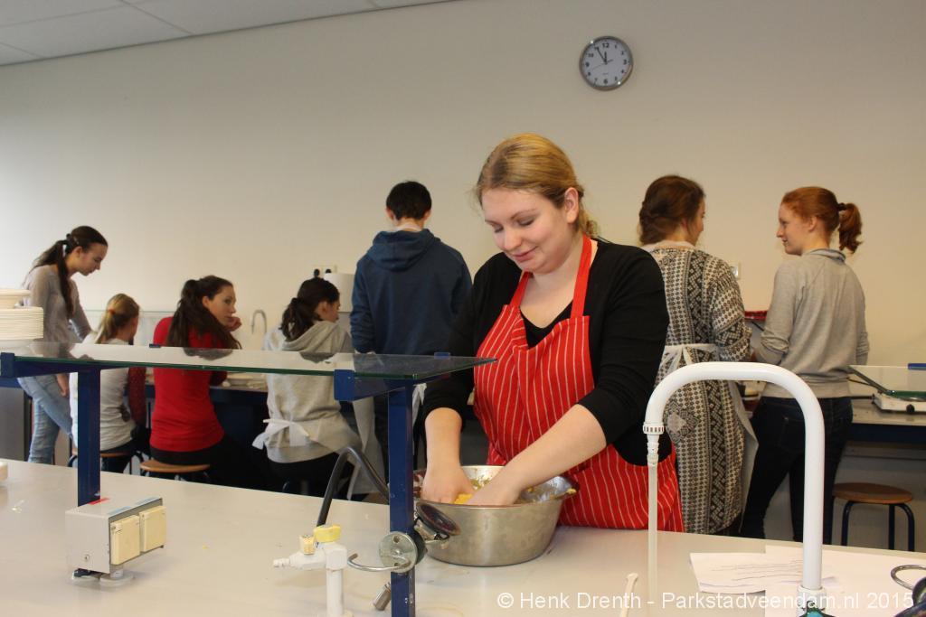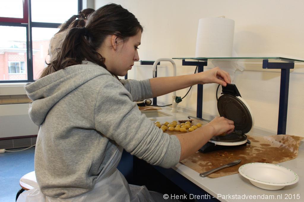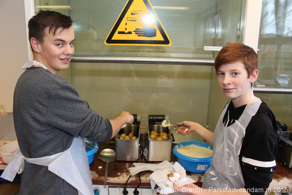 PRAKTICUM - Het scheikundepracticum lokaal van de Winkler Prins locatie Pinksterstraat deed voor één dag weer dienst als praktijkruimte voor het bakken van oliebollen, kniepertjes en het frituren van bitterballen voor een goed doel. De school ondersteunt er ieder jaar een goed doel mee. Ook voor de voedselbank is het al een aantal keren gedaan.