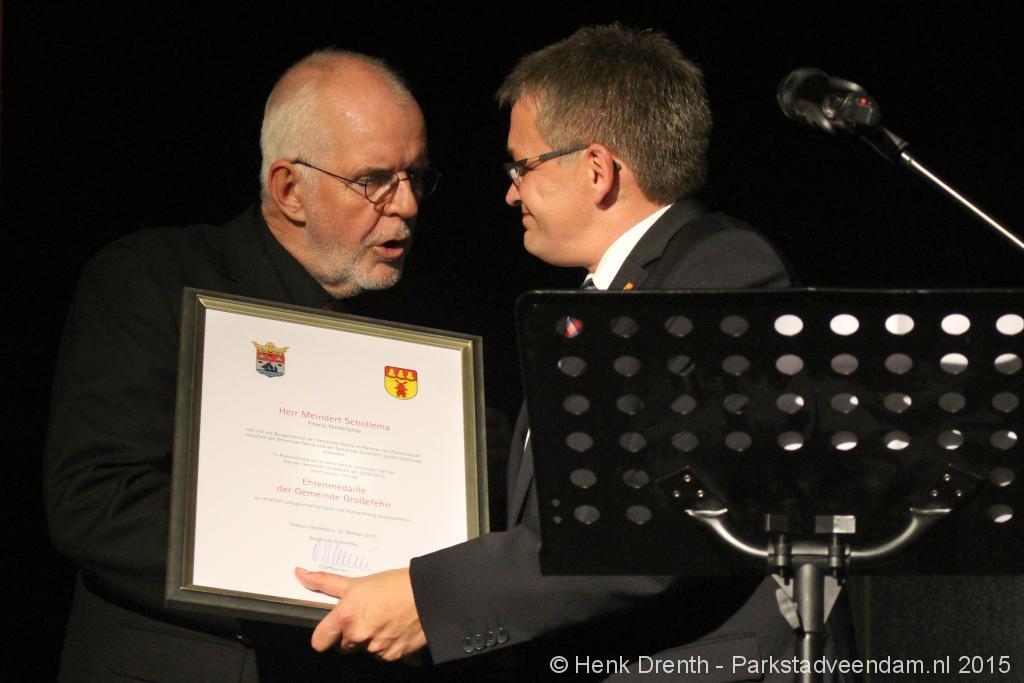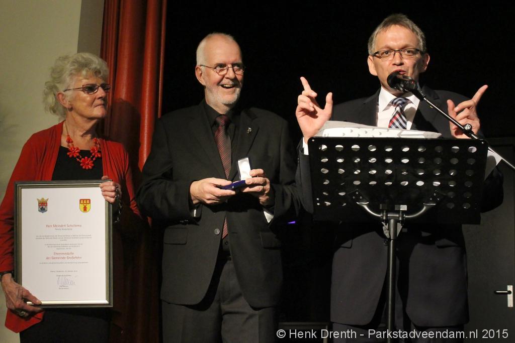 De twee zoons vertelden tijdens hun gezamenlijke speech iets over de geschiedenis van hun ouders. Doorspekt met humor, precies bij hun vader passend. Zoon Bé is wethouder in Loppersum en Pieter directeur in het bedrijfsleven. Burgemeester Sipke Swierstra voerde het woord, en ook oud- CvK Hans Alders sprak de aanwezigen toe. Burgemeester Olaf Meinen van de Duitse partnergemeente Grossfehn verleende burgemeester Schollema de eremedaille van zijn gemeente.