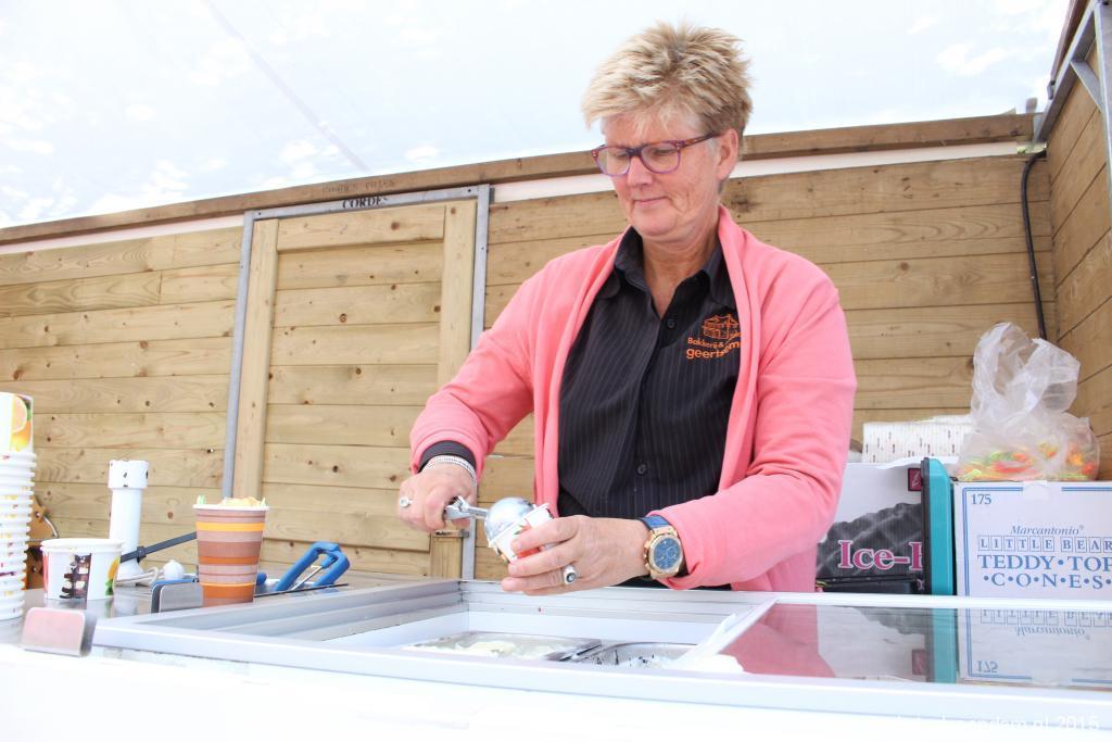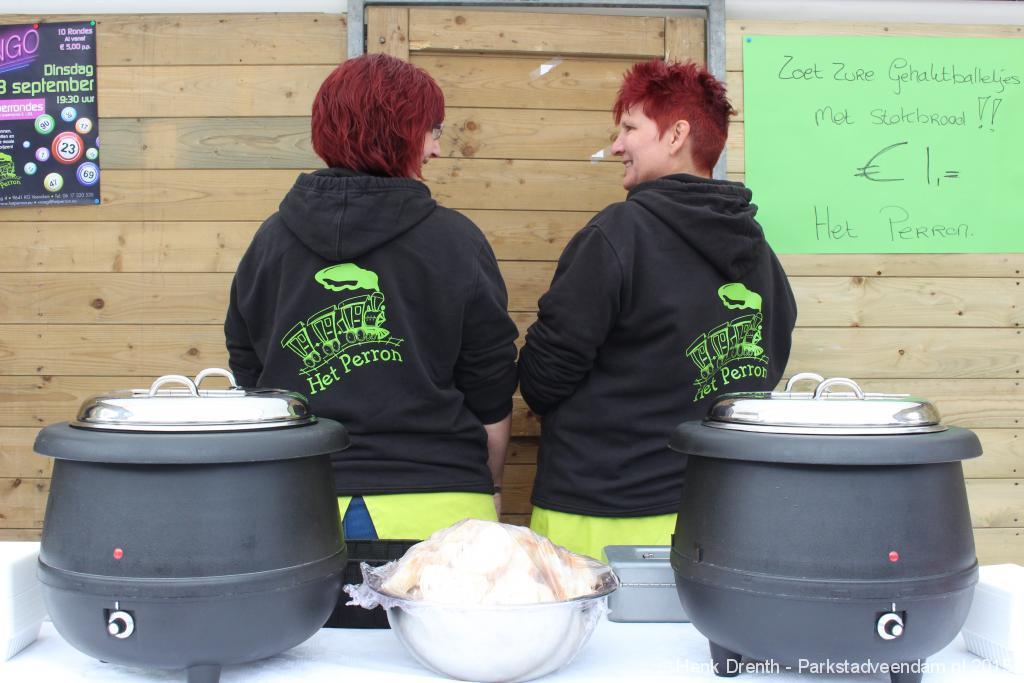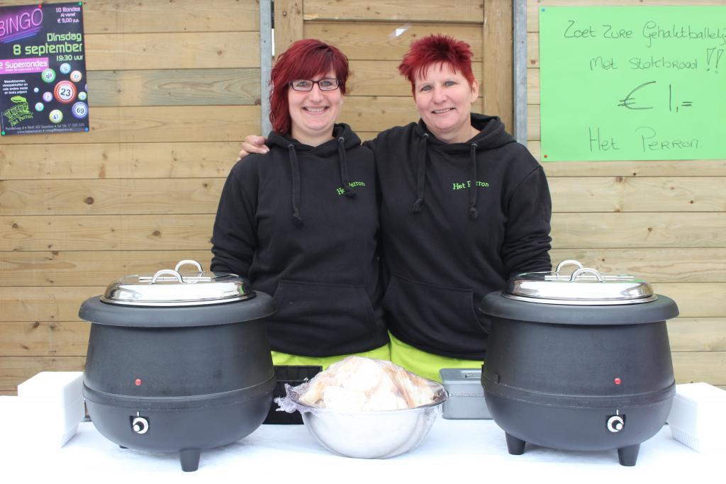Het Perron had zoetzure gehaktballetjes met stokbrood. Vorig jaar was dat voor het eerst, en ze waren gewild. Ze vlogen de pan uit. Gerda Bodde van Het Perron deed wat geheimzinnig over het geheim van het succes. Ze liet niet meer los dan dat er ook uitjes in zaten, wat op het oog waarneembaar was. Ze vertelde dat ze het geheim wel prijs moest geven aan haar medewerkers.