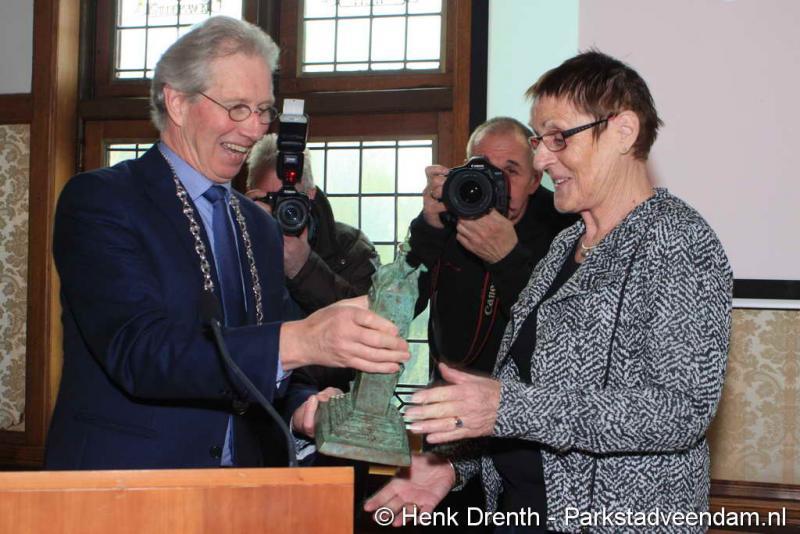 Van burgemeester Swierstra kreeg Ina Wei de Turfdurf toren overhandigd, een bronzen beeld door de kunstenares Christine Chiffrun vervaardigd.