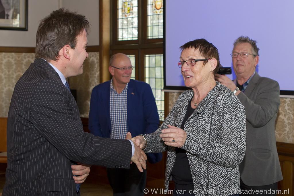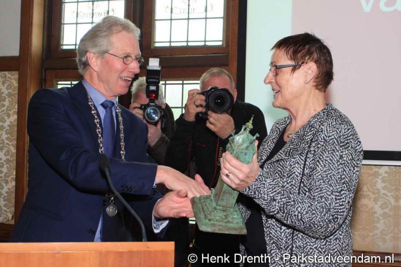 AMBASSADEUR - Ina Wei is voor haar vele vrijwilligerswerk vrijdagmiddag in de Raadszaal onderscheiden met de eretitel Veendammer van het Jaar 2014. De jury, bestaande uit Ankie Beenen, Max Bentum en Bé Wever, waren onder de indruk door haar grote inzet als vrijwilliger in veel diverse activiteiten. Ina is met haar eretitel de opvolger van Bé Wever, die voor het jaar 2013 was verkozen.