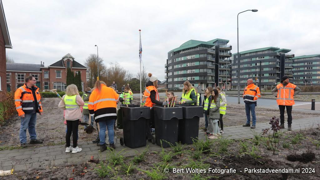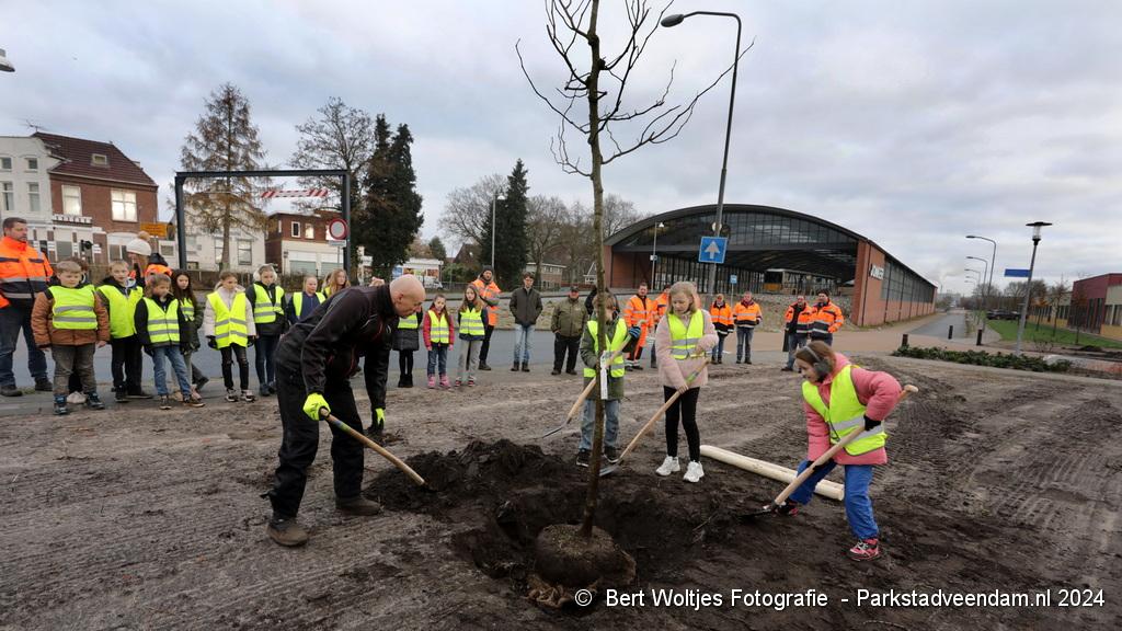 De kinderen van basisschool De Ommewending uit Veendam hebben vrijdag 37 bomen geplant, o.a. berk, kers, hazelaar en den, bij het Lloyd’s Terras in het kader van de jaarlijkse Boomfeestdag. Dit deden ze samen met wethouder Wierenga.