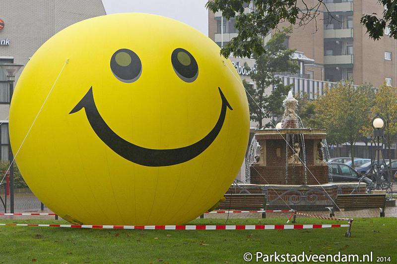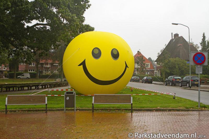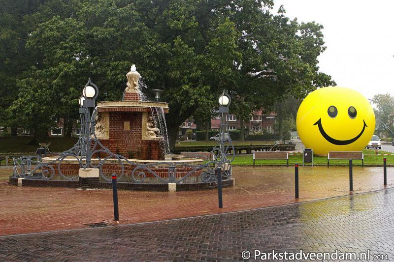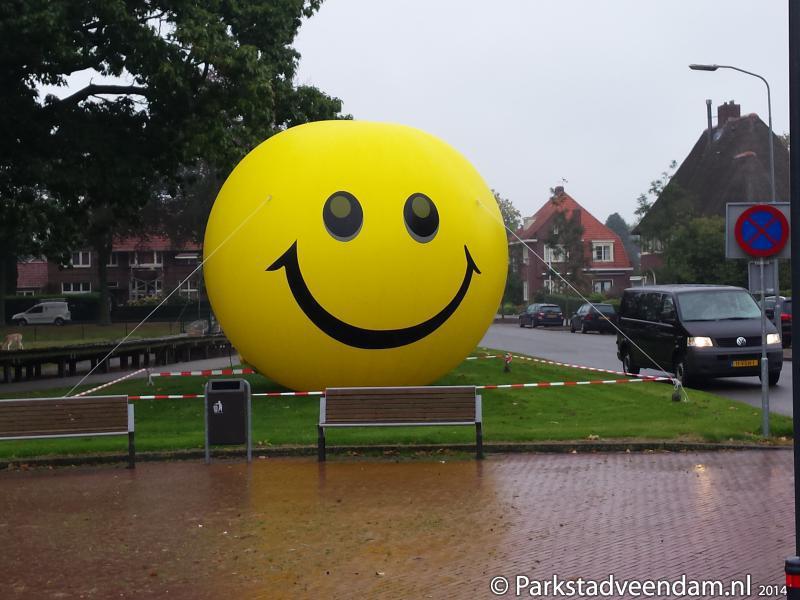 VROLIJK - In het centrum van Veendam staat een knalgele smiley. Niemand weet waar deze smiley vandaan komt en waar het voor staat! Gisteren dook de smiley ook al op in het centrum van Gieten.
