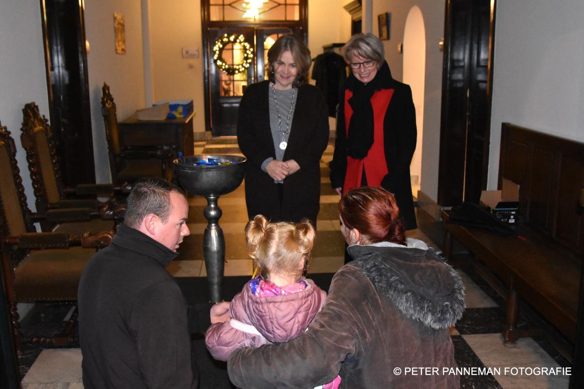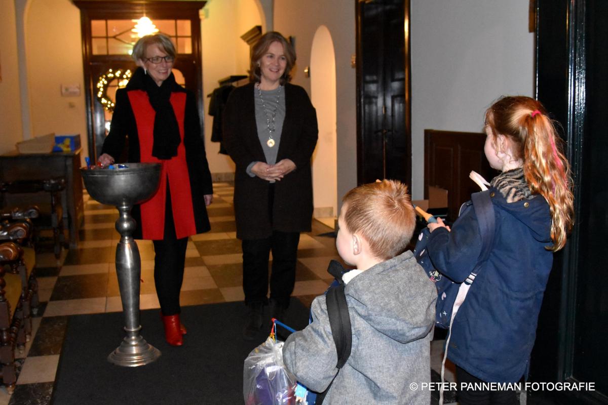 Kinderen met een lampion kregen een warm welkom op deze gure Sint-Maarten en na het zingen van een liedje wat lekkers mee van burgemeester Annelies Pleyte en wethouder Ans Grimbergen.