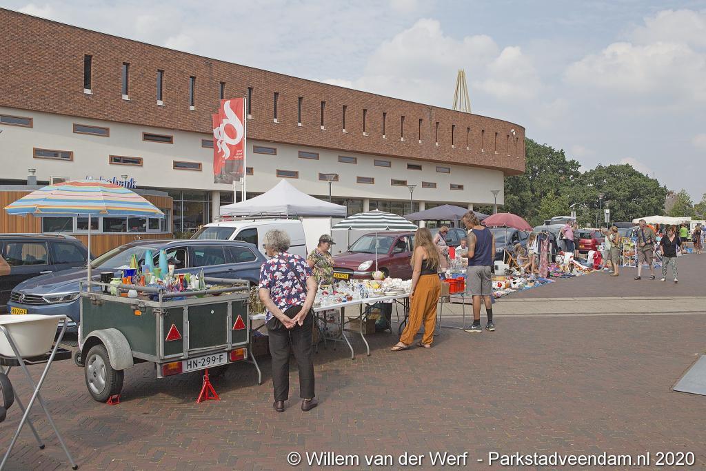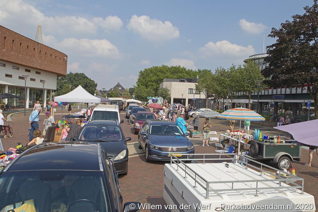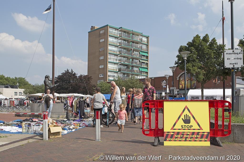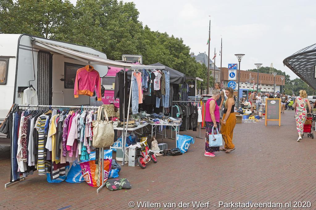 Zondag was de eerste activiteit in centrum Veendam sinds de uitbraak van het coronavirus in maart. Er stonden 25 kofferbakkramen op het Museumplein. Door de matige drukte was de eenrichtingroute met de 1,5 meter goed haalbaar.