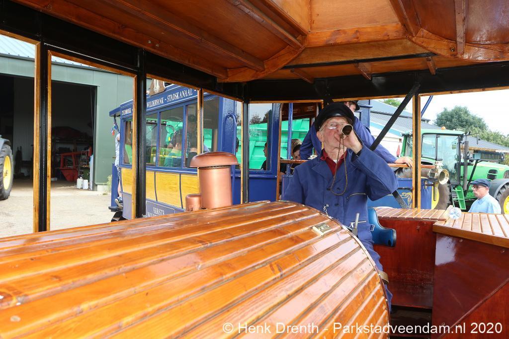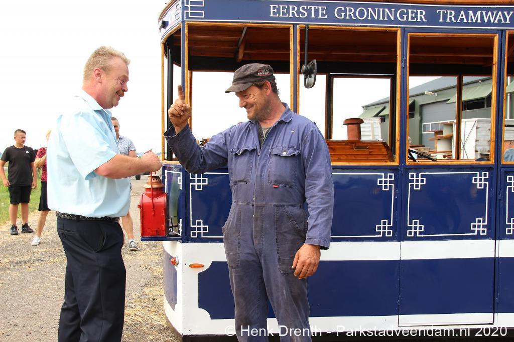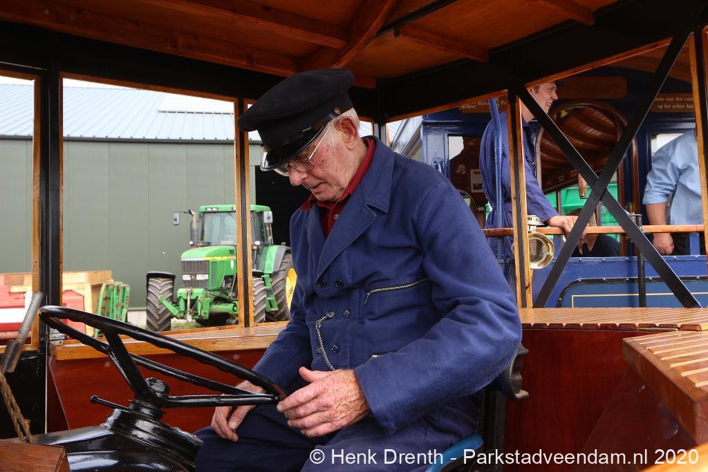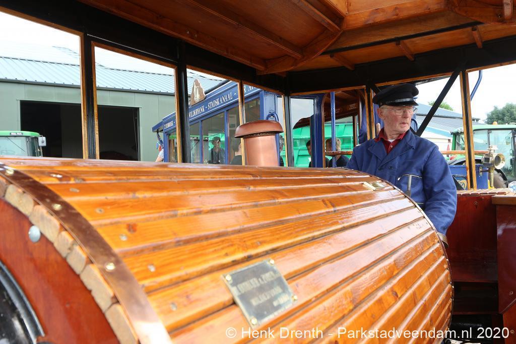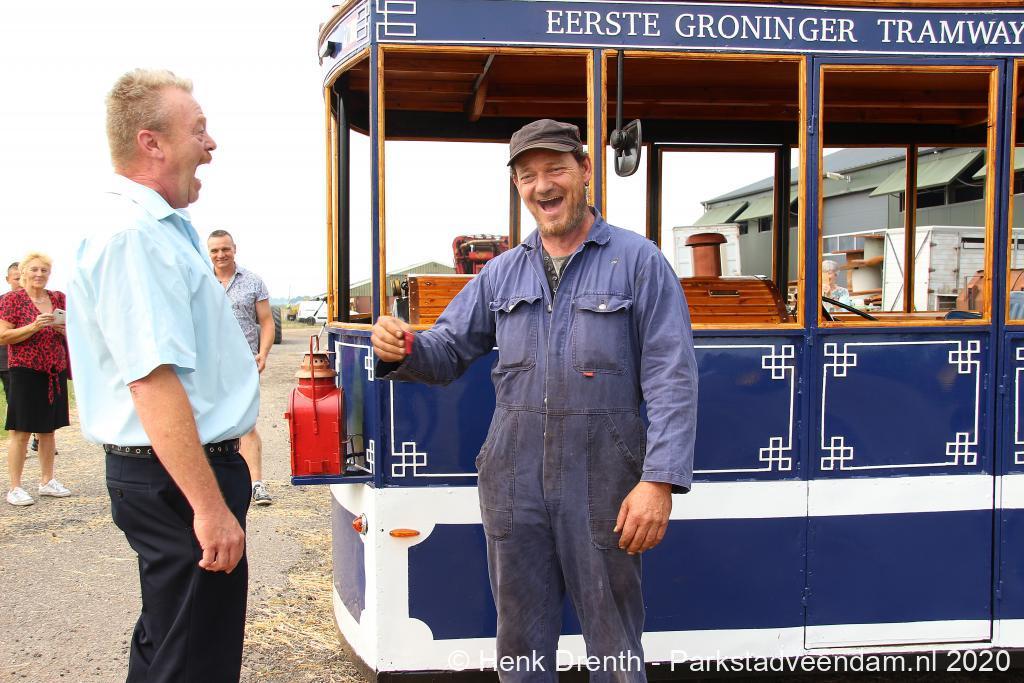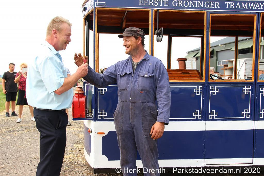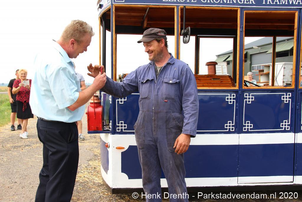 Met aan weerszijden van de grote deur door twee imposante landbouwmachines geflankeerd reed Jan Stevens de loc, met daarachter de paardentram, langzaam naar buiten. Hij zette de loc in een schuine bocht voor Jaap de Weijs. Er was eerst nog een rol voor machinist Peter Puister. Aan hem overhandigde Stevens de sleutel van de gereviseerde stoomloc.